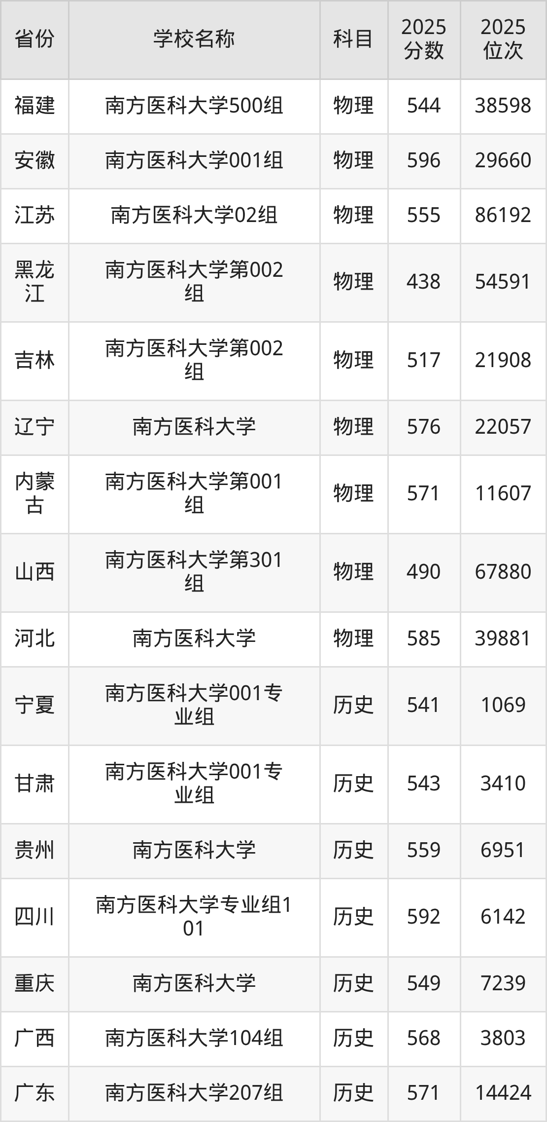 二、南方医科大学各专业录取分数线