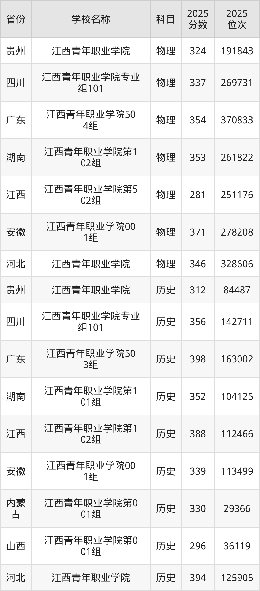 再看江西高考2025年专科批次线,历史类是290分、物理类是240分。通过对比发现:江西青年职业学院2025年历史类最低分比专科线高98分,物理类最低分比专科线高41分。2026届江西高考生,可通过每一次模考划线,来判断自己的成绩是否有机会被江西青年职业学院录取。