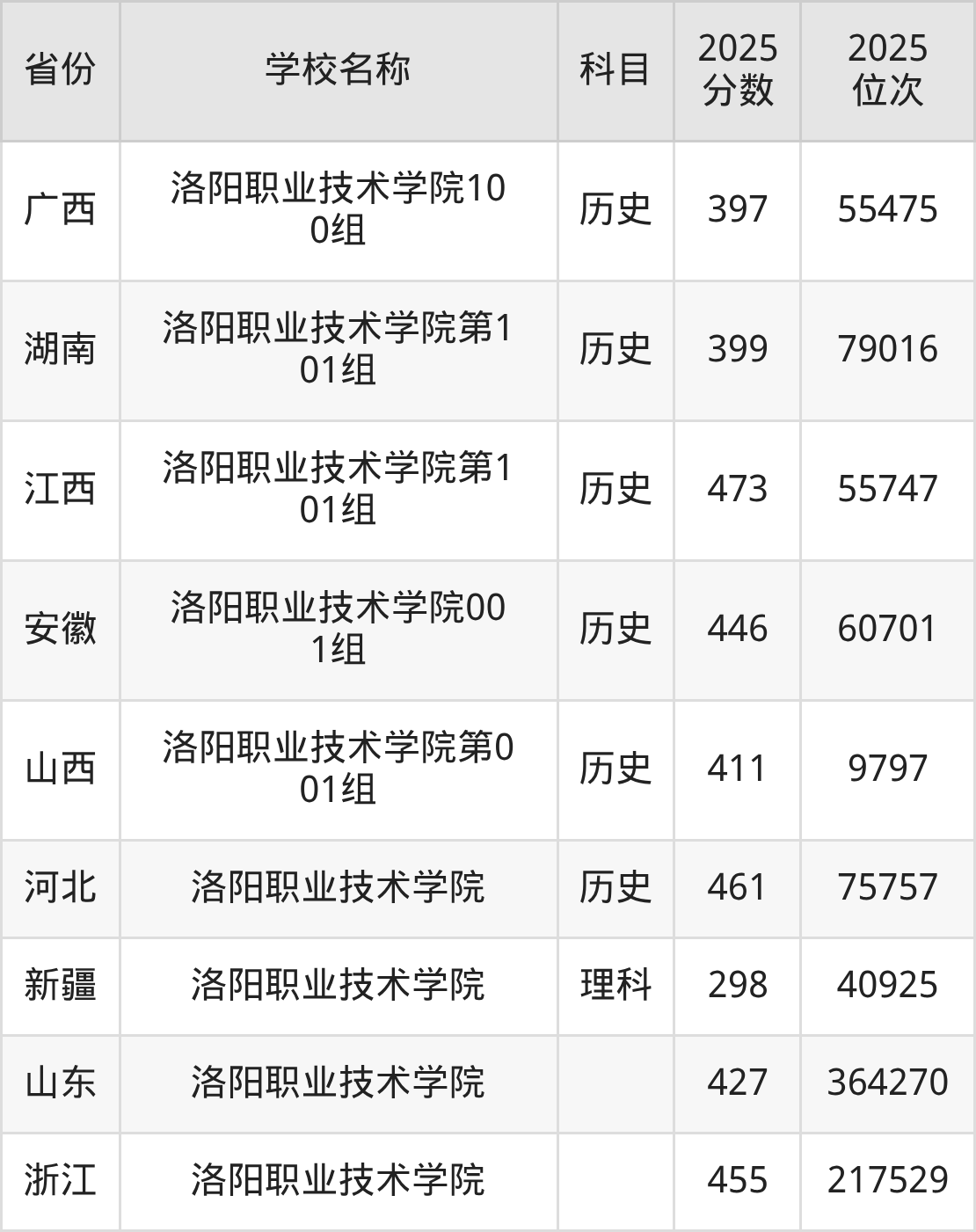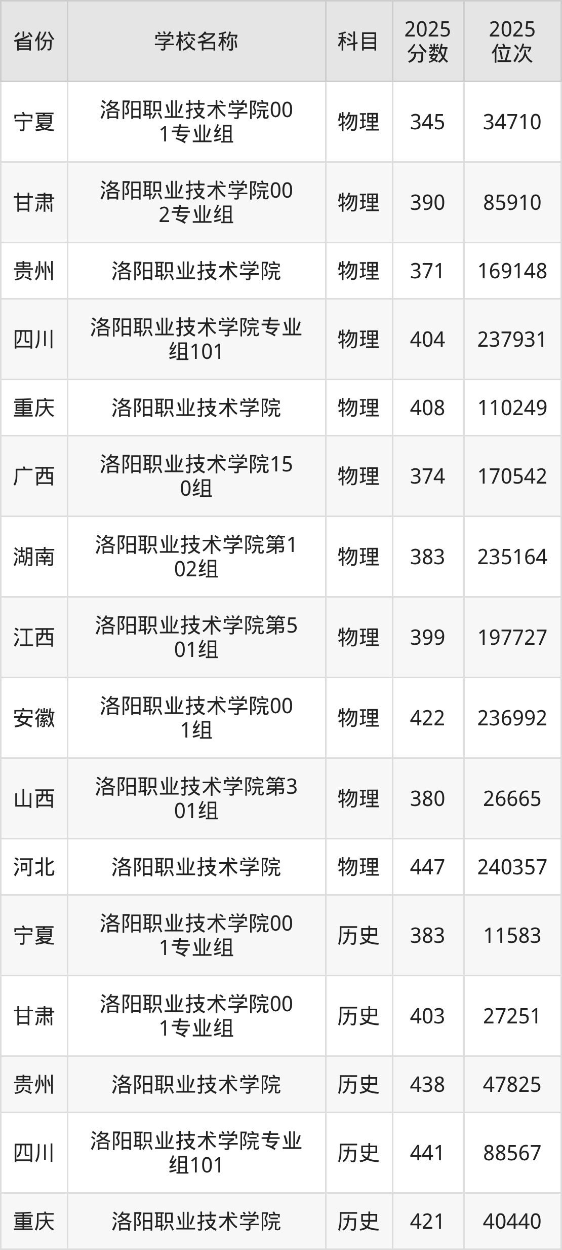 二、洛阳职业技术学院各专业录取分数线