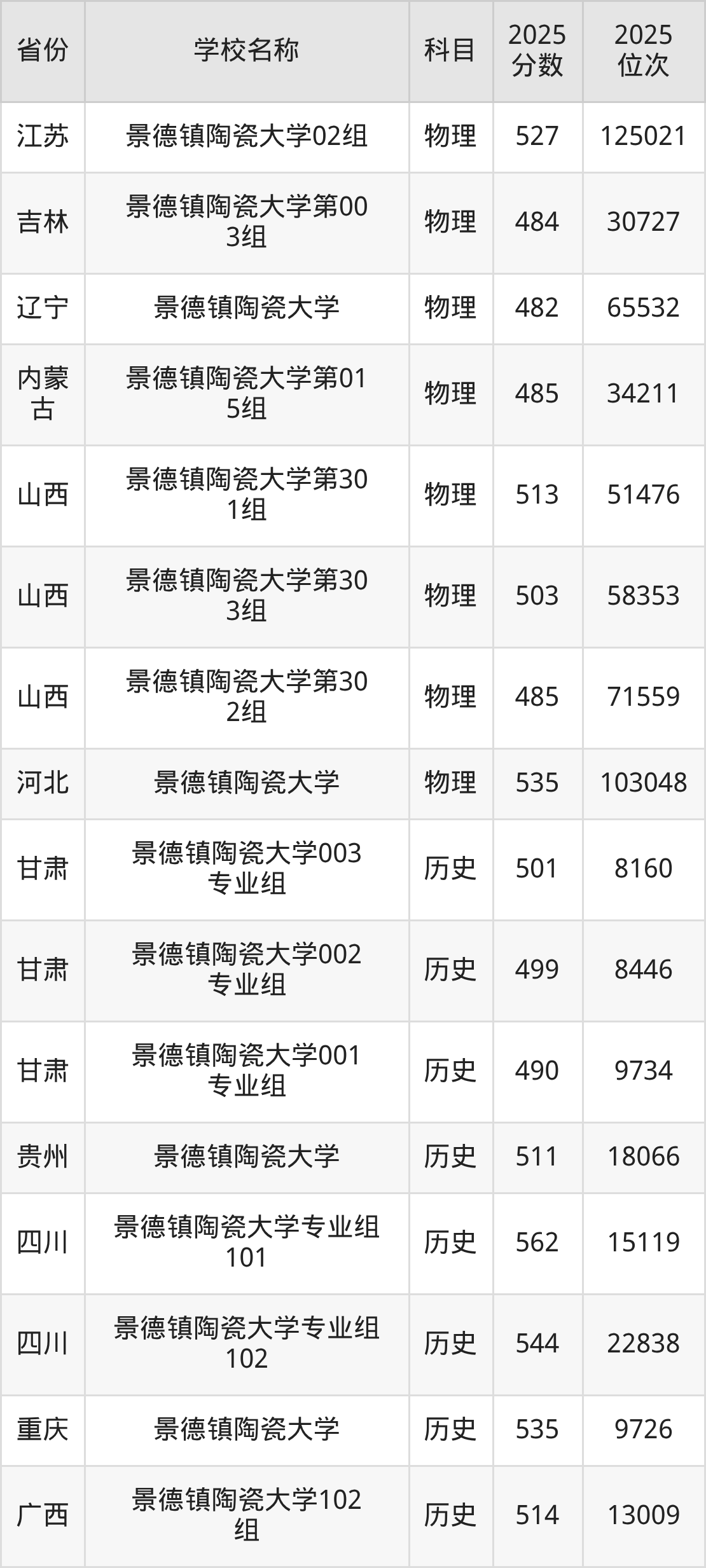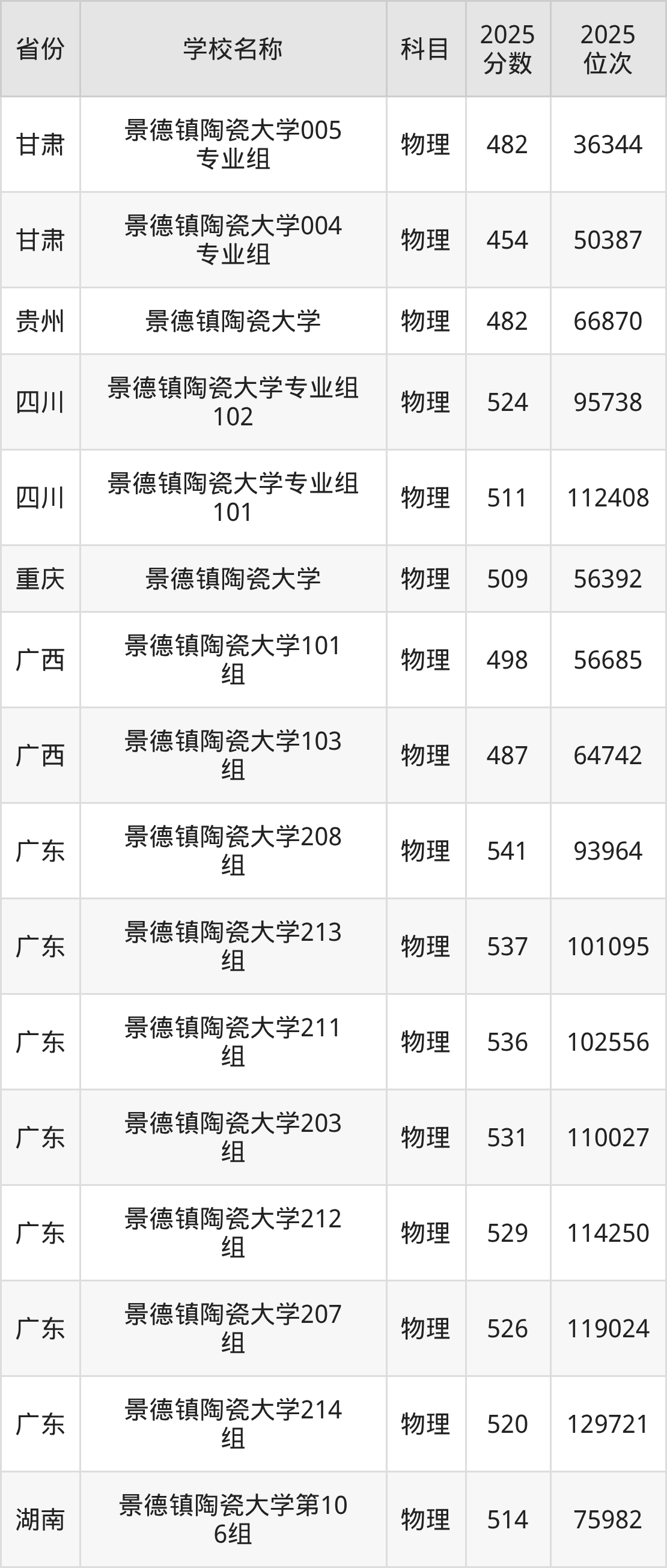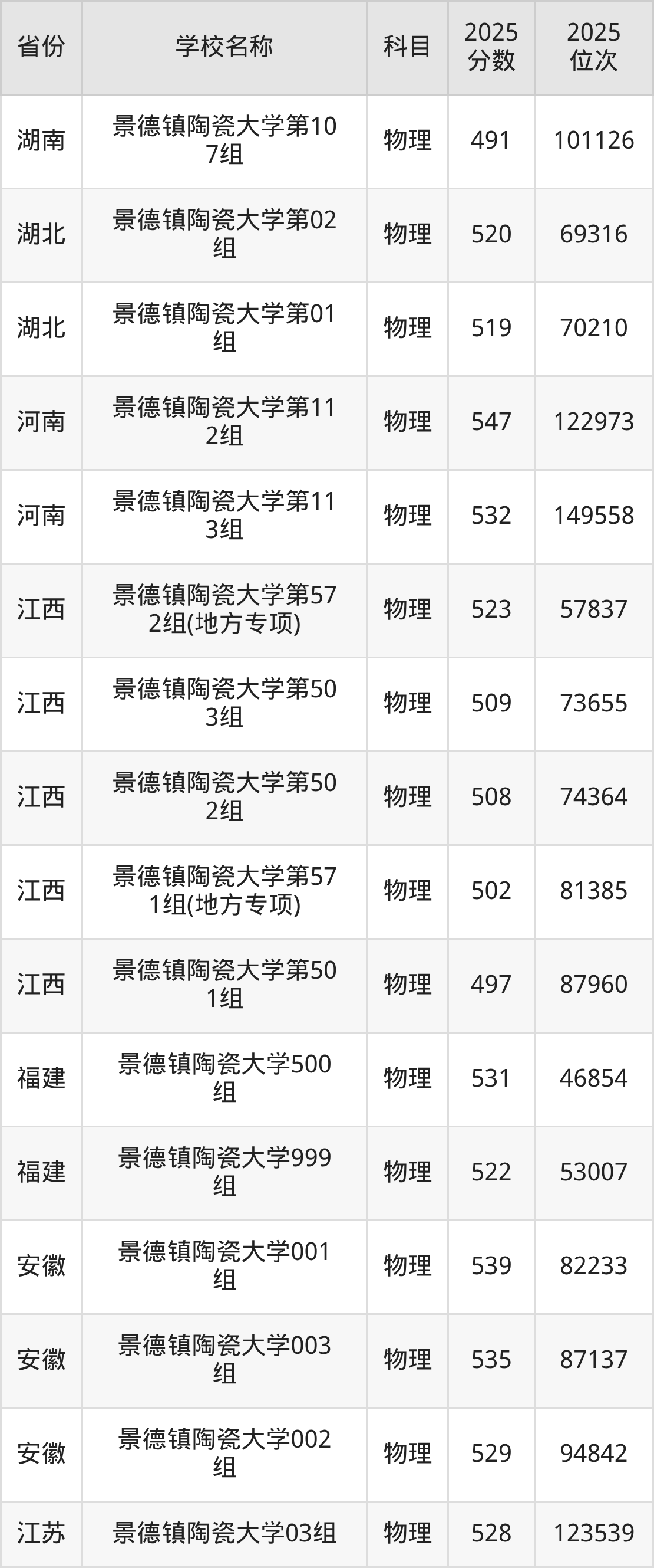 景德镇陶瓷大学2025年有5个专业组面向江西省内首选了物理科目的考生招生: