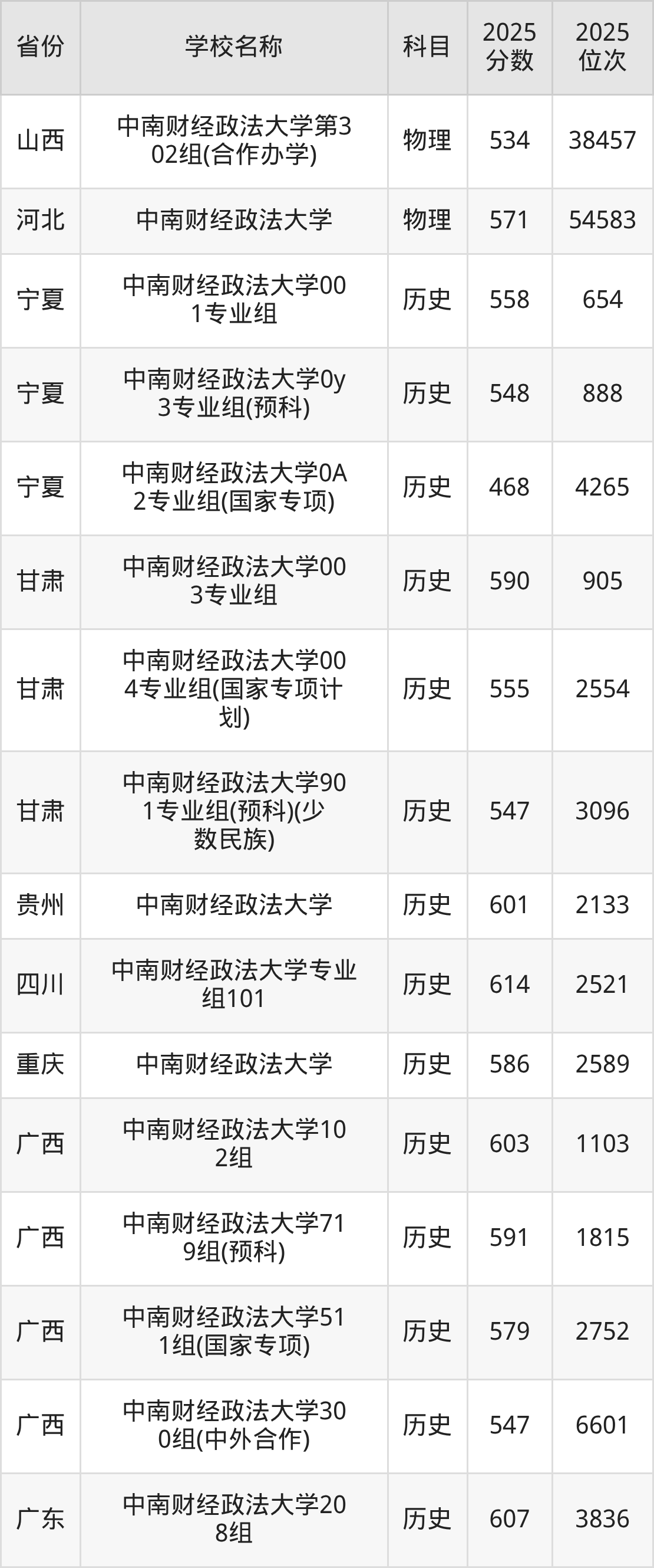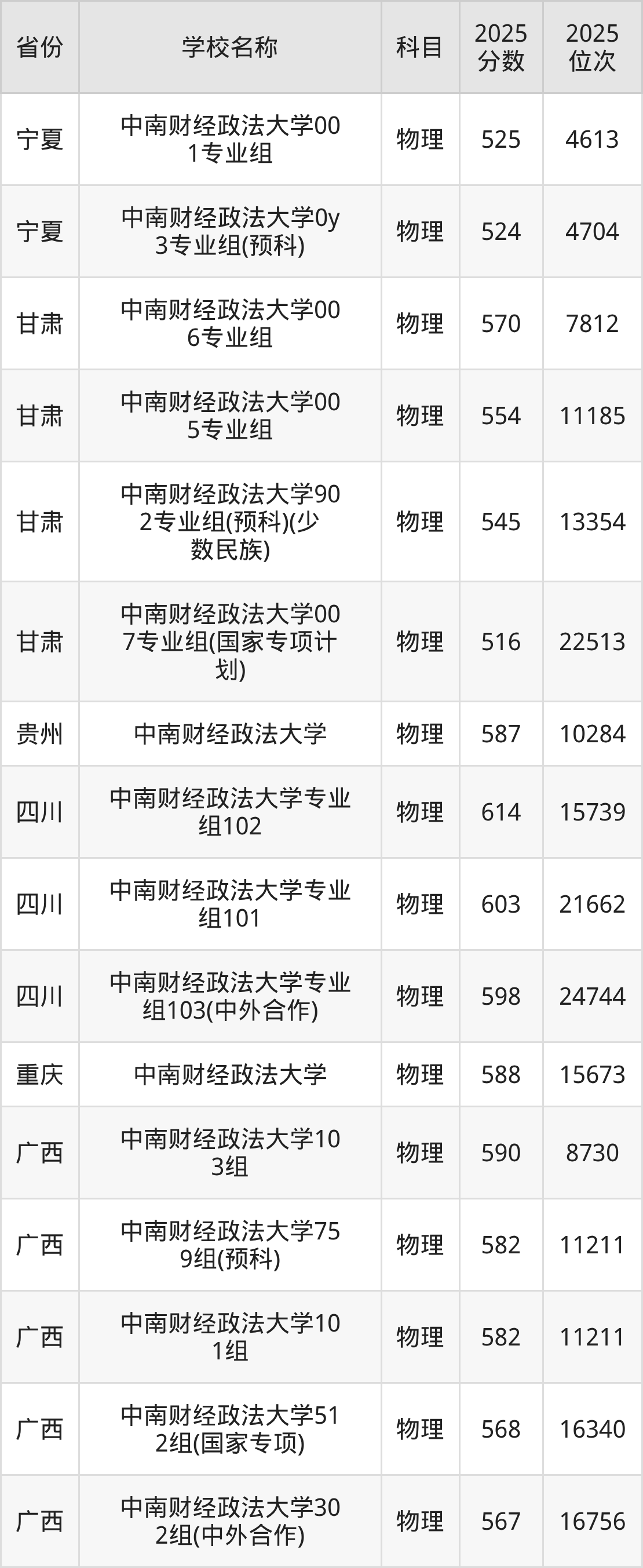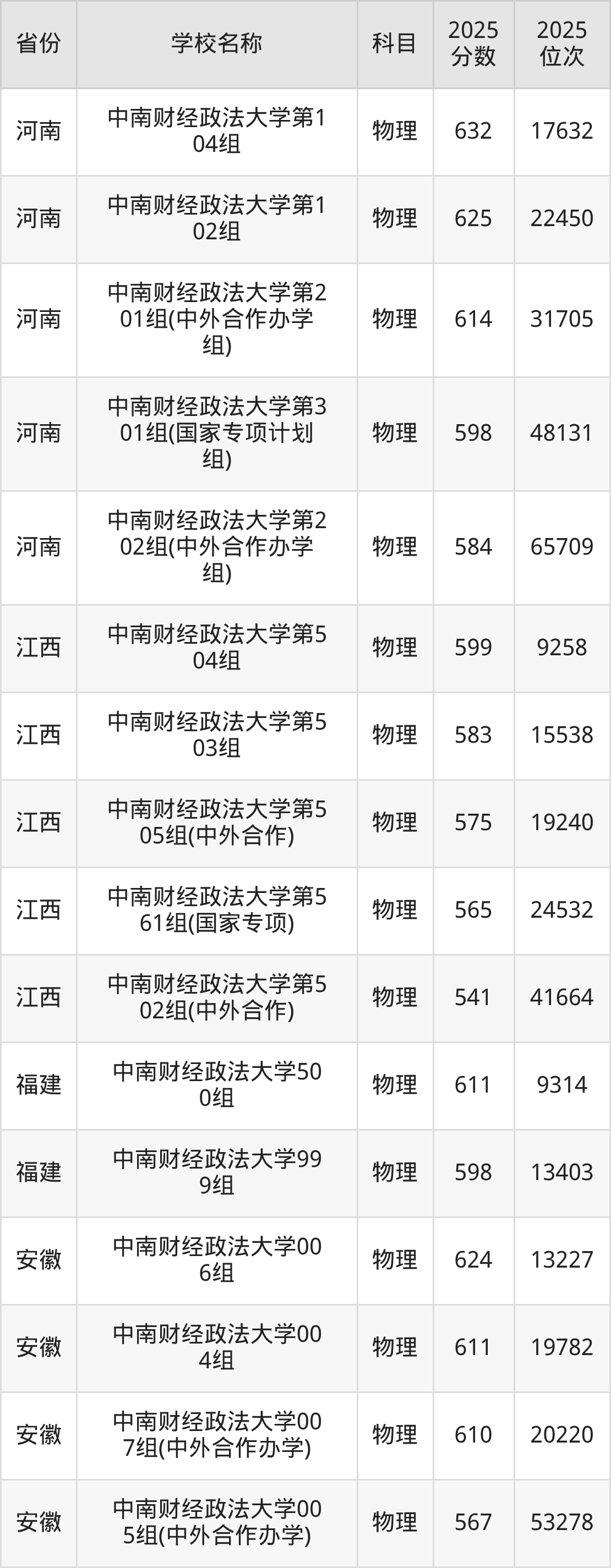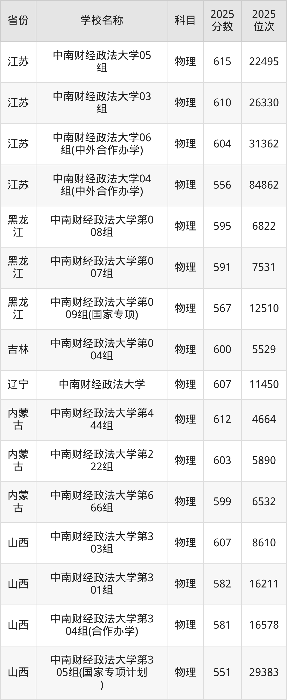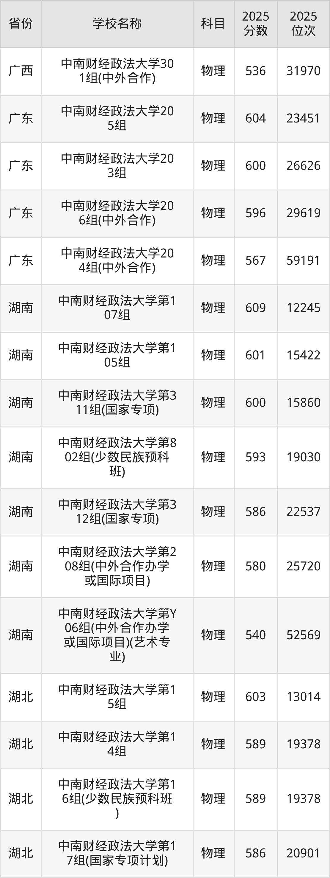 中南财经政法大学2025年有8个专业组面向湖北省内首选了物理科目的考生招生: