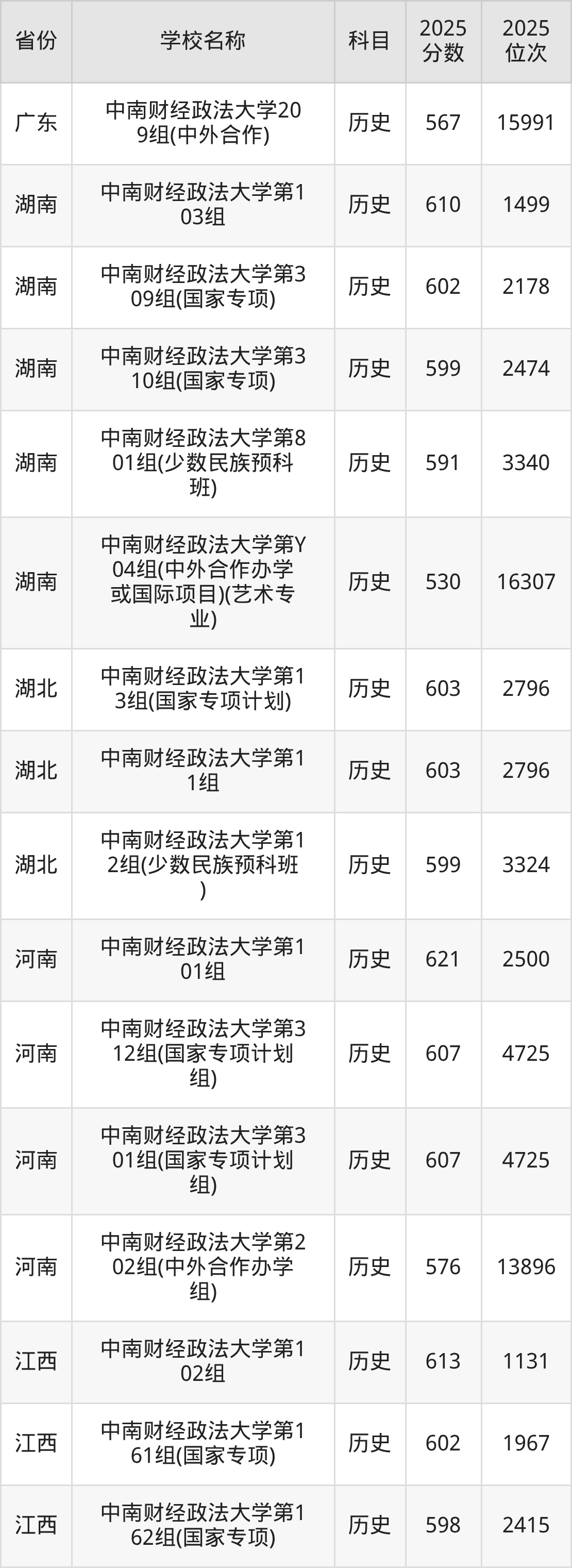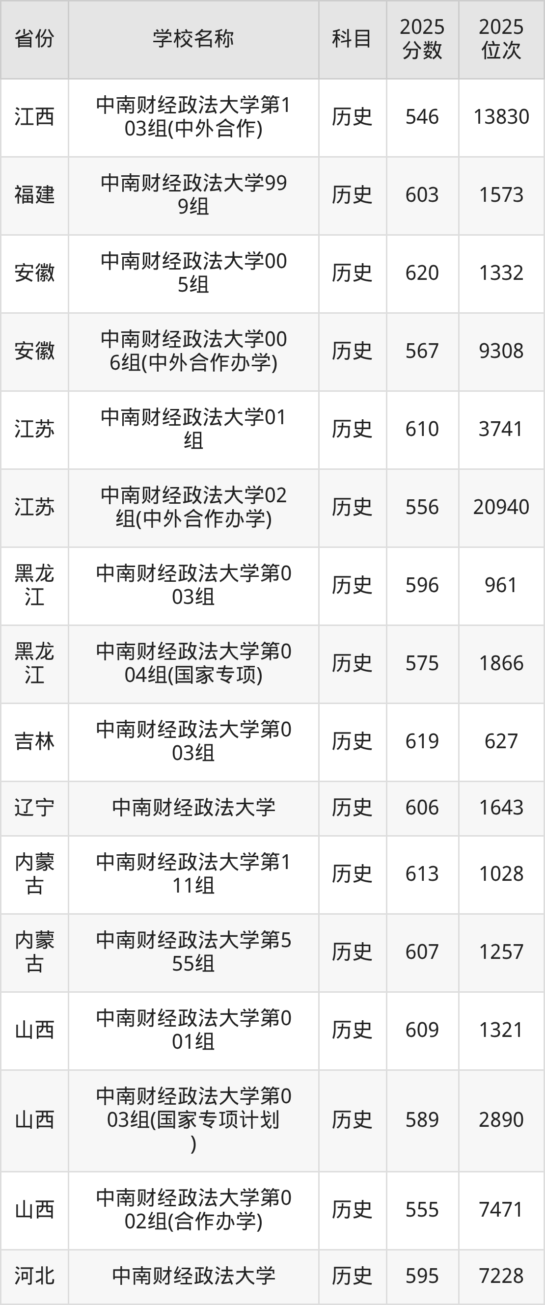 中南财经政法大学2025年有7个专业组面向湖北省内首选了历史科目的考生招生: