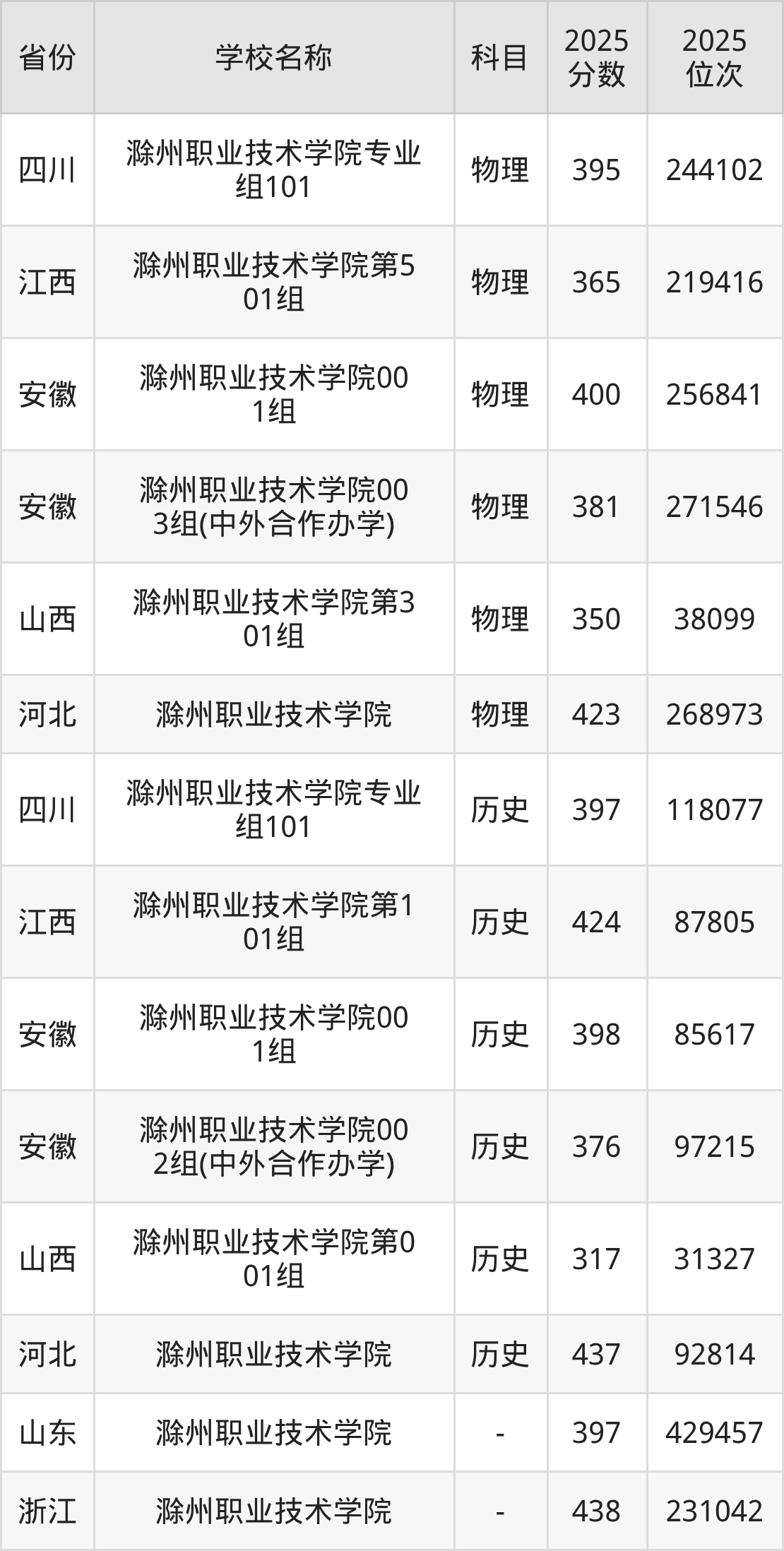 一、2025滁州职业技术学院录取分数线