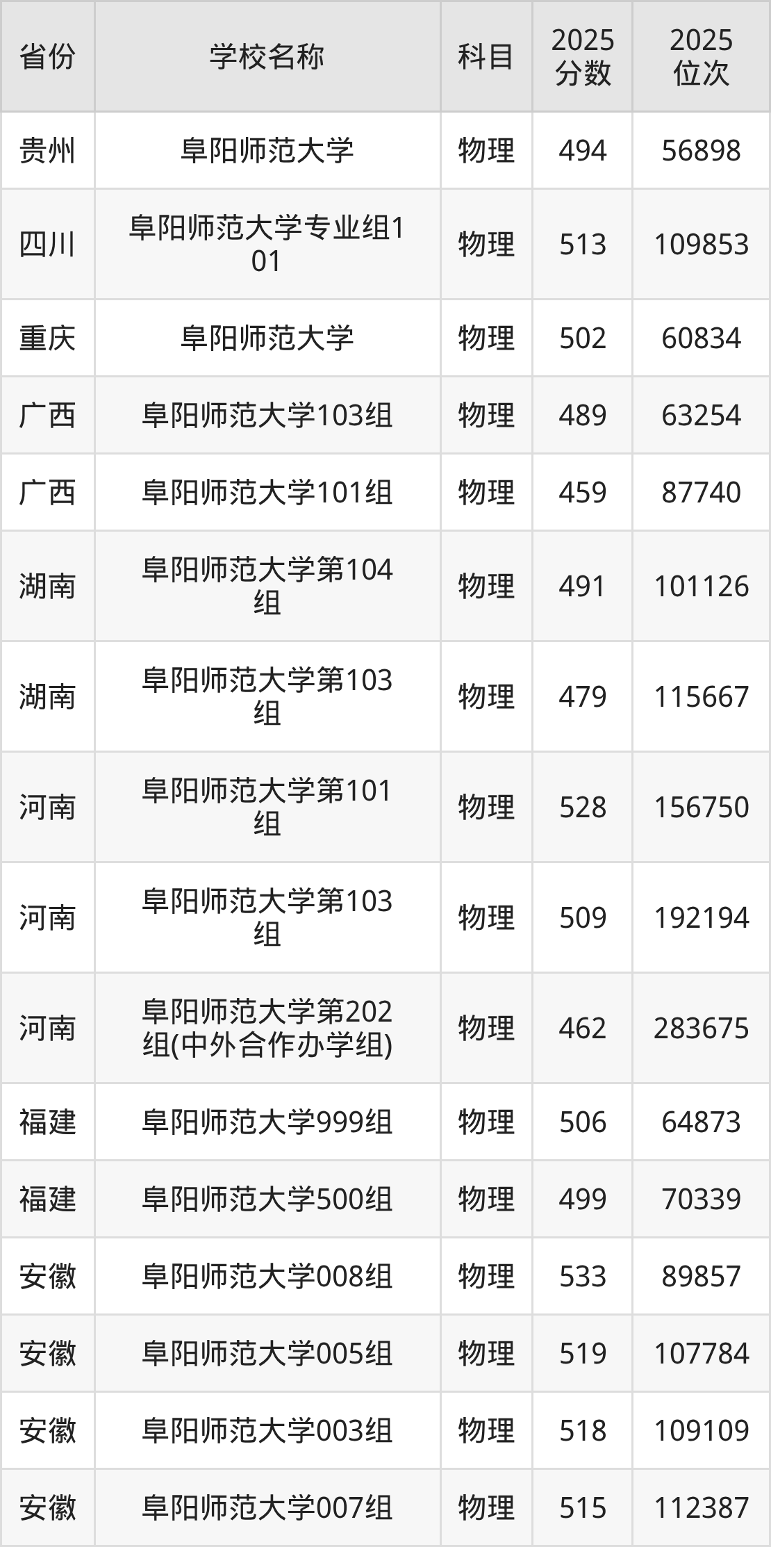 阜阳师范大学2025年有6个专业组面向安徽省内首选了物理科目的考生招生: