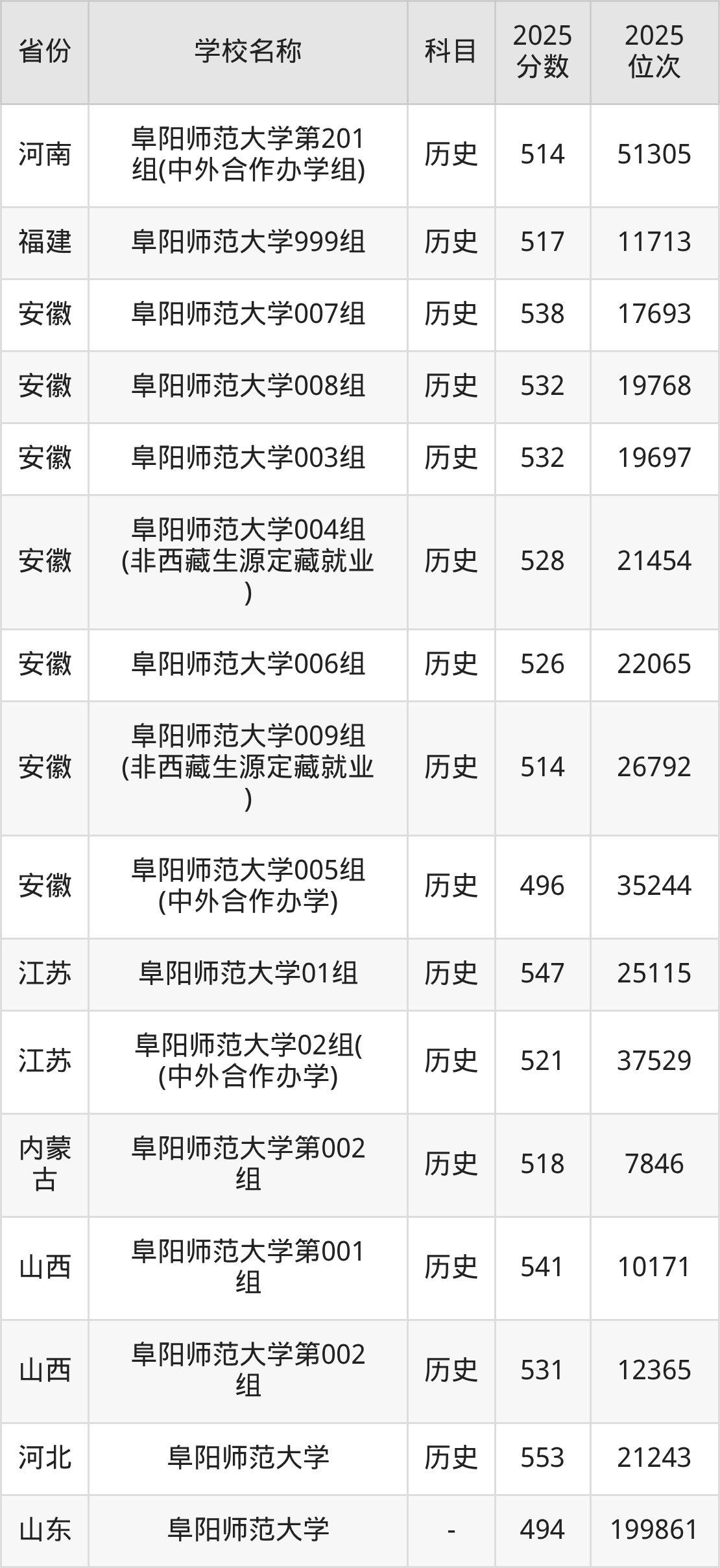 阜阳师范大学2025年有7个专业组面向安徽省内首选了历史科目的考生招生: