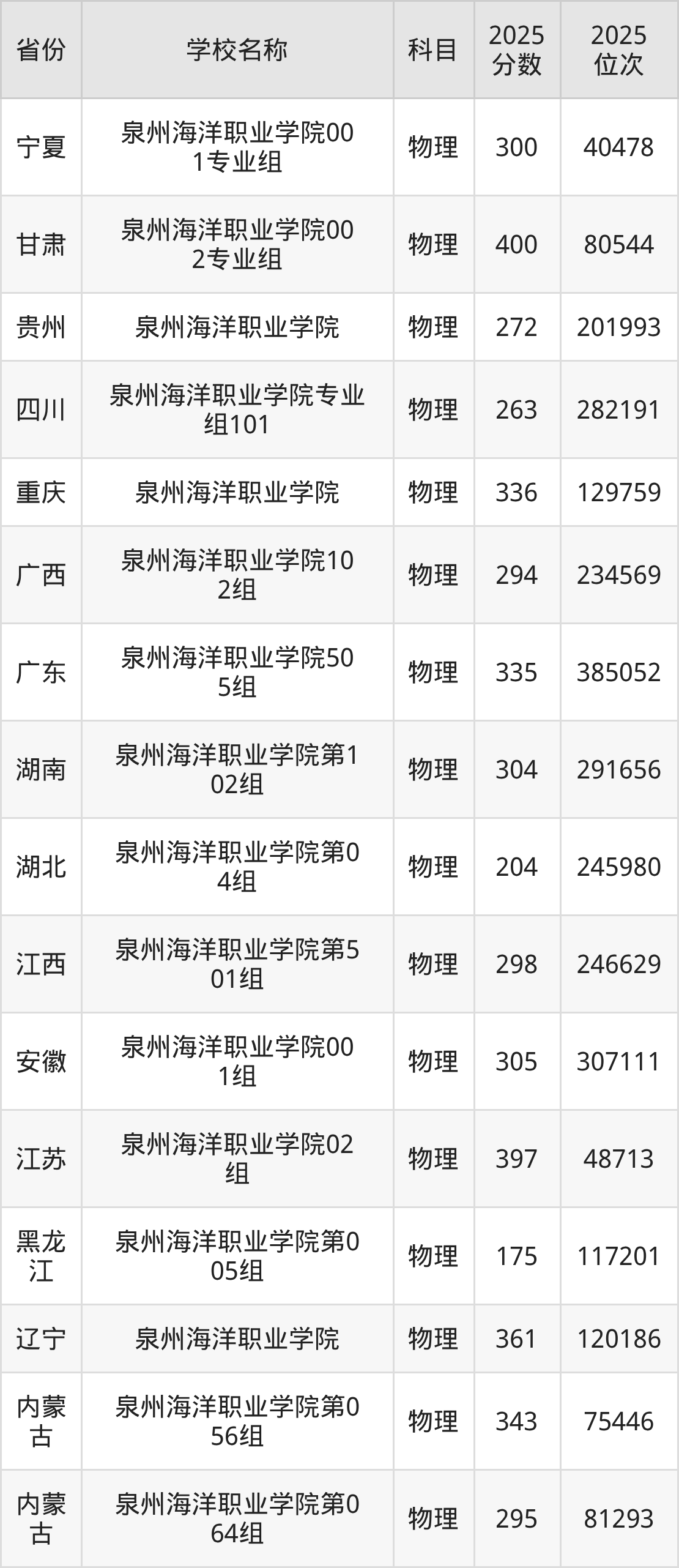 2025年泉州海洋职业学院在全国各省专科的最低录取分数线在172~400分之间。甘肃物理类高考生最低400分能上泉州海洋职业学院、江苏物理类高考生最低397分能上泉州海洋职业学院……下文将展示泉州海洋职业学院在全国18个高考省份中的专科最低投档录取分汇总!