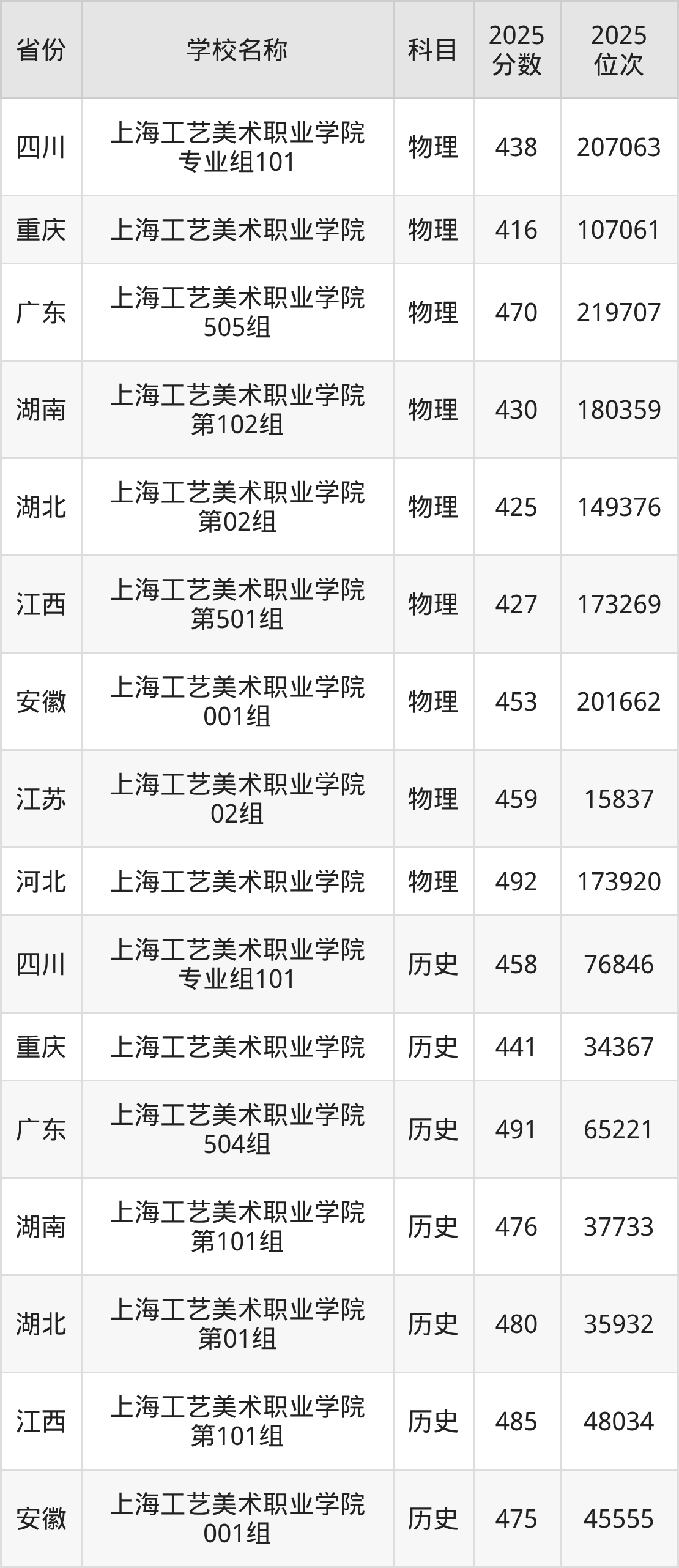 2025年上海工艺美术职业学院在全国各省专科的最低录取分数线在416~492分之间。河北物理类高考生最低492分能上上海工艺美术职业学院、广东物理类高考生最低470分能上上海工艺美术职业学院……下文将展示上海工艺美术职业学院在全国10个高考省份中的专科最低投档录取分汇总!
