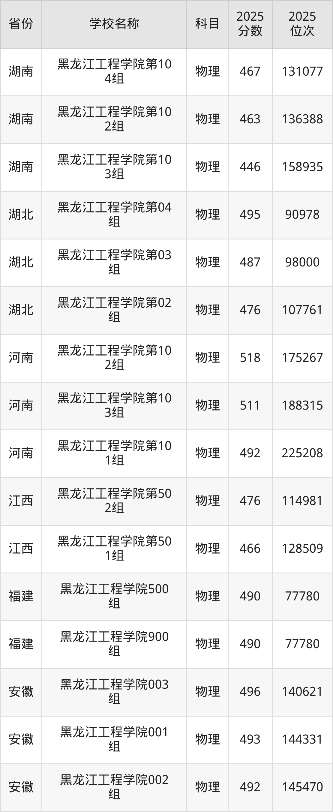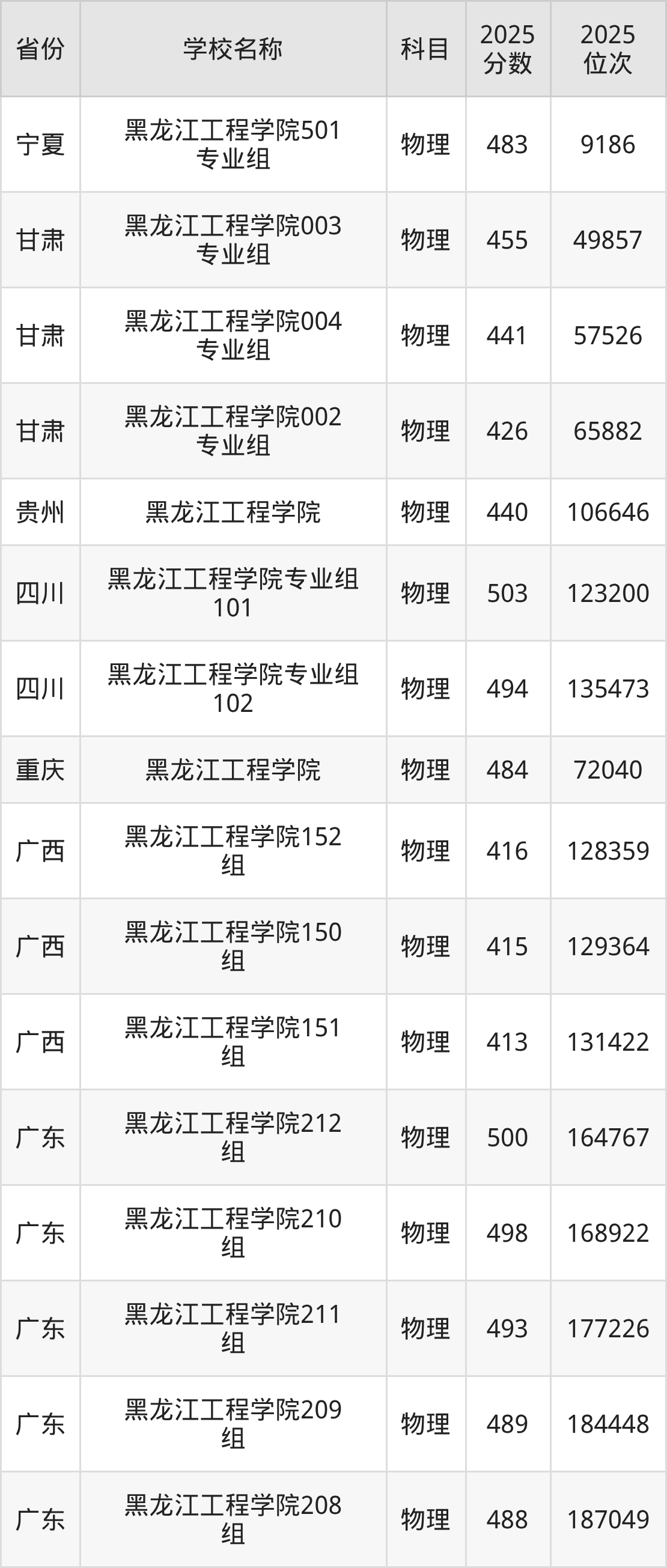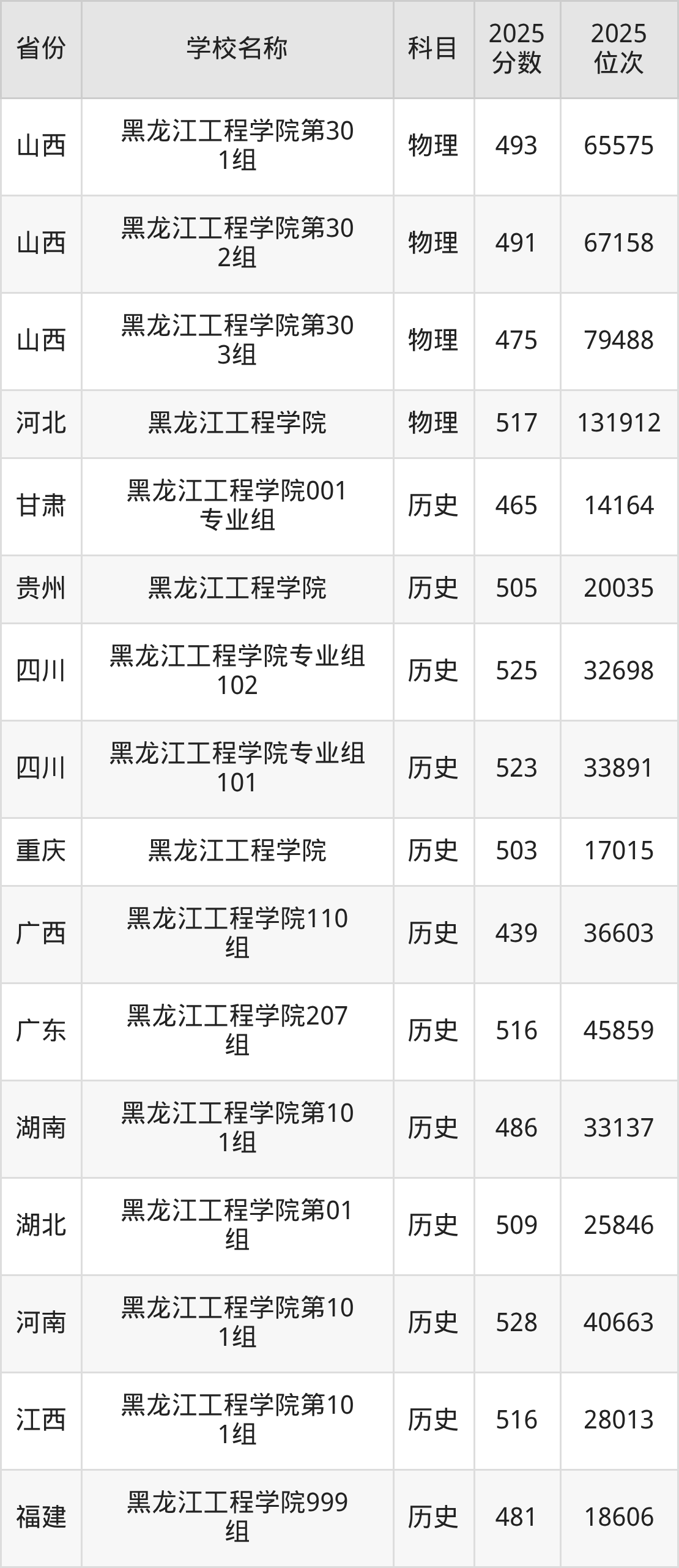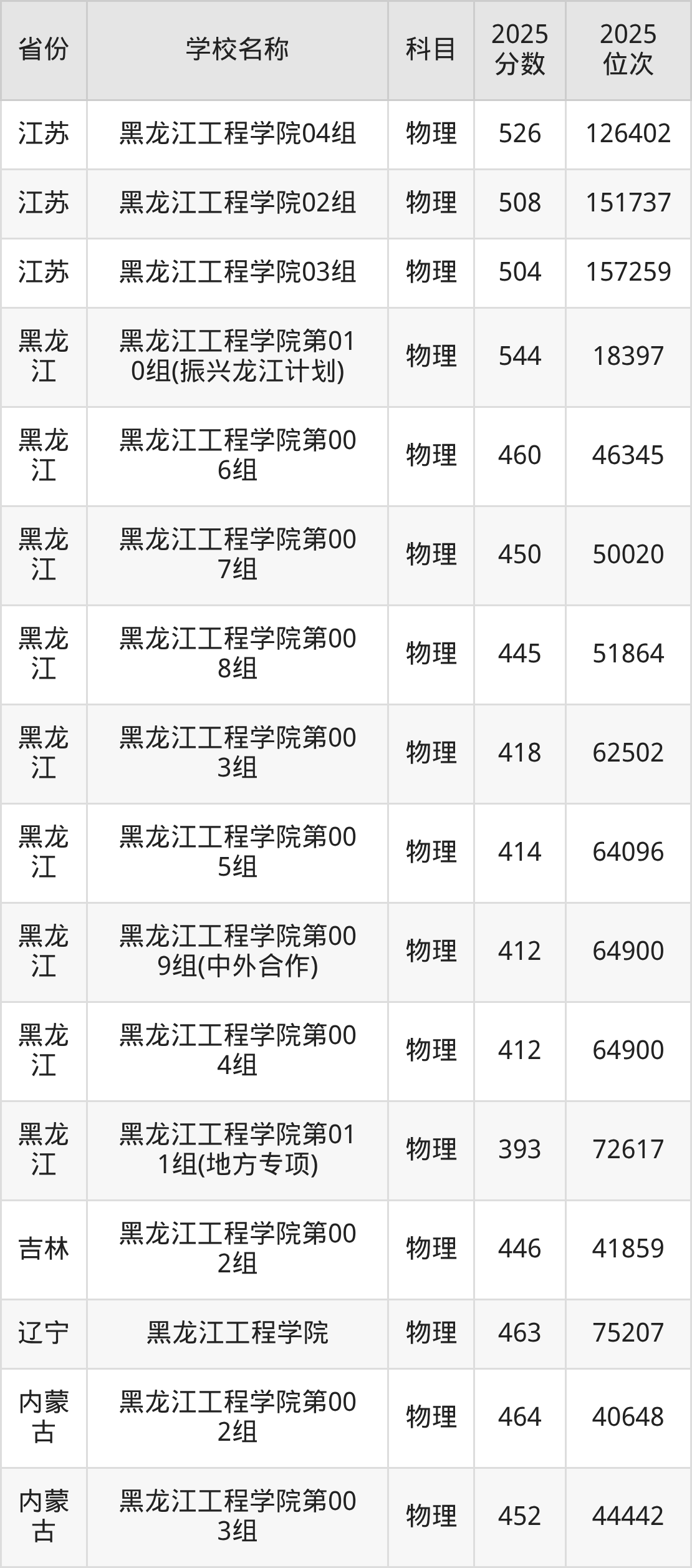 二、黑龙江工程学院各专业录取分数线