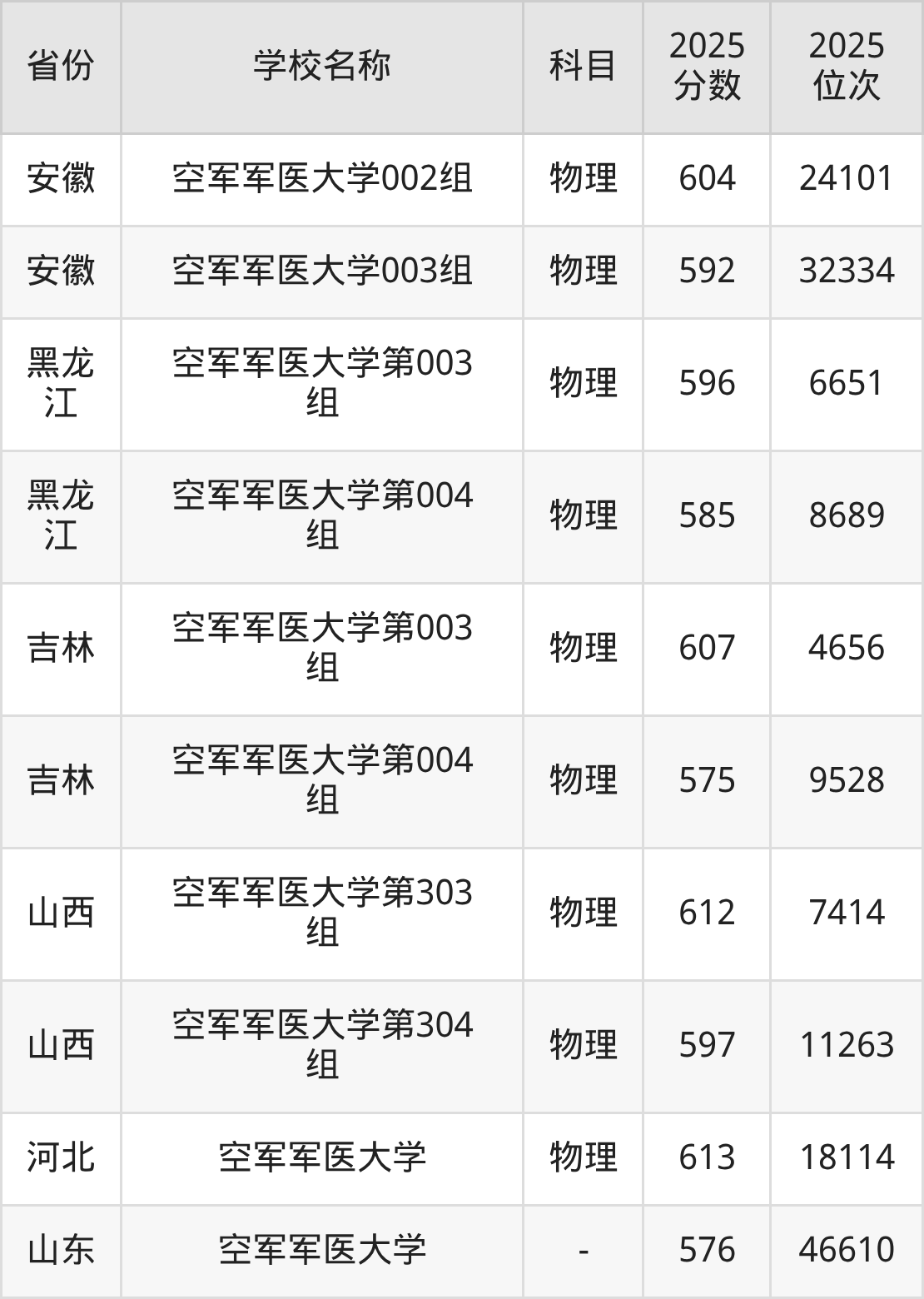 一、2025空军军医大学录取分数线