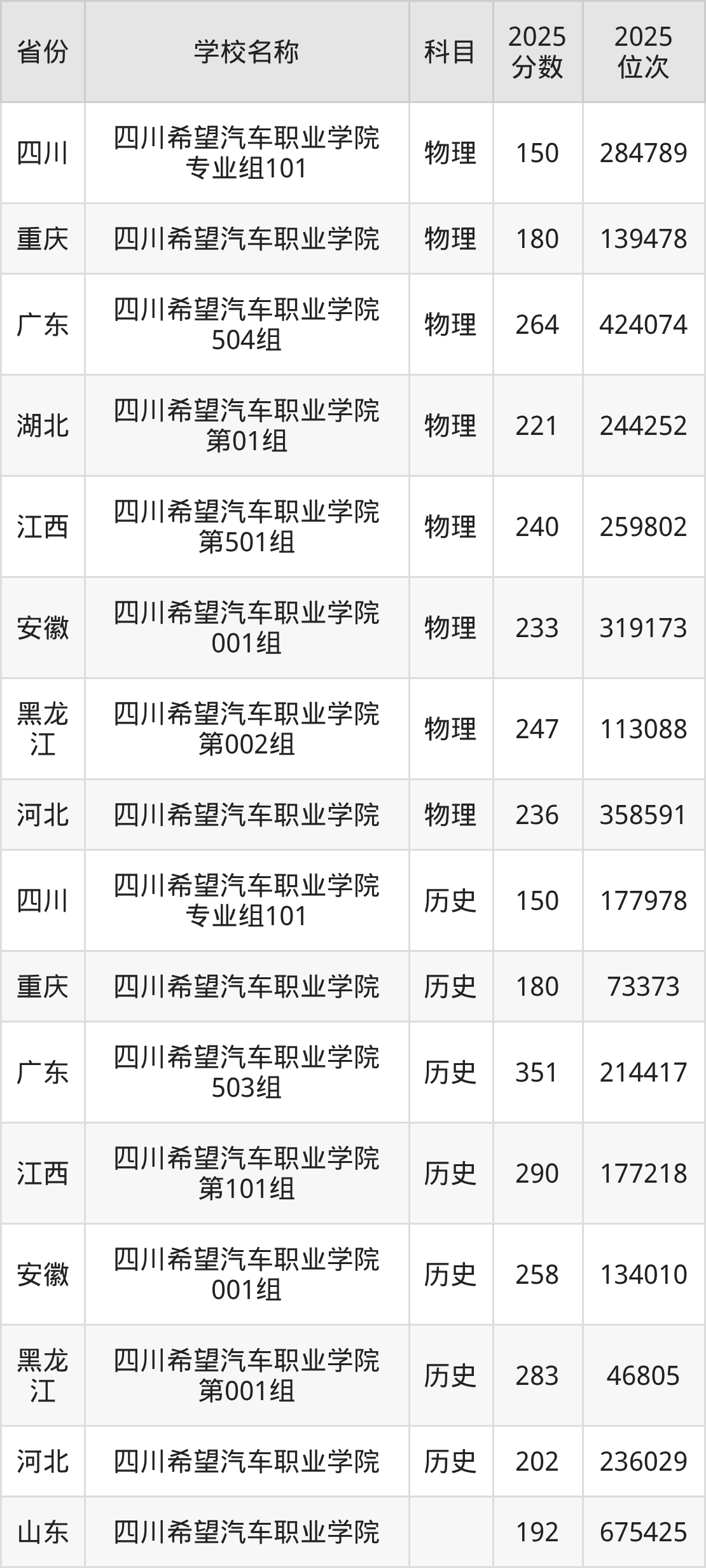 四川希望汽车职业学院2025年有1个专业组面向四川省内首选了历史科目的考生招生: