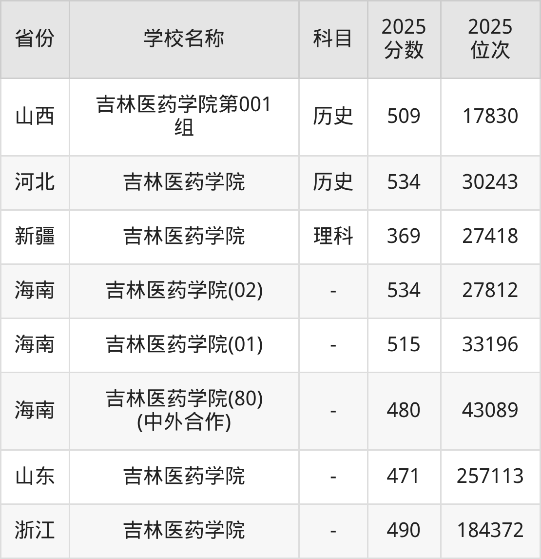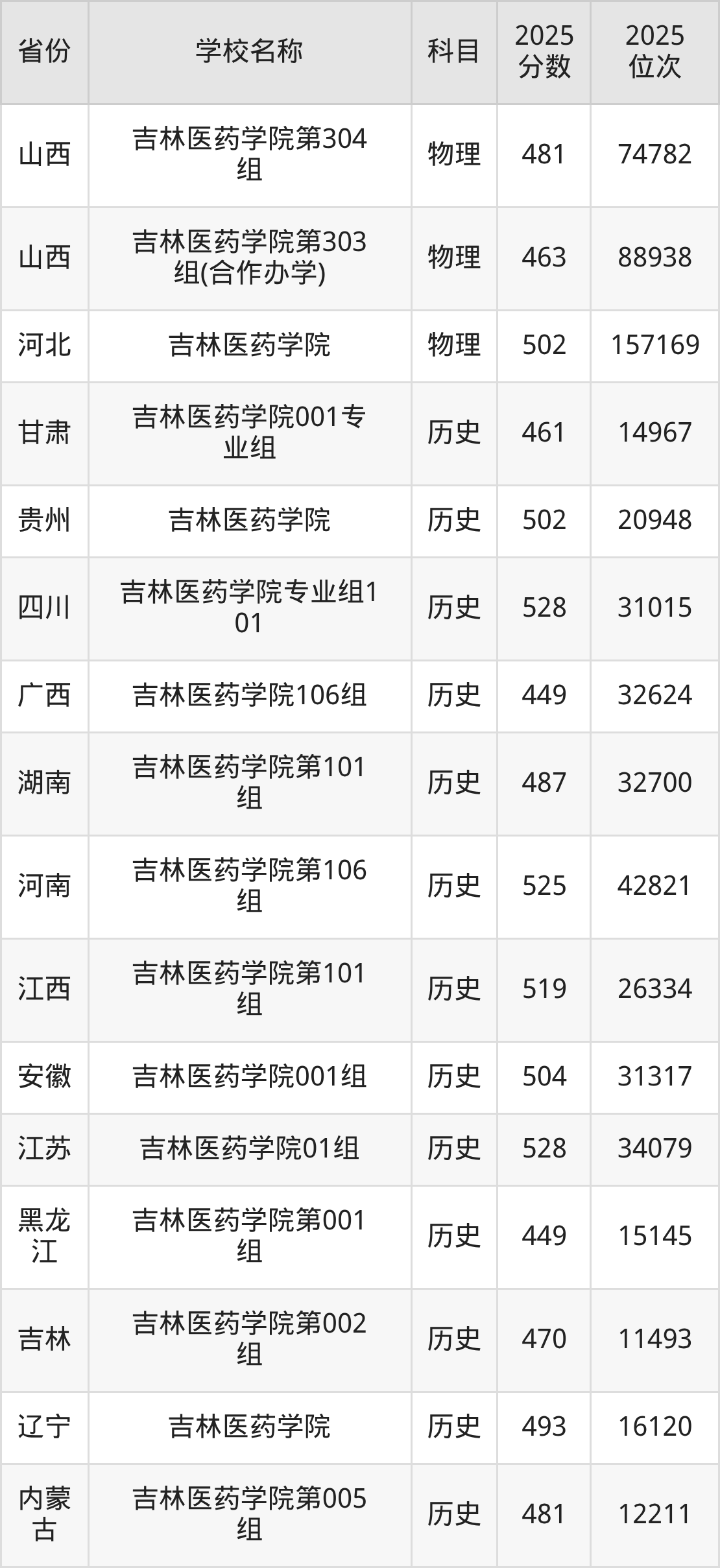 吉林医药学院2025年有1个专业组面向吉林省内首选了历史科目的考生招生: