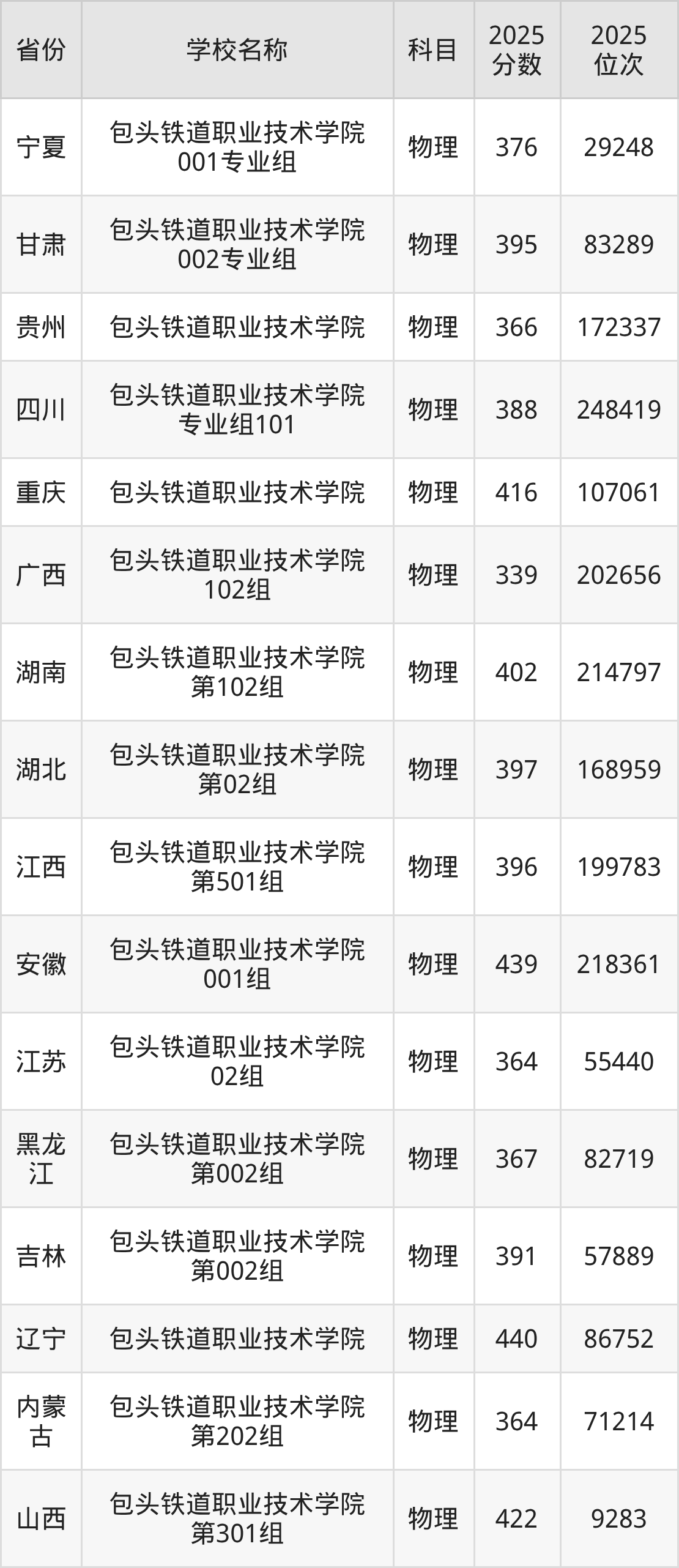 包头铁道职业技术学院2025年有1个专业组面向内蒙古自治区内首选了物理科目的考生招生: