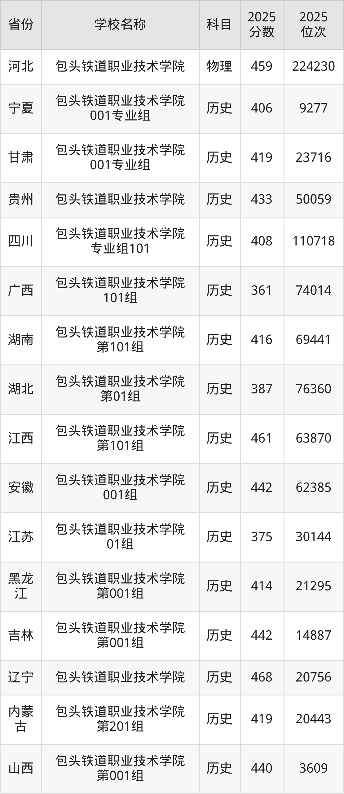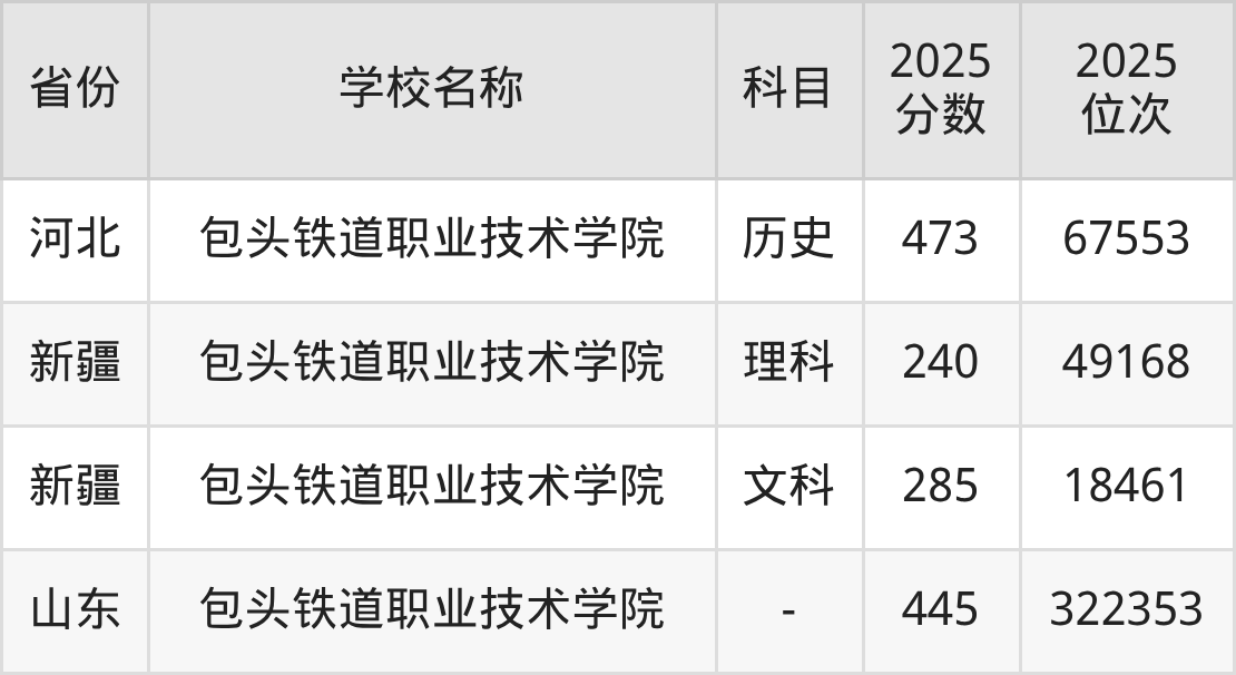 一、2025包头铁道职业技术学院录取分数线