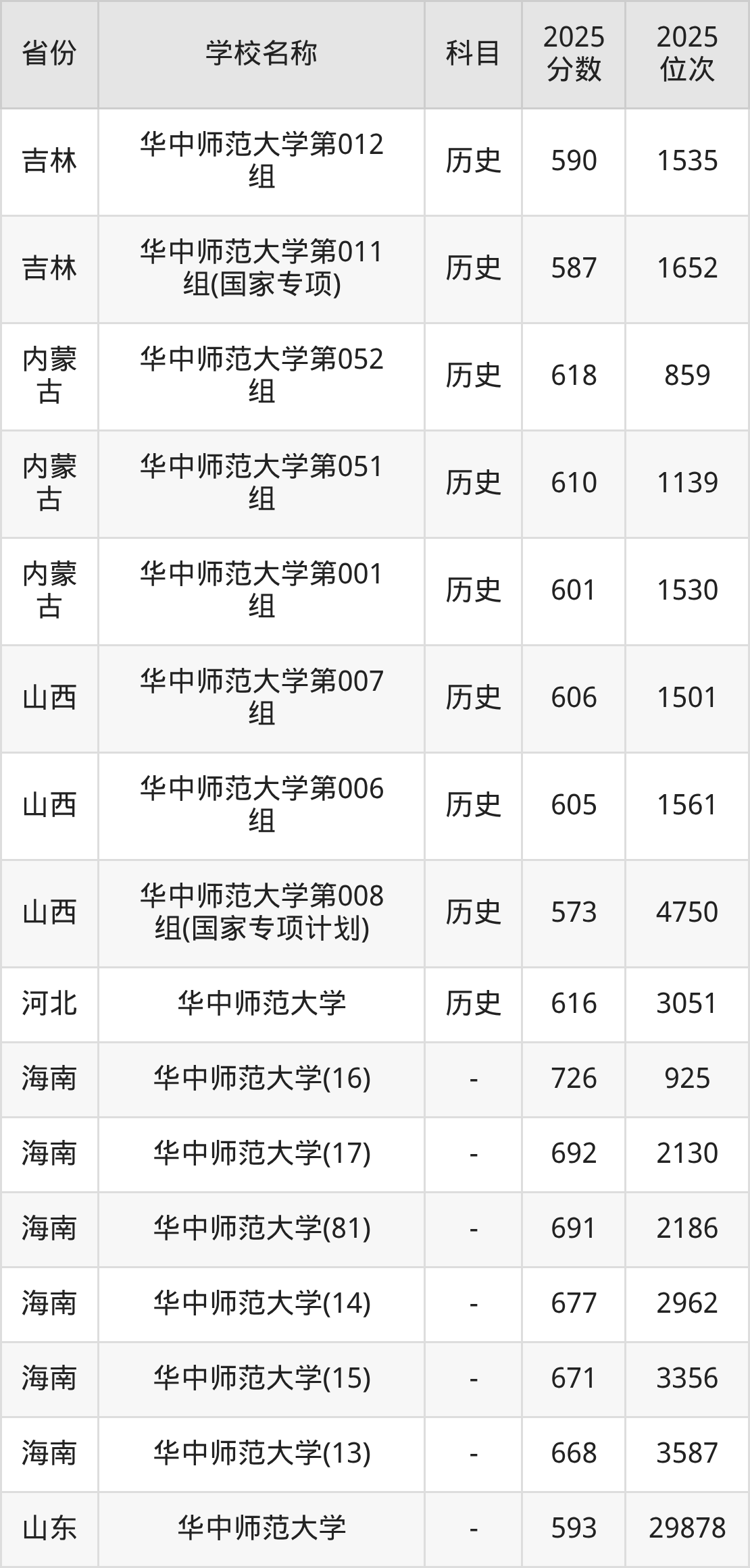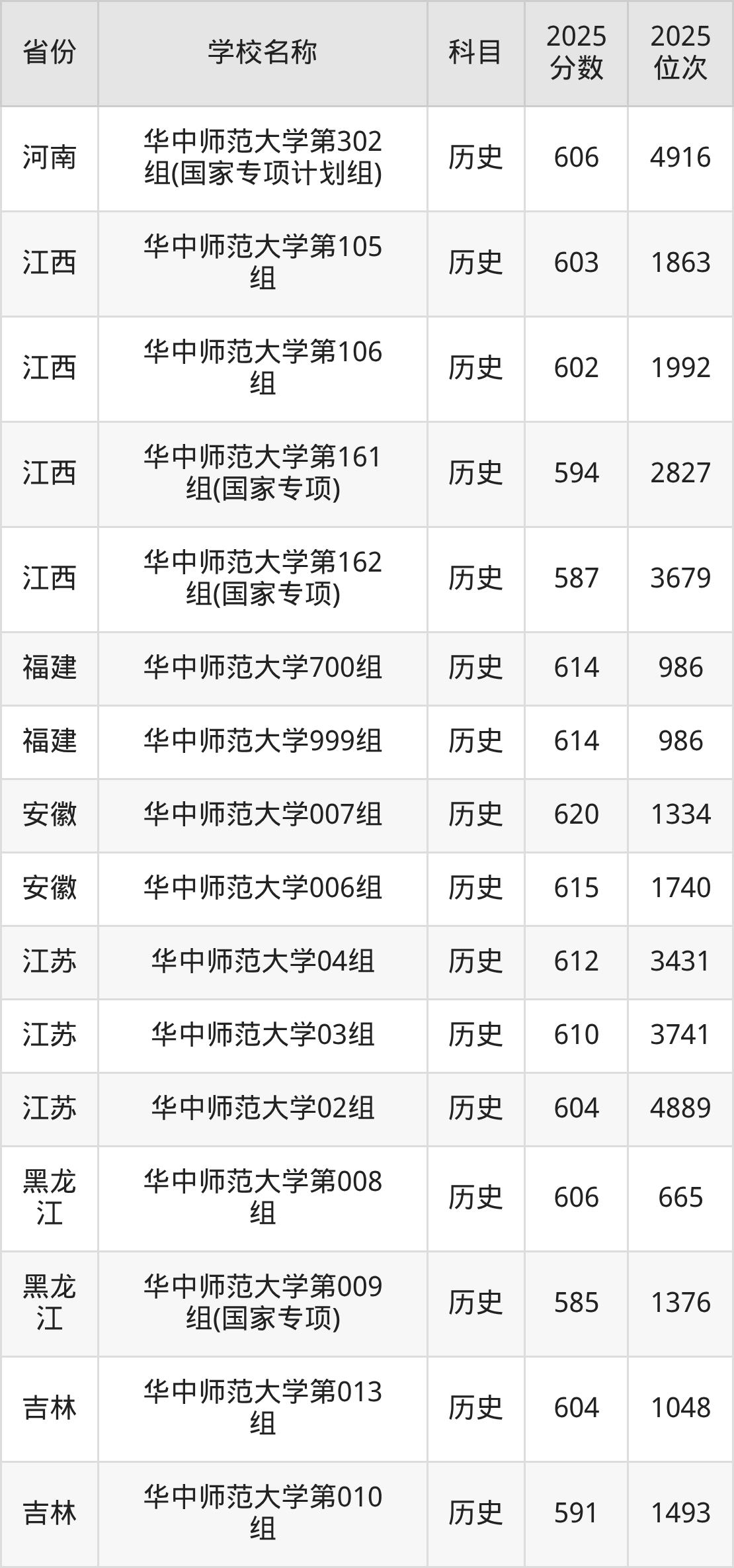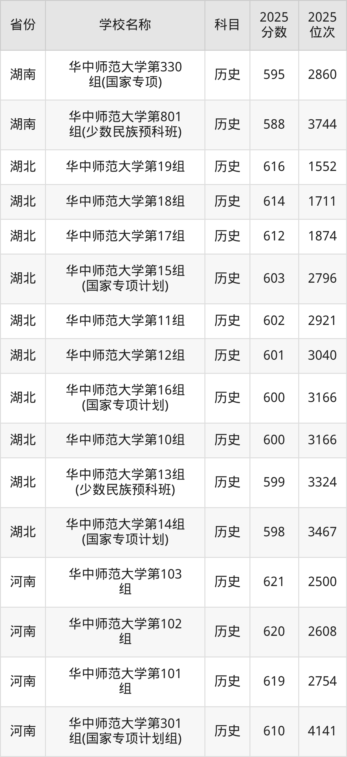 华中师范大学2025年有12个专业组面向湖北省内首选了历史科目的考生招生: