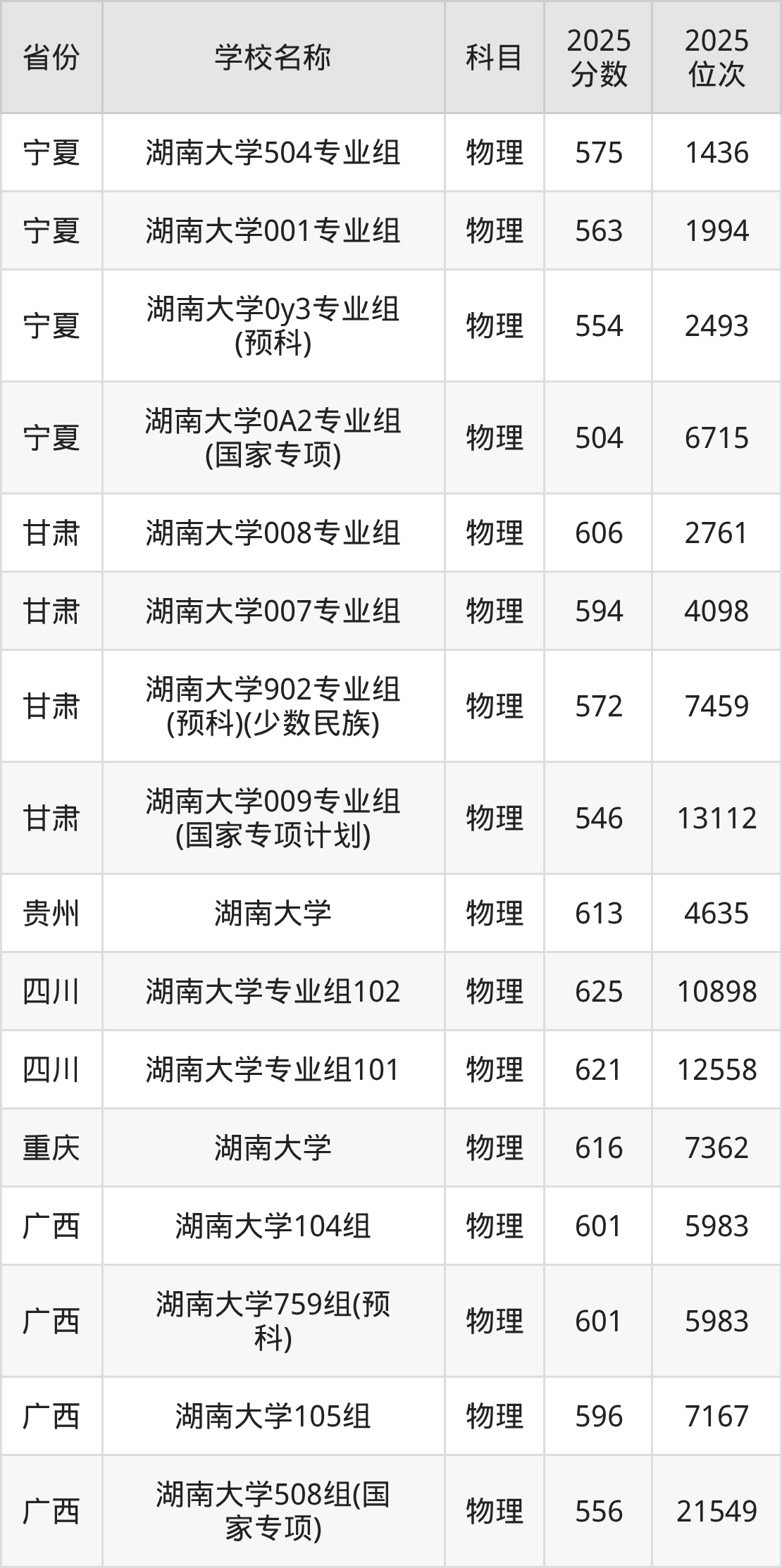 湖南大学2025年有7个专业组面向湖南省内首选了物理科目的考生招生: