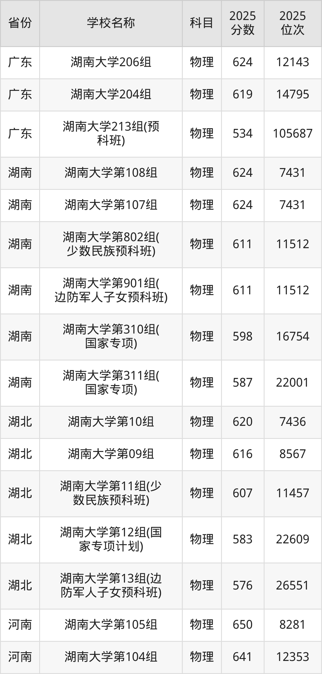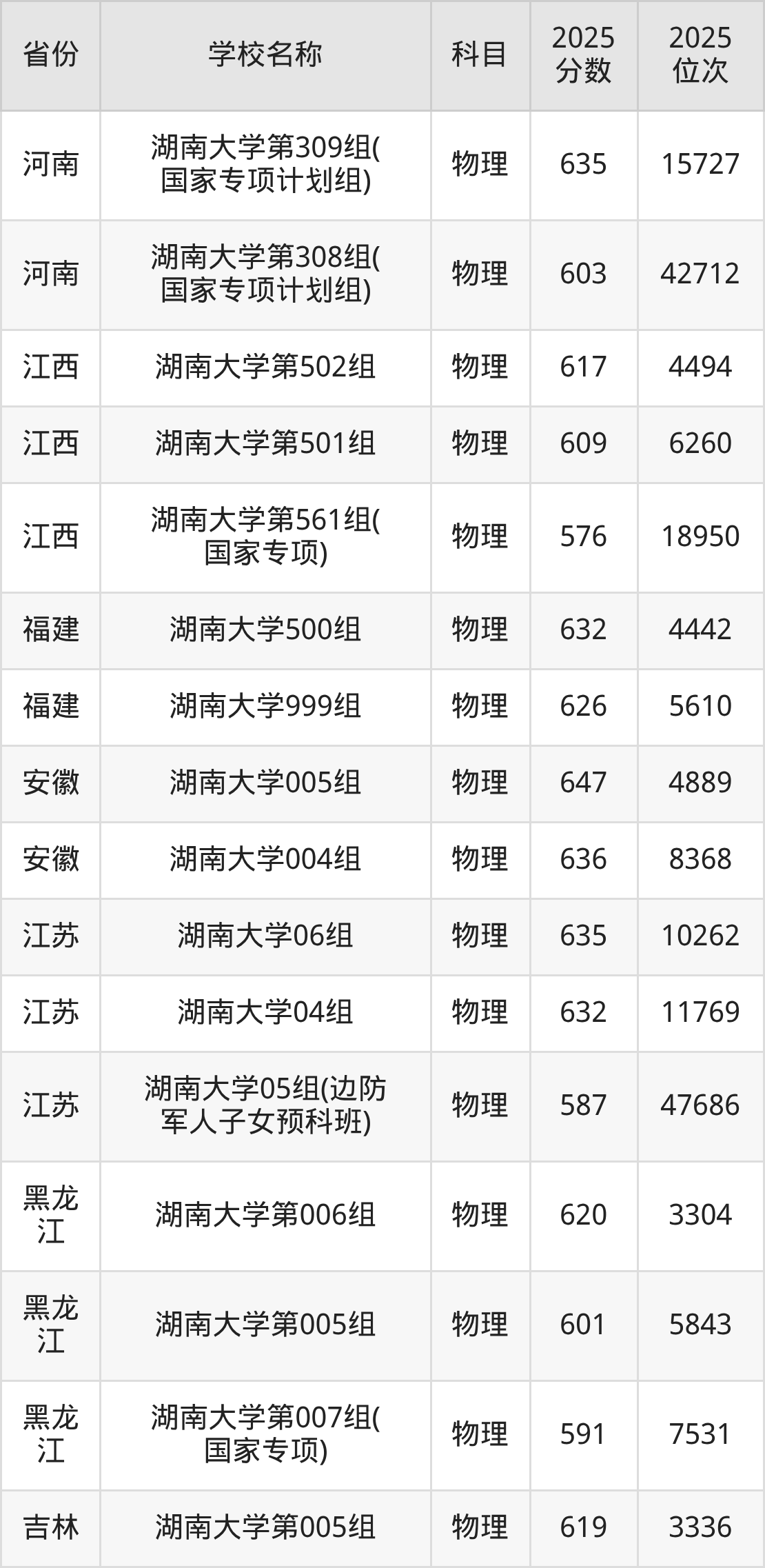 二、湖南大学各专业录取分数线