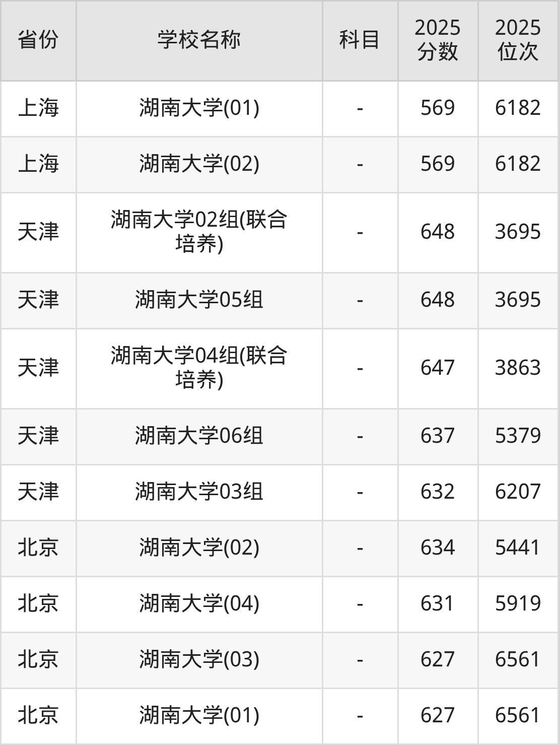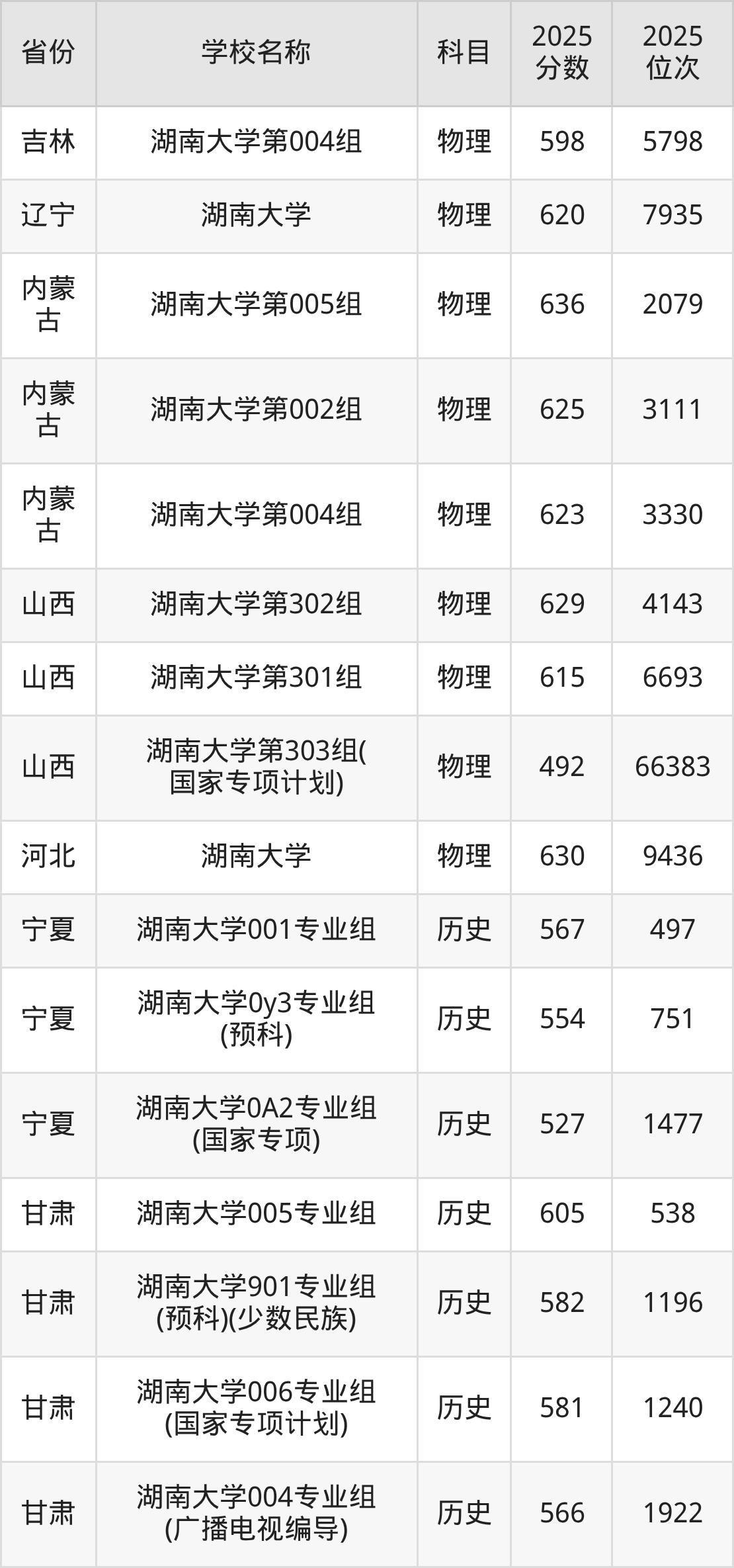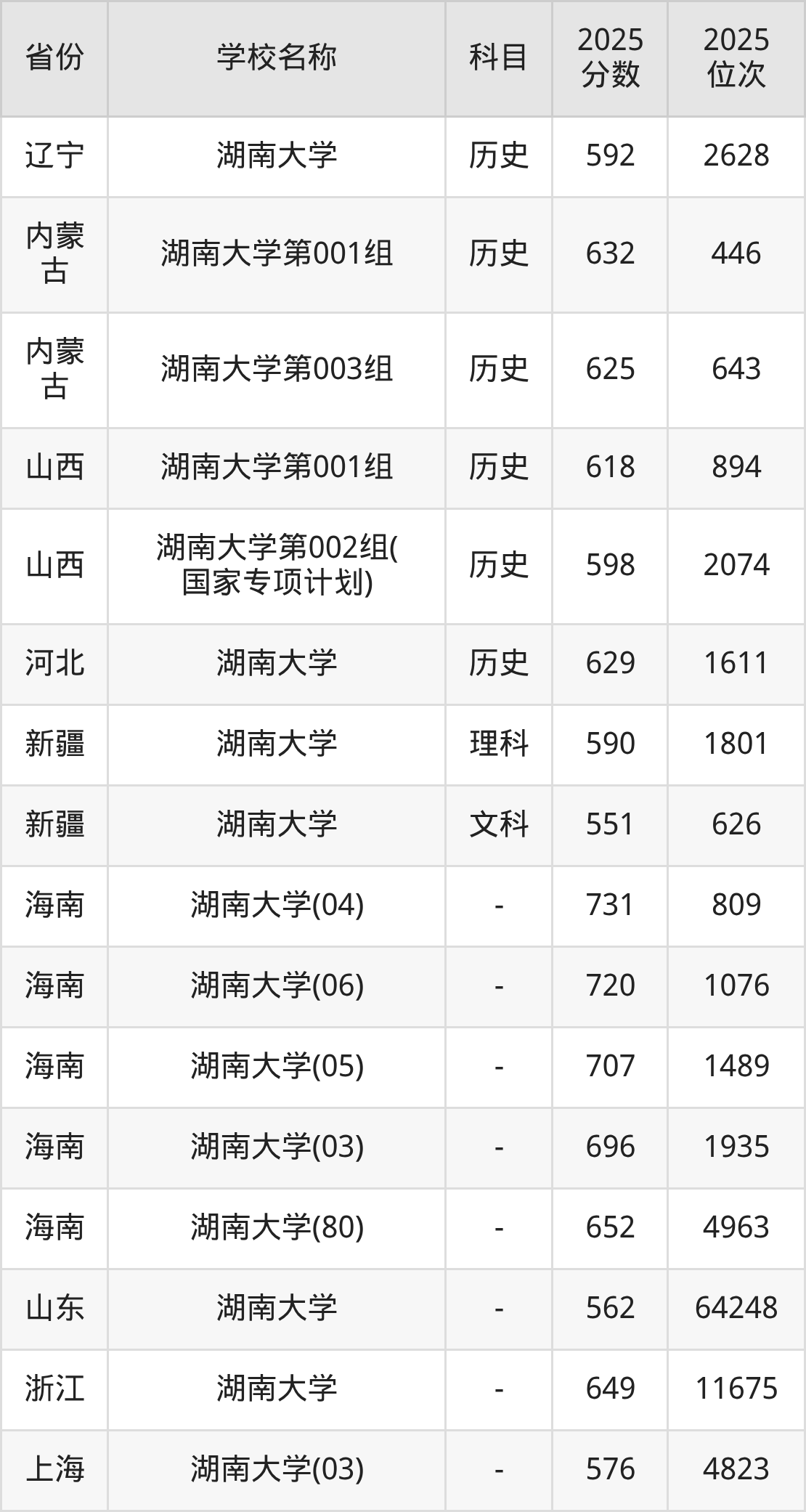 一、2025湖南大学录取分数线