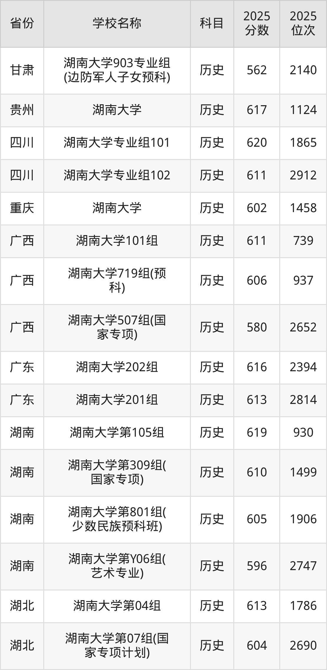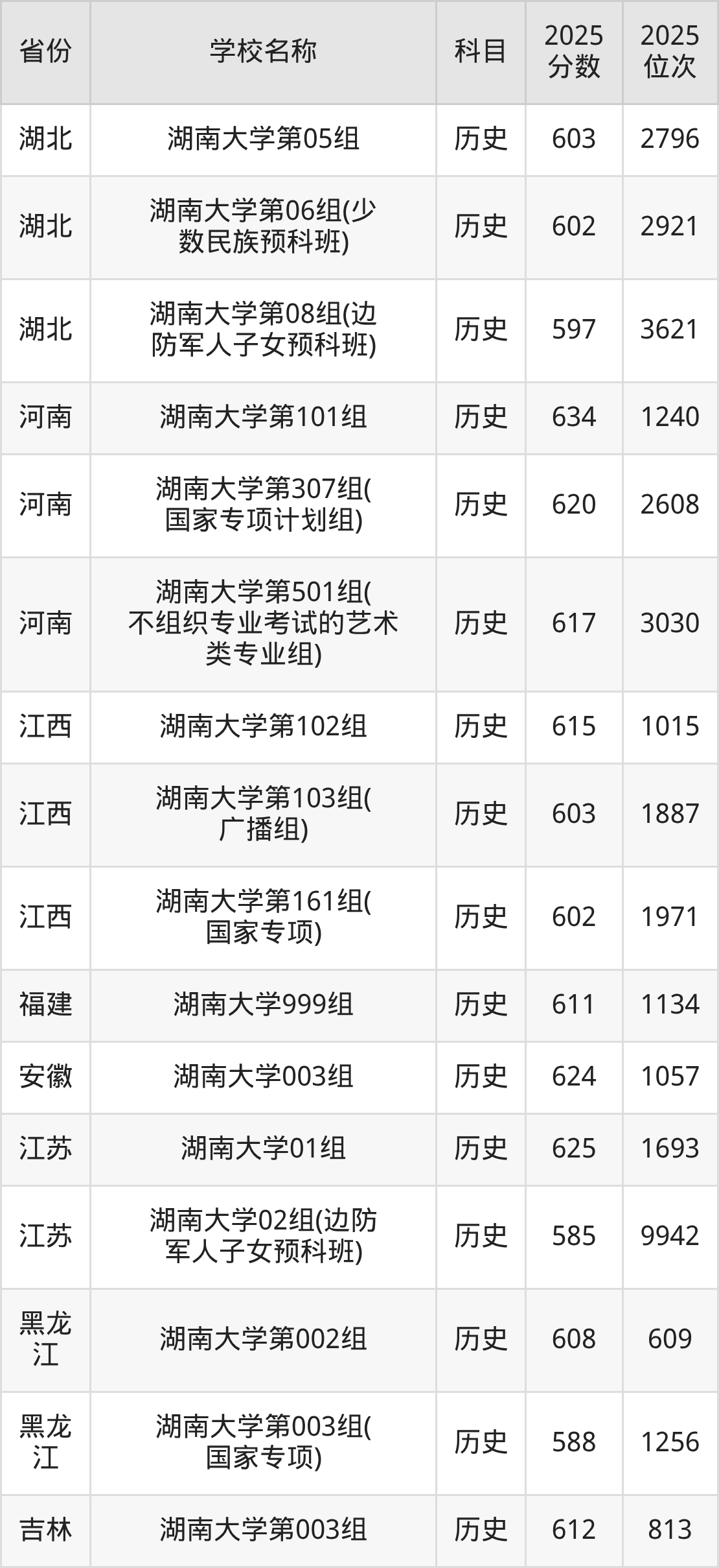 湖南大学2025年有5个专业组面向湖南省内首选了历史科目的考生招生: