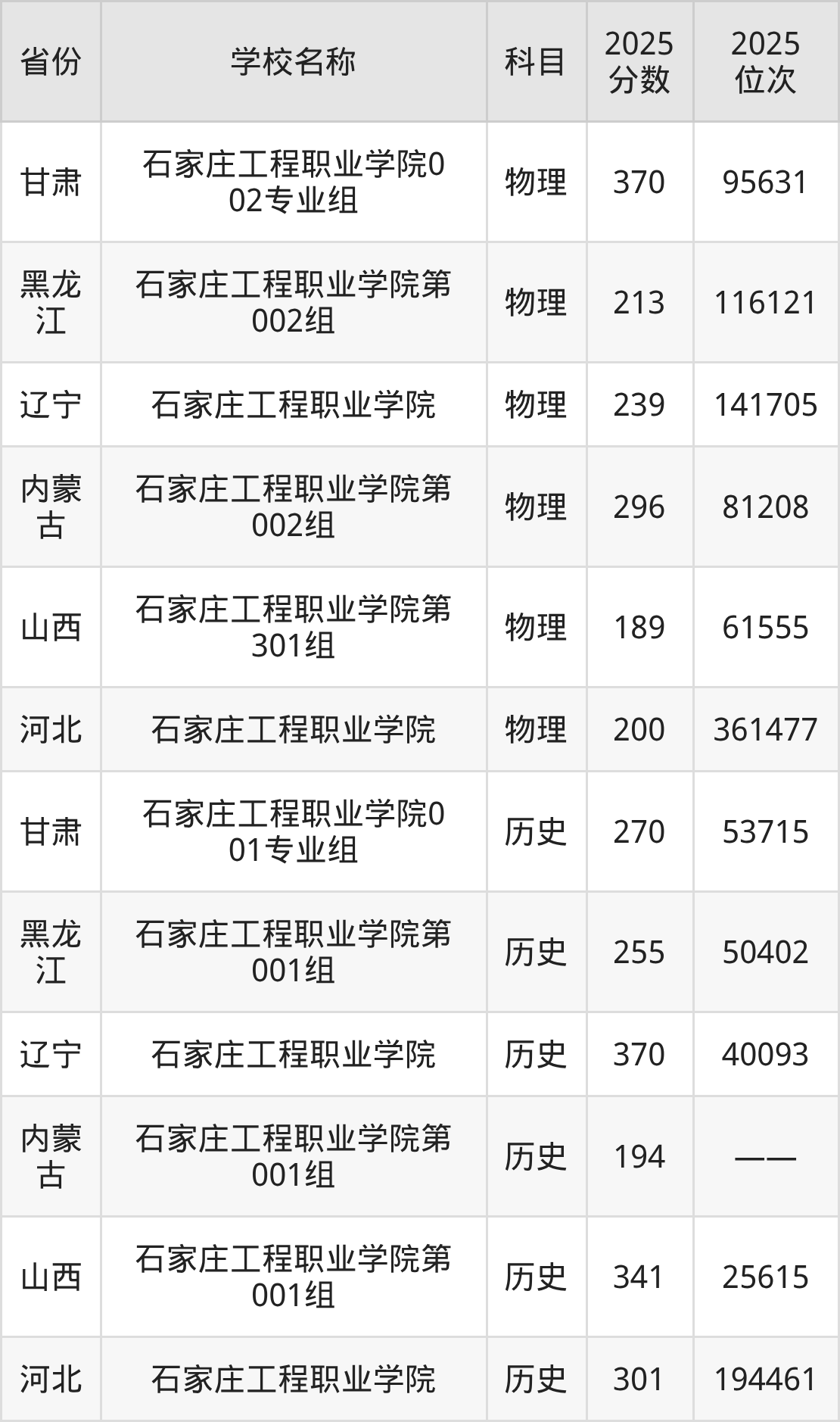 二、石家庄工程职业学院各专业录取分数线