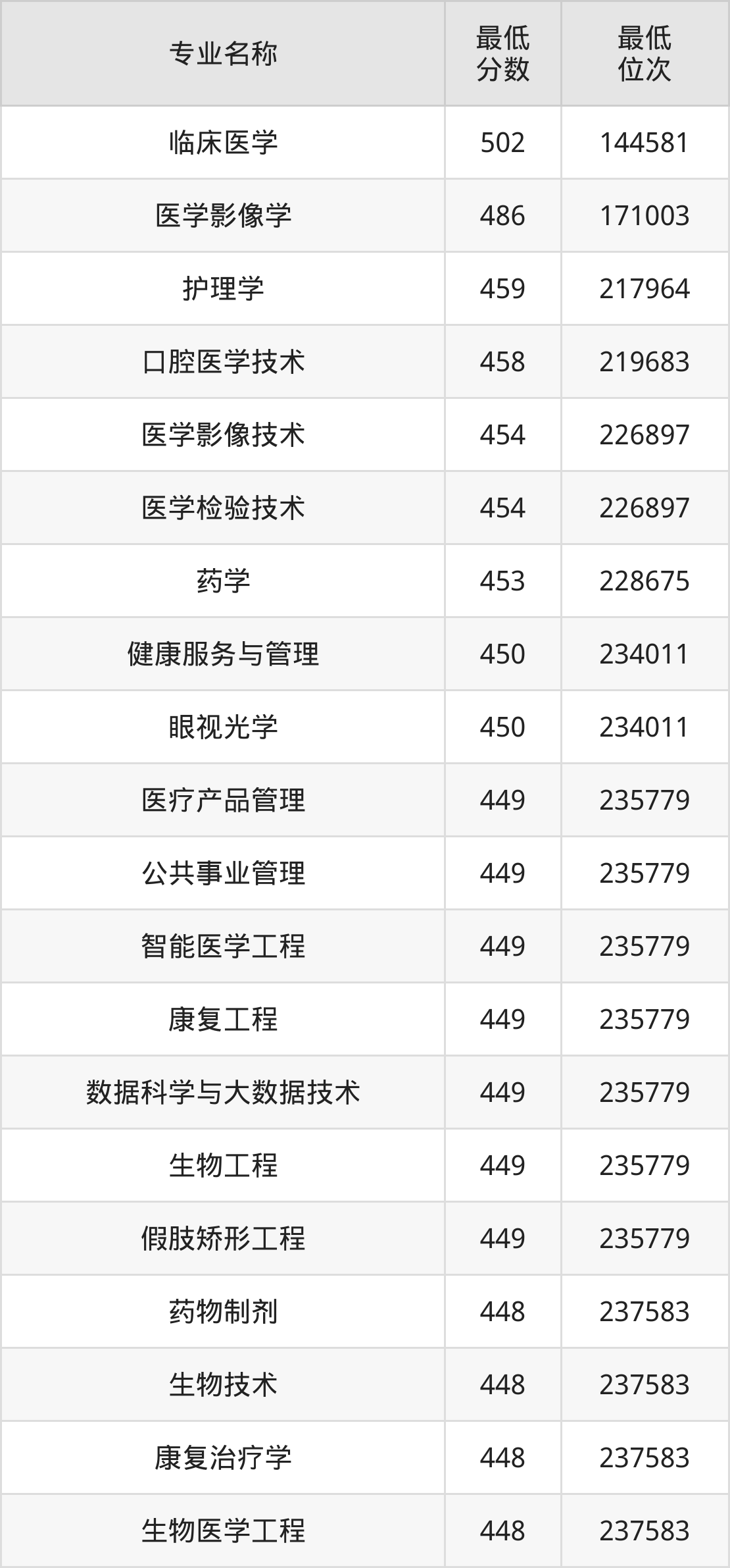 豫北医学院2024年在河南理科各专业的录取分数线是:212分-502分。