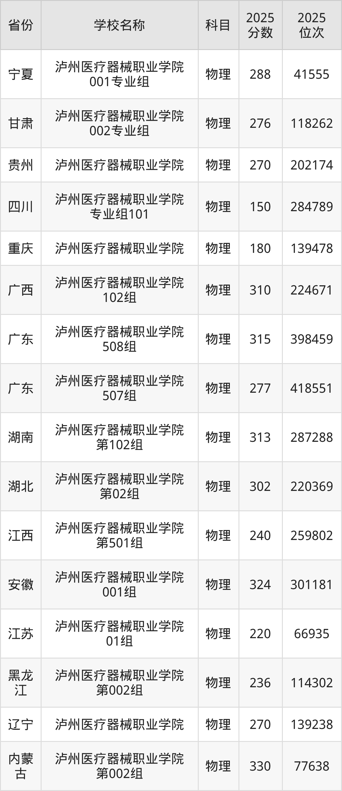 泸州医疗器械职业学院2025年有1个专业组面向四川省内首选了物理科目的考生招生: