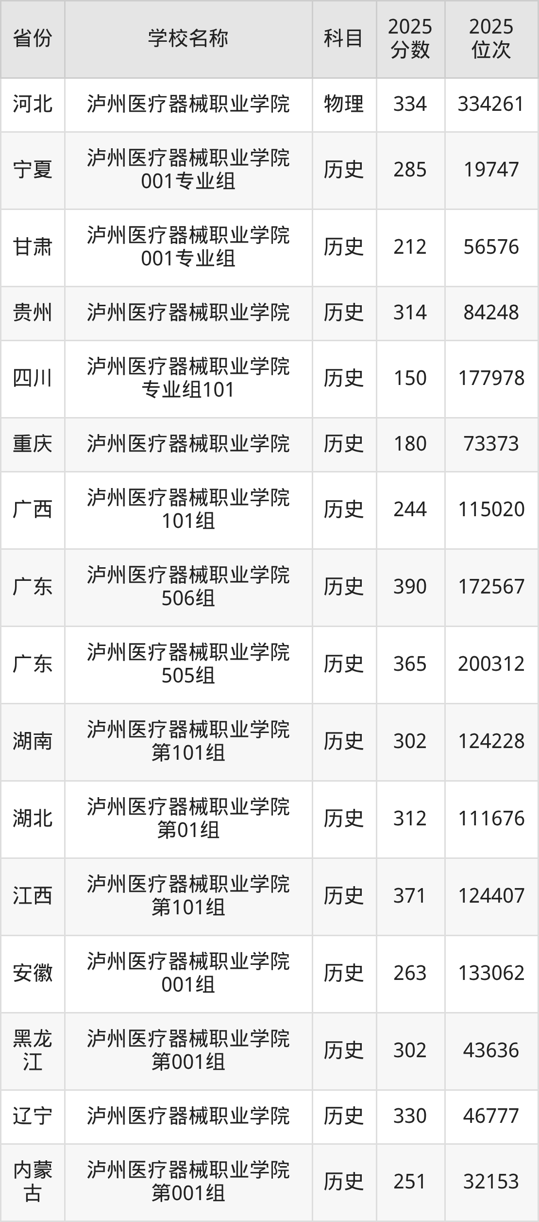 泸州医疗器械职业学院2025年有1个专业组面向四川省内首选了历史科目的考生招生:
