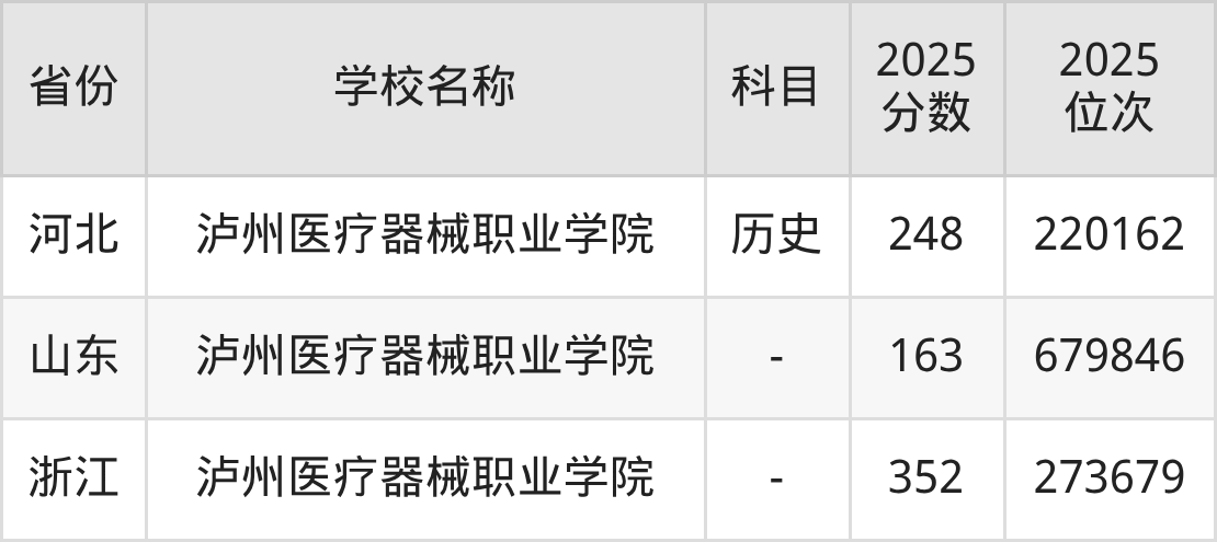 2025年泸州医疗器械职业学院在全国各省专科的最低录取分数线在150~390分之间。浙江高考生最低352分能上泸州医疗器械职业学院、河北物理类高考生最低334分能上泸州医疗器械职业学院……下文将展示泸州医疗器械职业学院在全国18个高考省份中的专科最低投档录取分汇总!