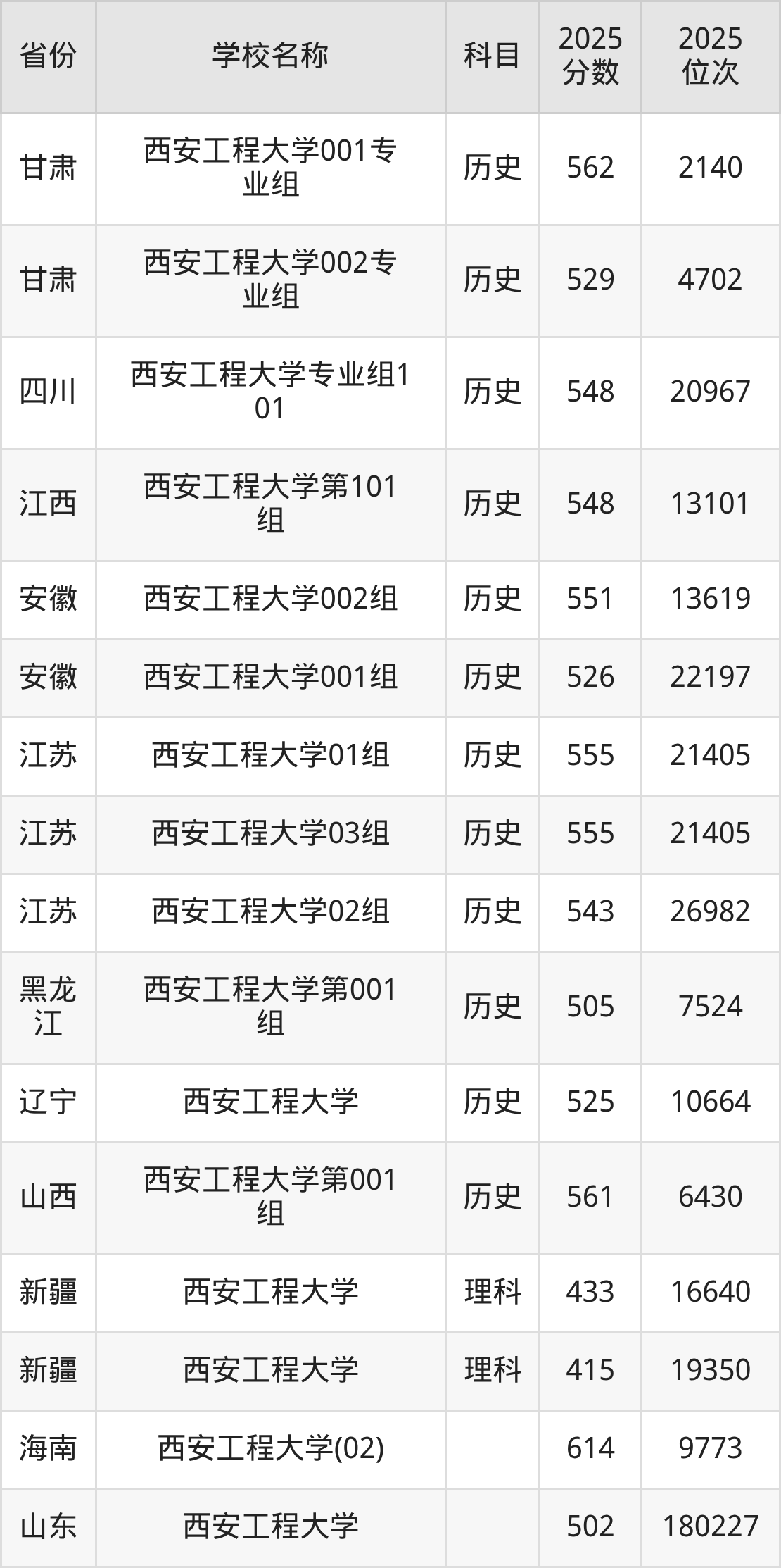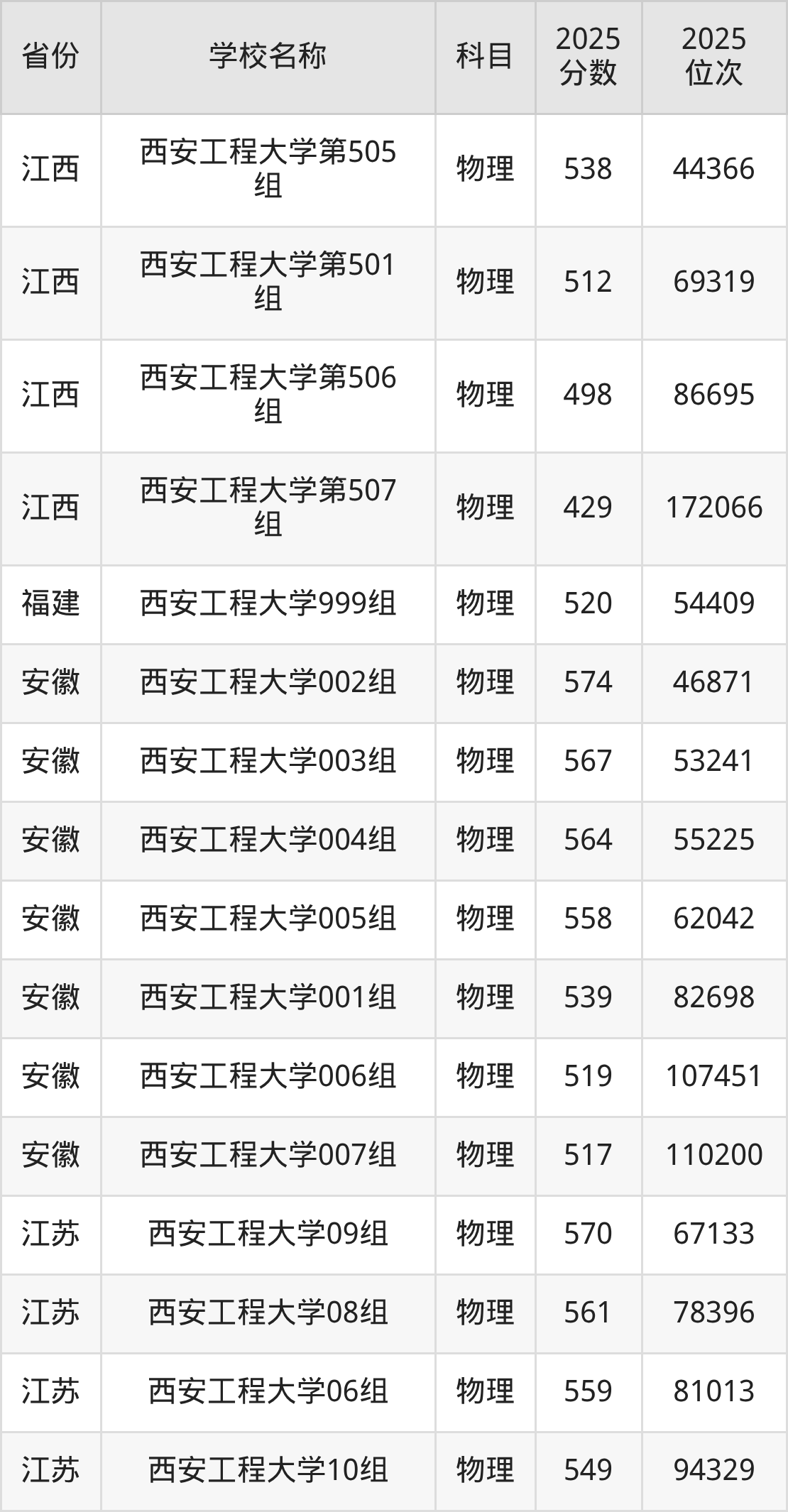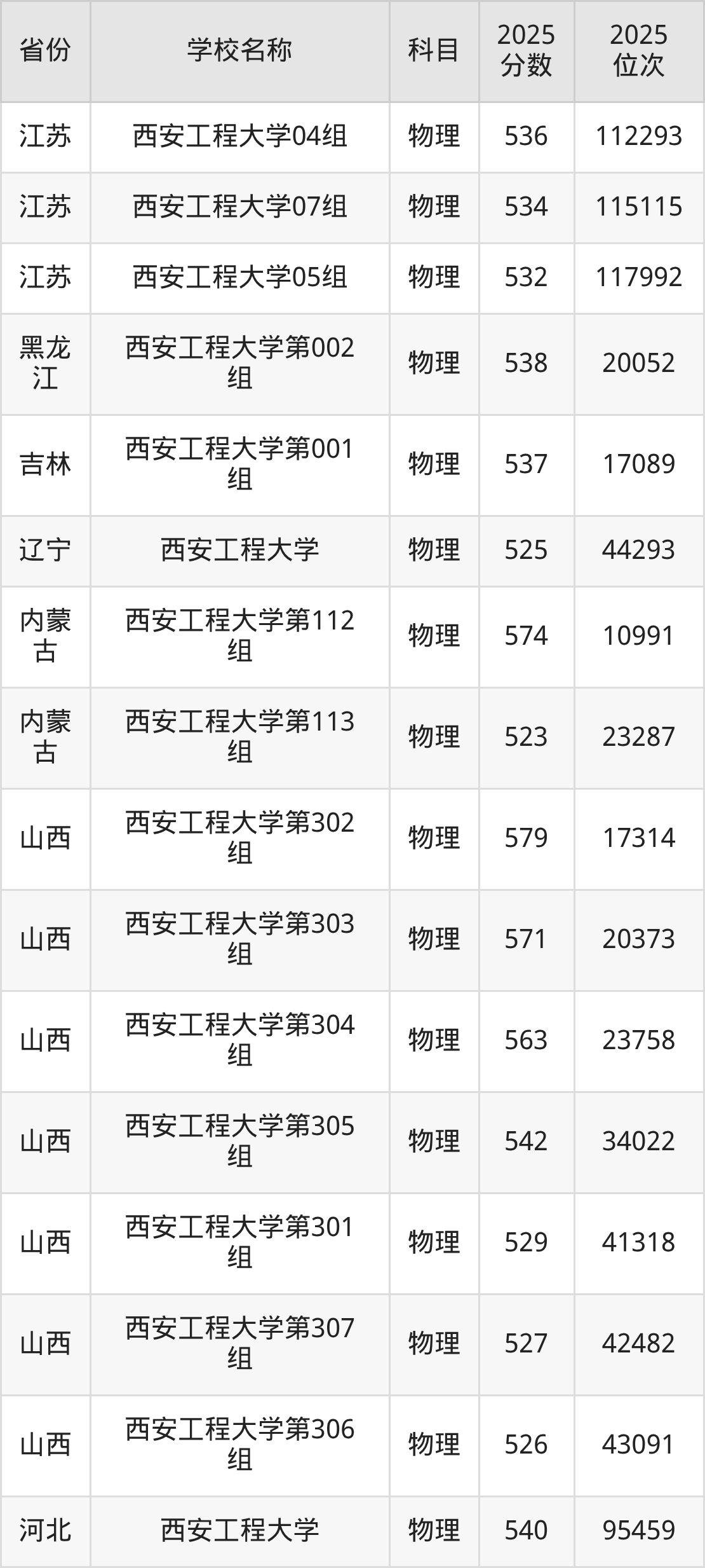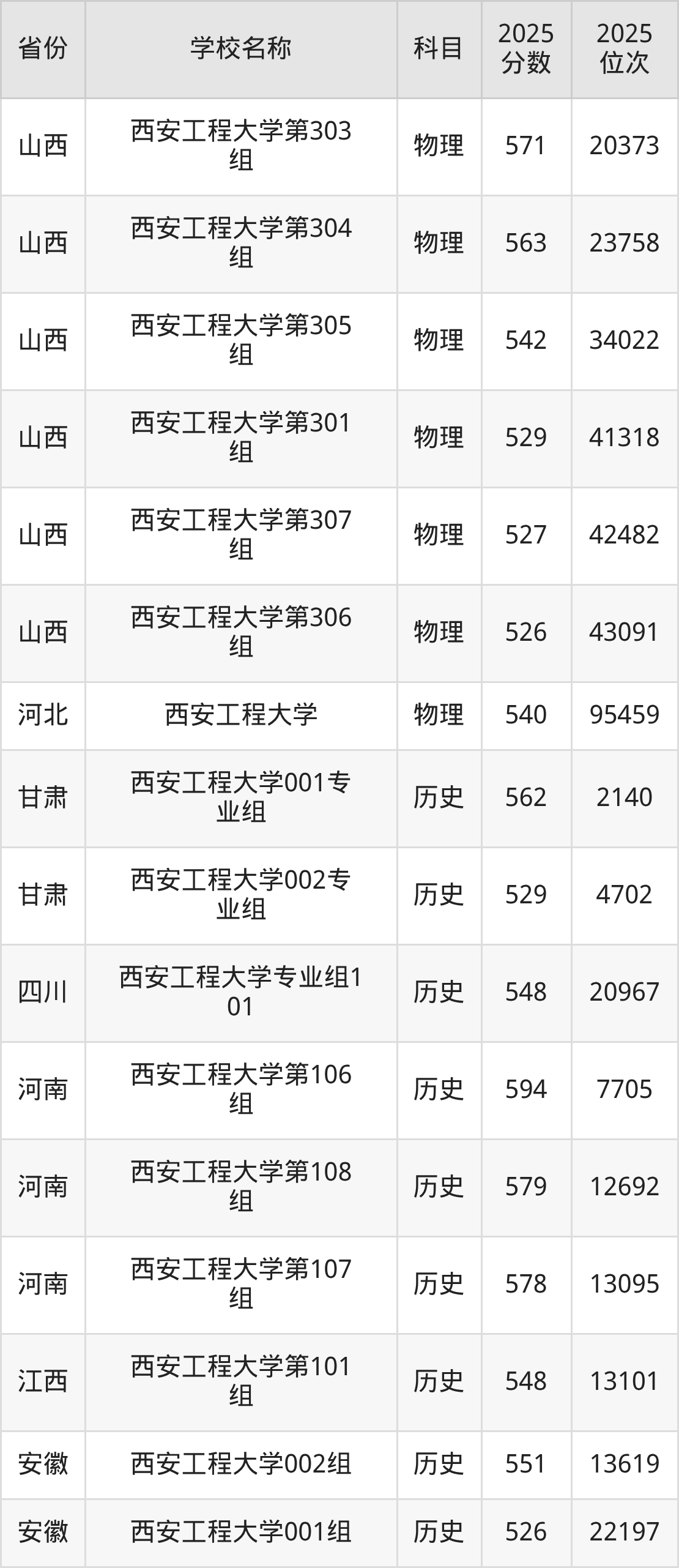 二、西安工程大学各专业录取分数线