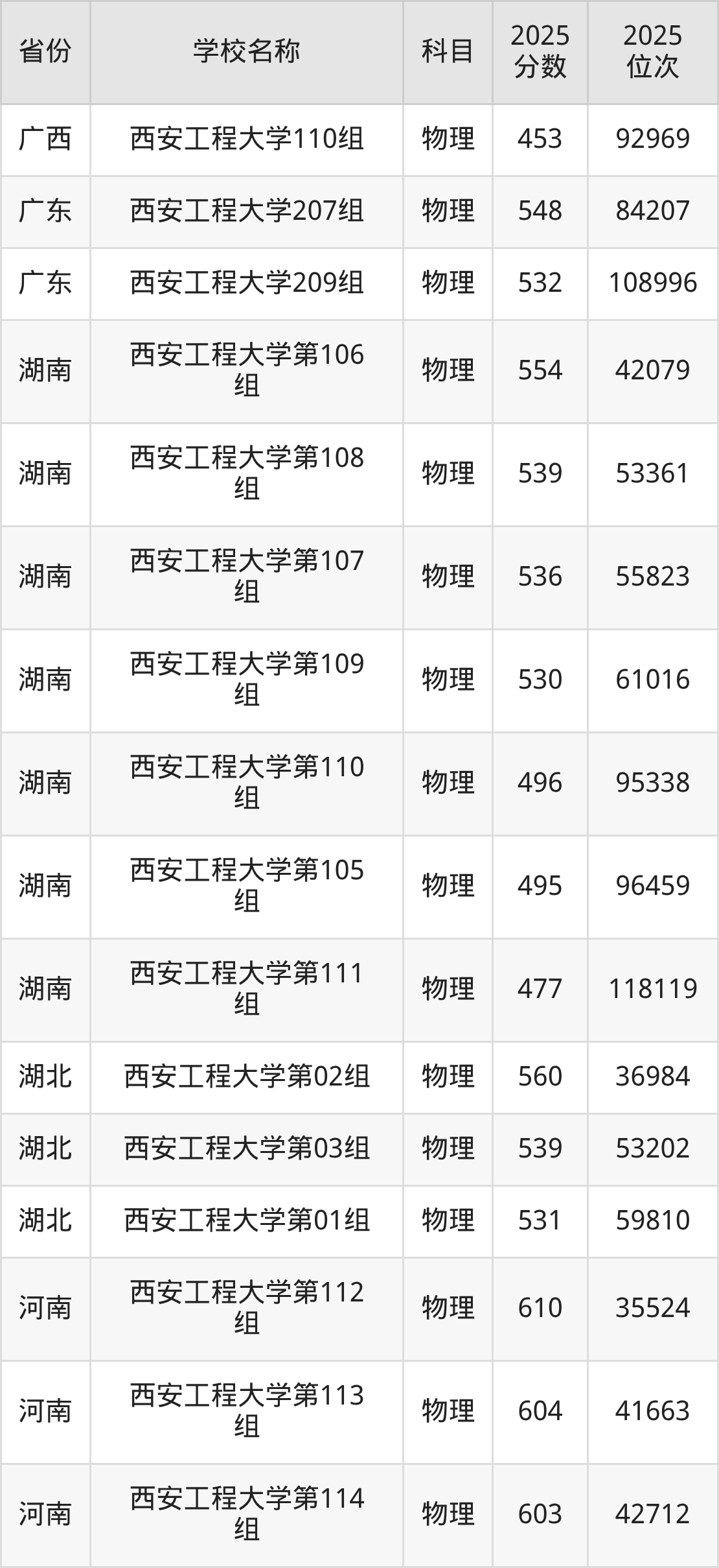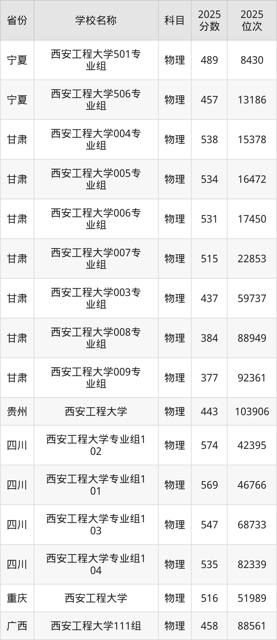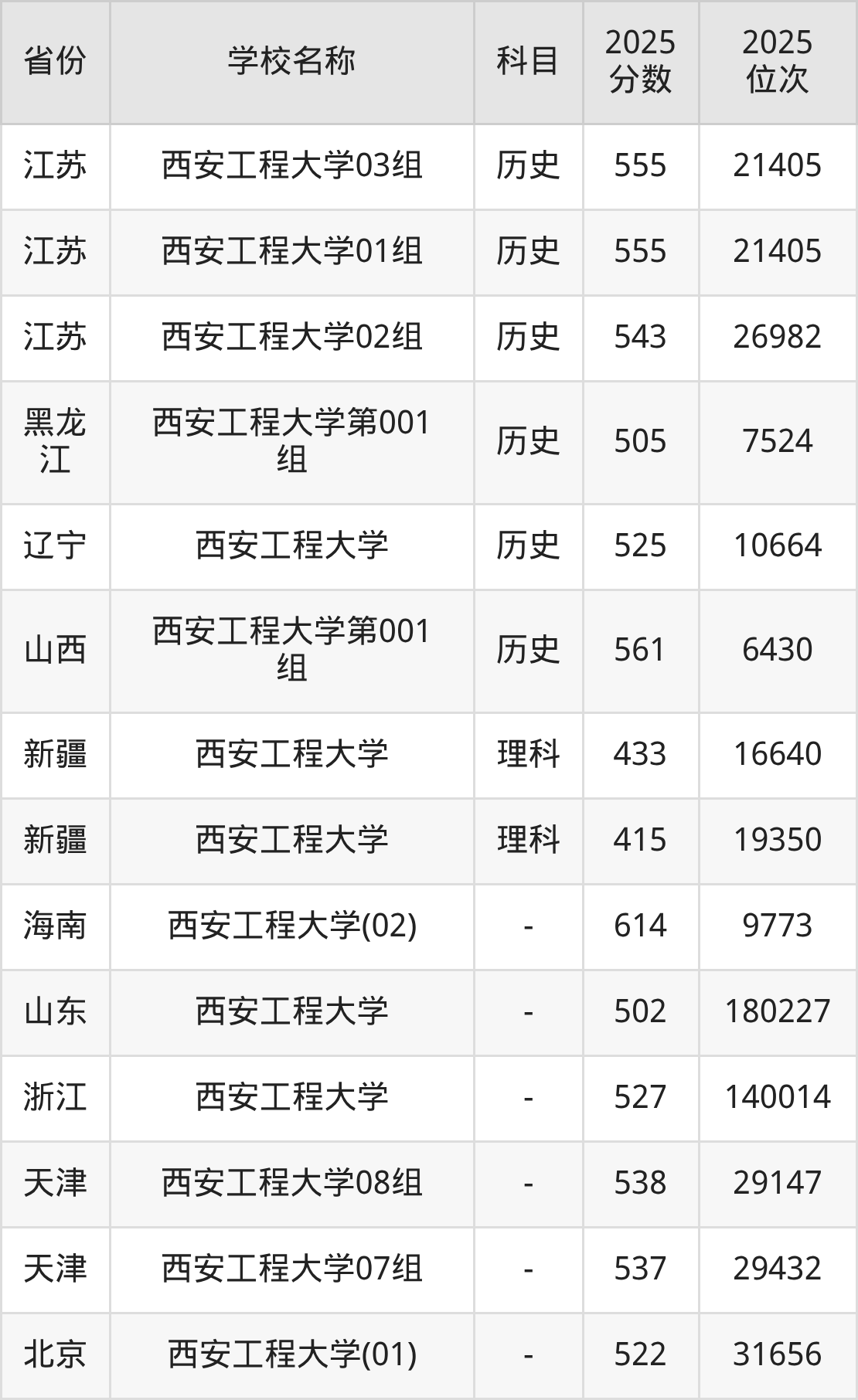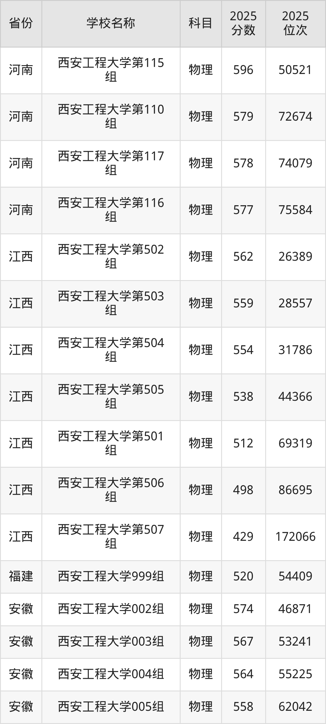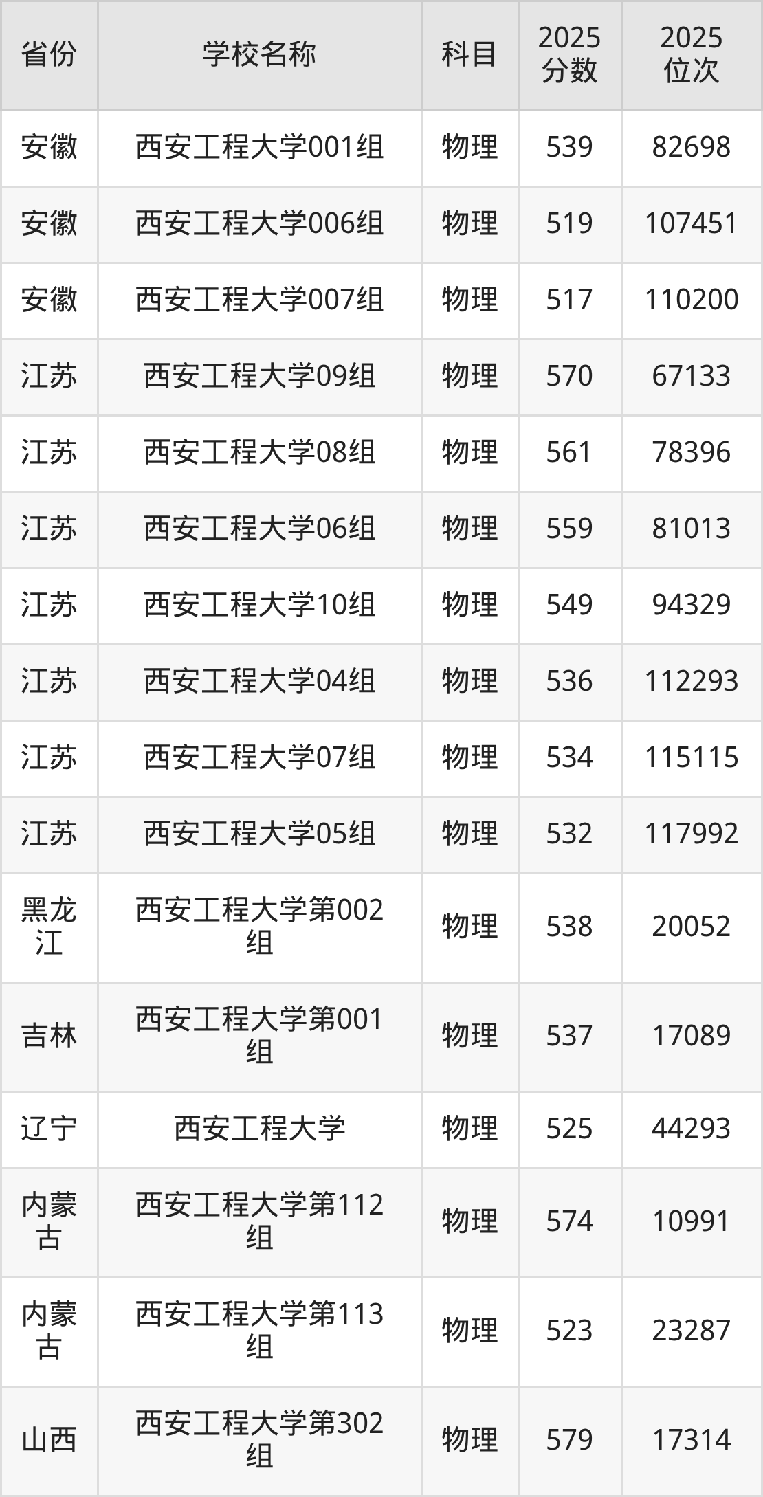 二、西安工程大学各专业录取分数线