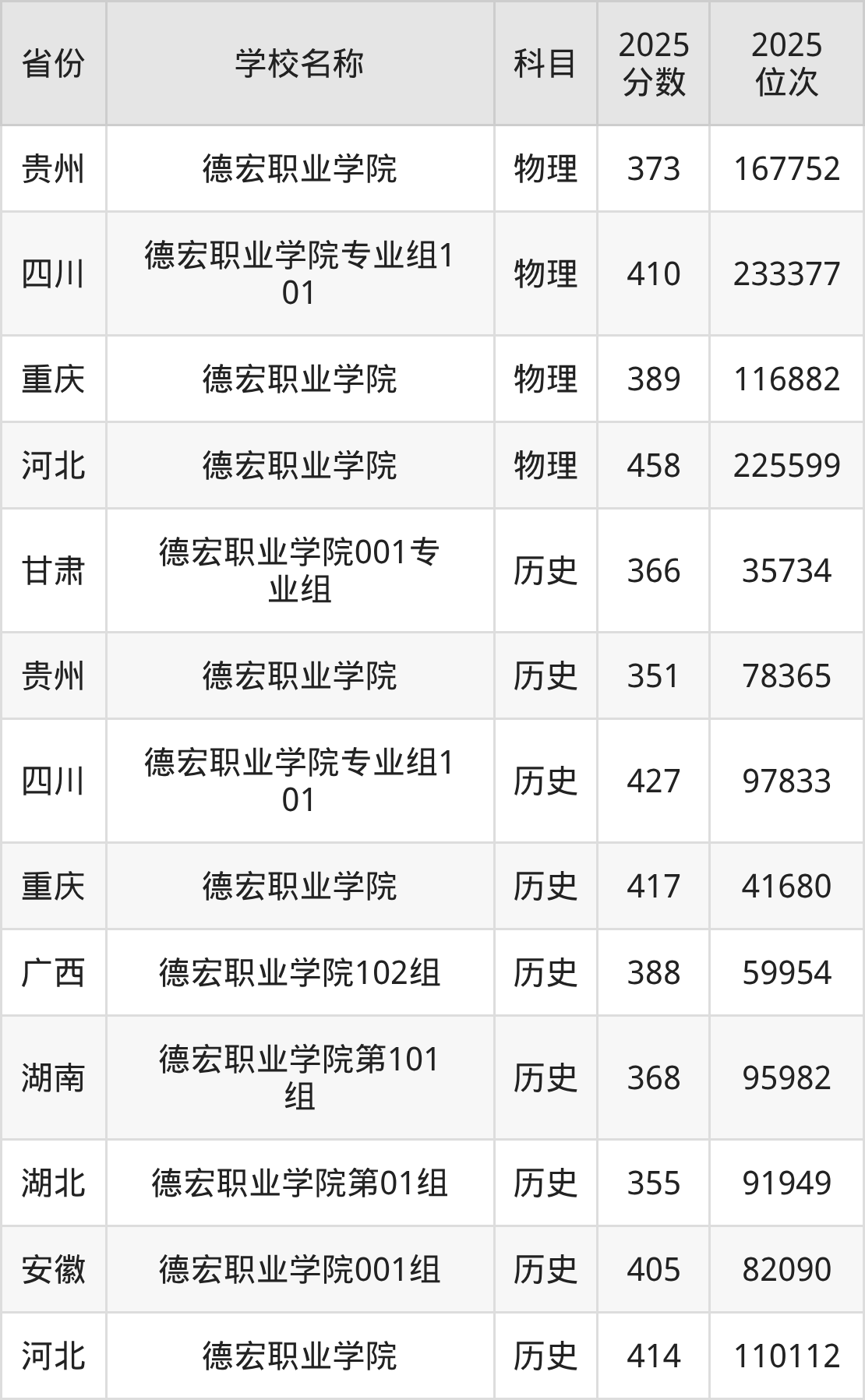 2025年德宏职业学院在全国各省专科的最低录取分数线在351~458分之间。河北物理类高考生最低458分能上德宏职业学院、四川物理类高考生最低410分能上德宏职业学院……下文将展示德宏职业学院在全国9个高考省份中的专科最低投档录取分汇总!
