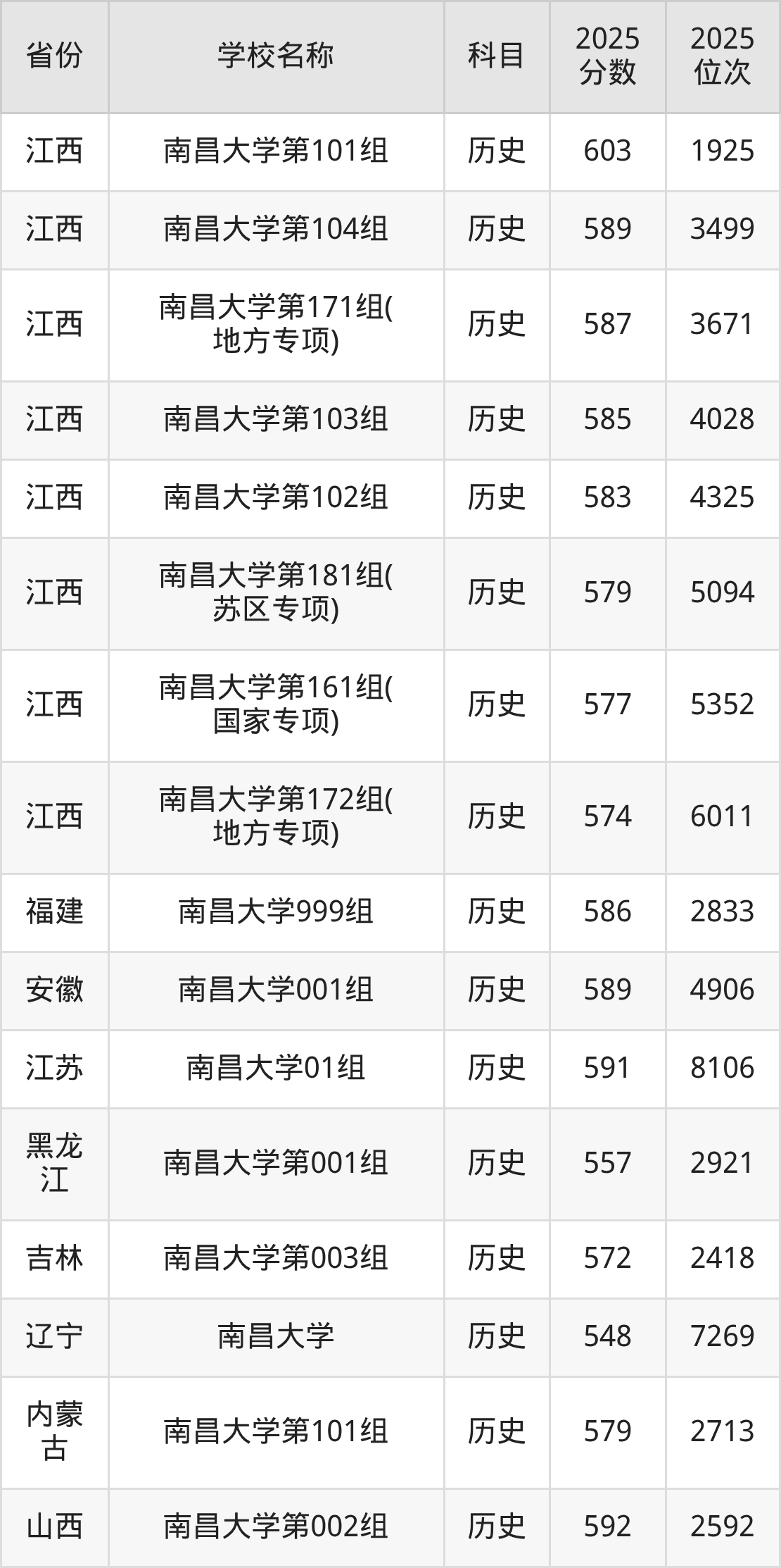 南昌大学2025年有8个专业组面向江西省内首选了历史科目的考生招生: