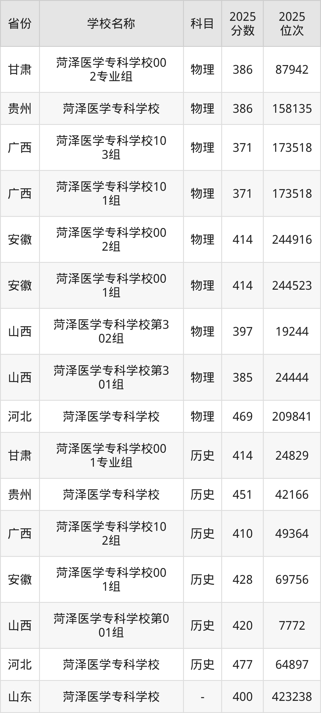 2025年菏泽医学专科学校在全国各省专科的最低录取分数线在371~477分之间。河北物理类高考生最低469分能上菏泽医学专科学校、安徽物理类高考生最低414分能上菏泽医学专科学校……下文将展示菏泽医学专科学校在全国7个高考省份中的专科最低投档录取分汇总!