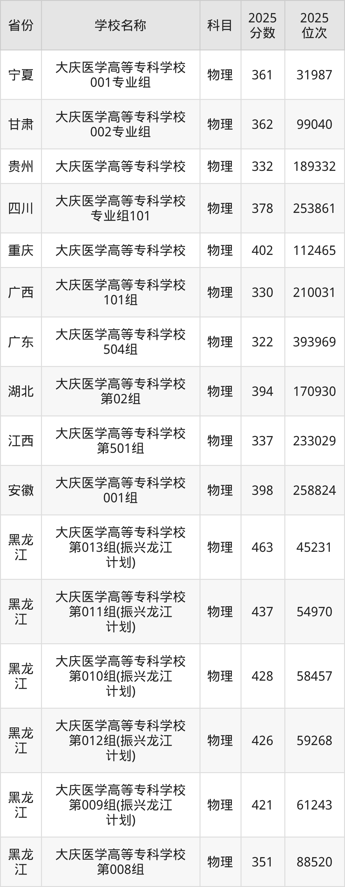 大庆医学高等专科学校2025年有7个专业组面向黑龙江省内首选了物理科目的考生招生:
