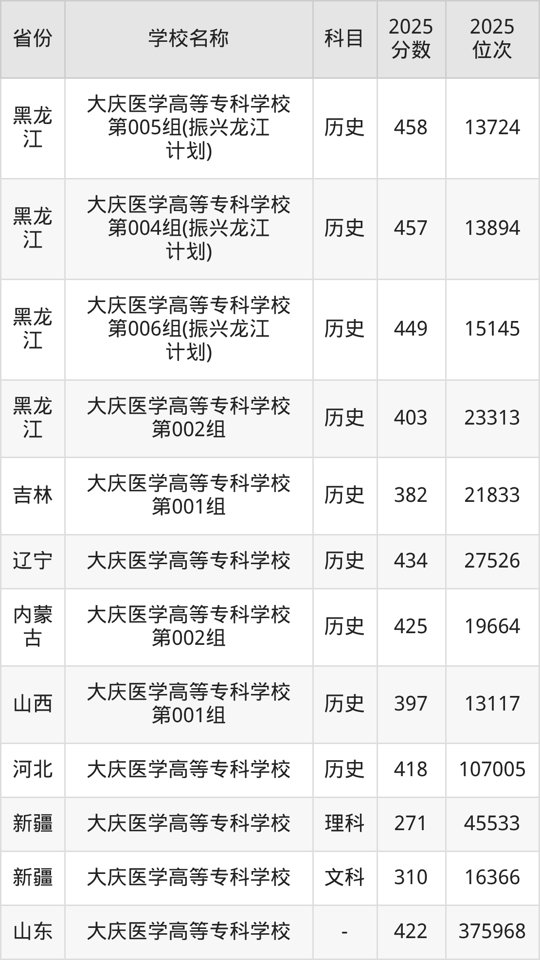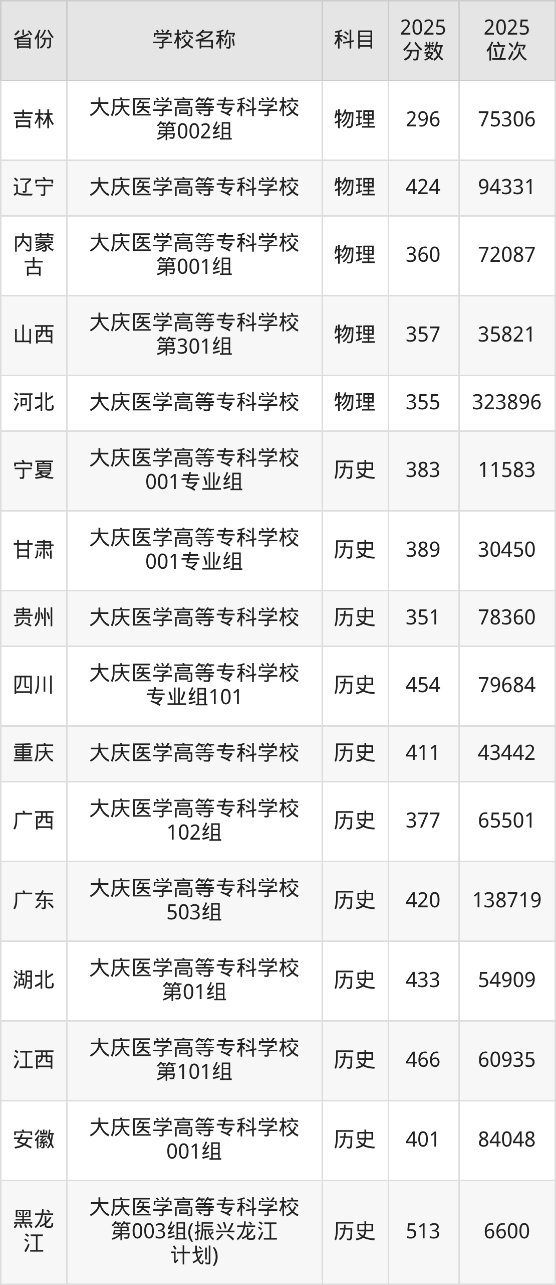 再看黑龙江高考2025年专科批次线,历史类是160分、物理类是160分。通过对比发现:大庆医学高等专科学校2025年历史类最低分比专科线高243分,物理类最低分比专科线高191分。2026届黑龙江高考生,可通过每一次模考划线,来判断自己的成绩是否有机会被大庆医学高等专科学校录取。