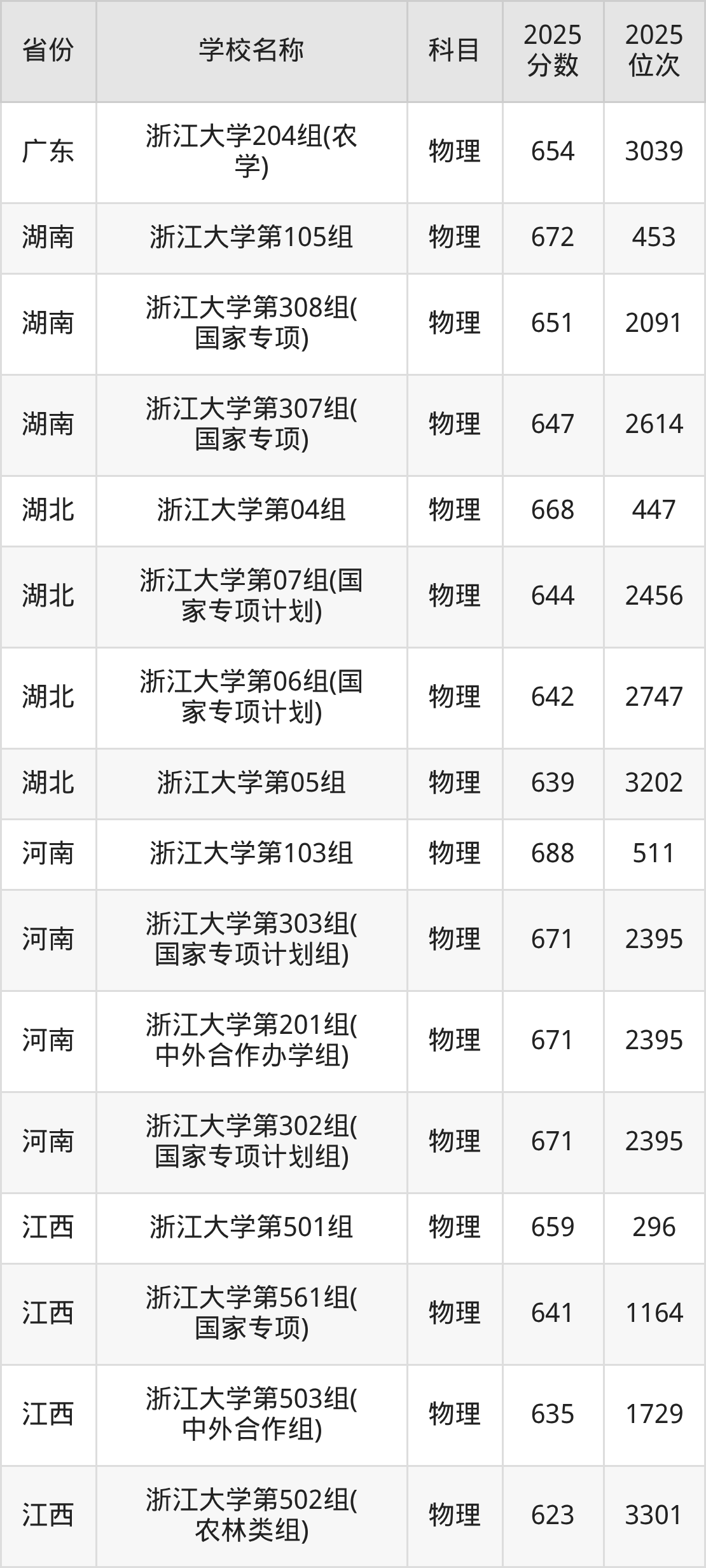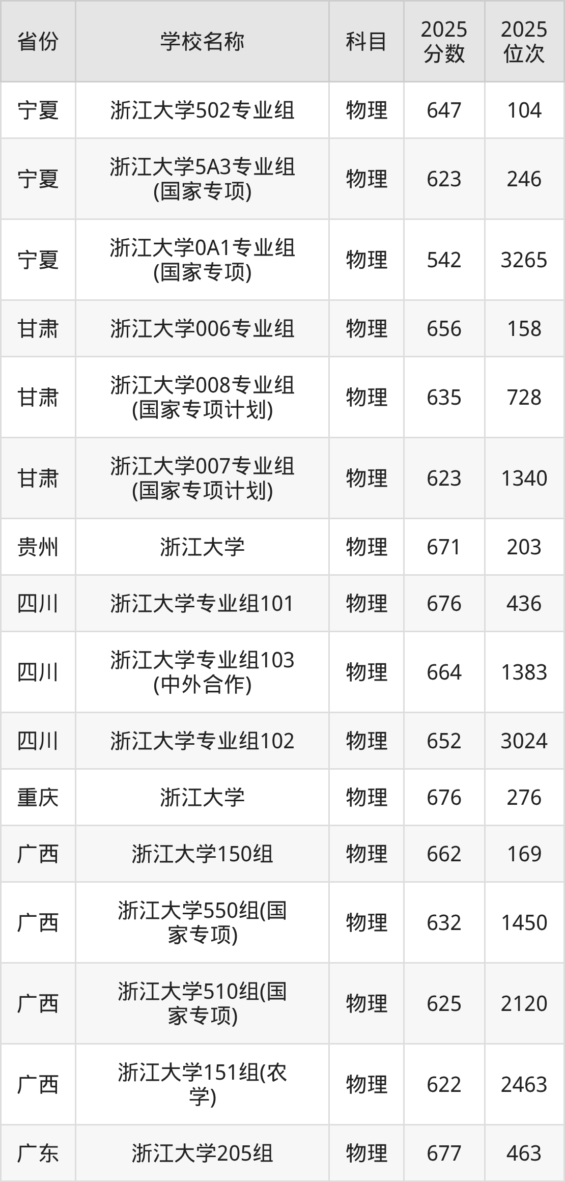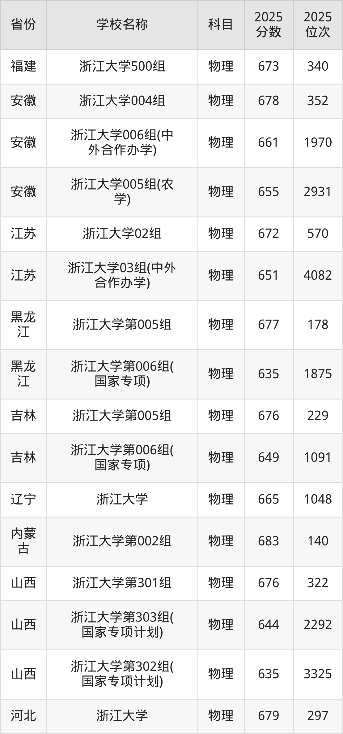 二、浙江大学各专业录取分数线