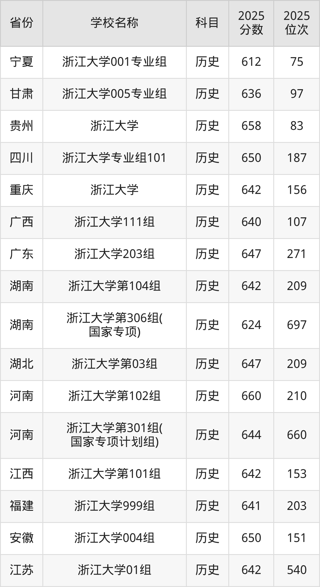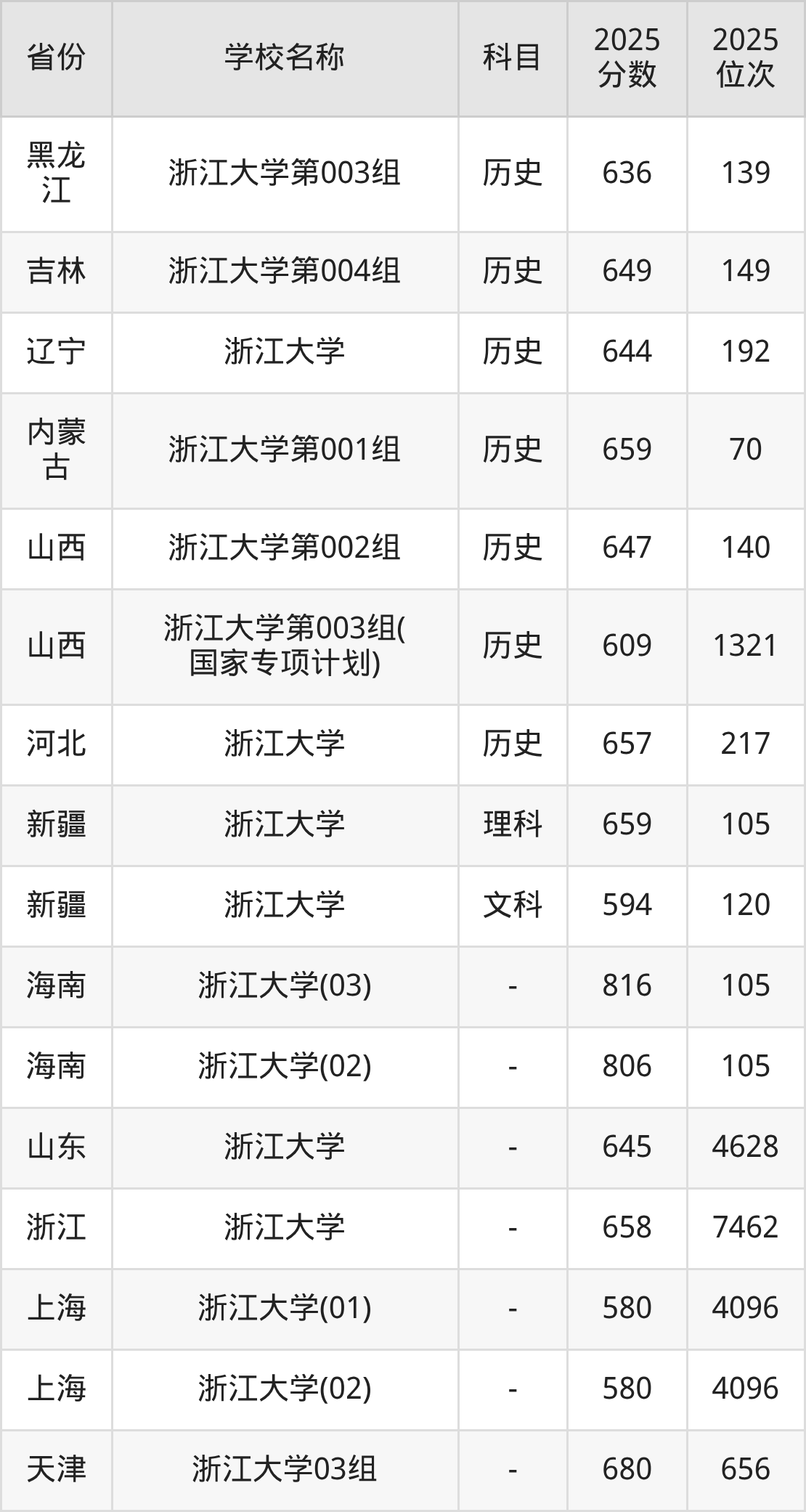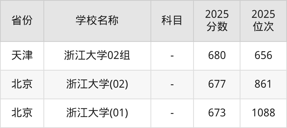 一、2025浙江大学录取分数线