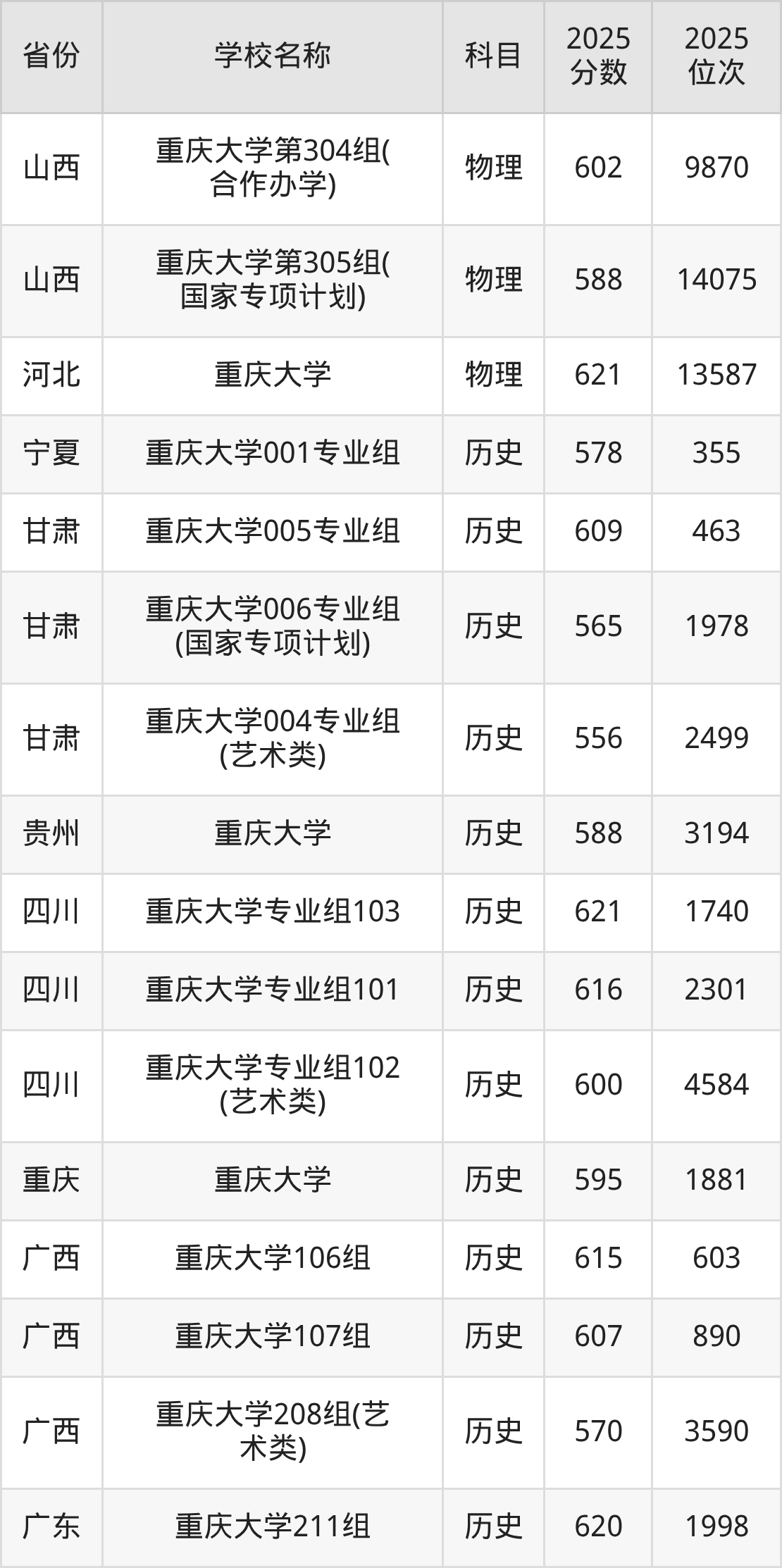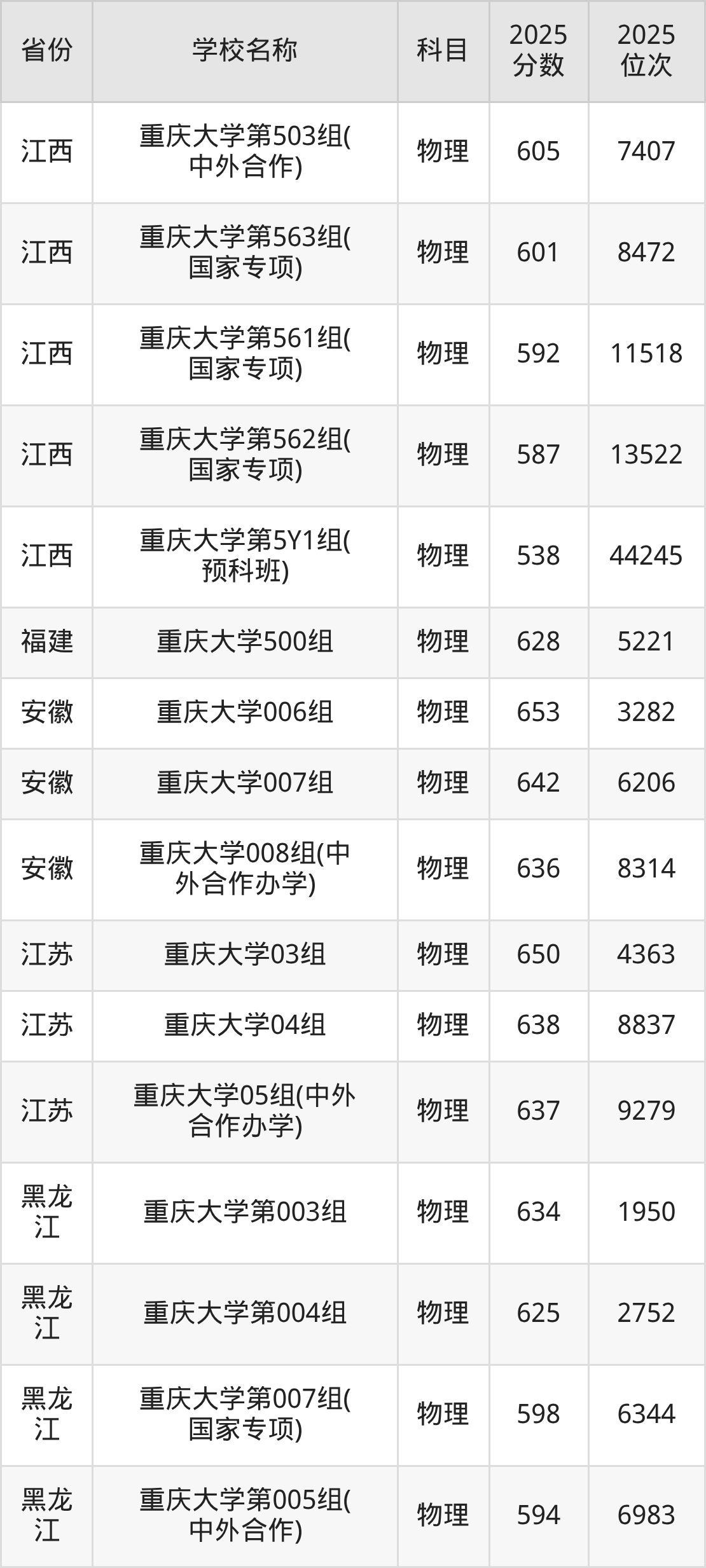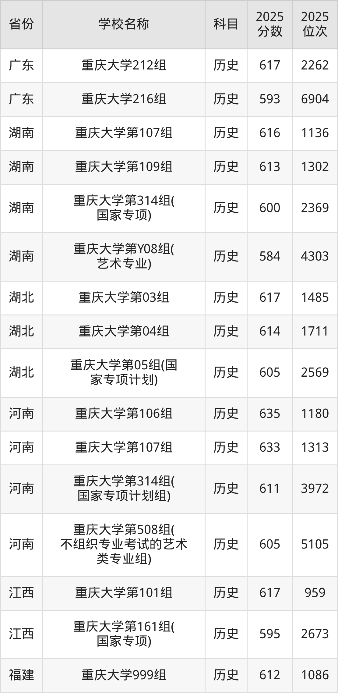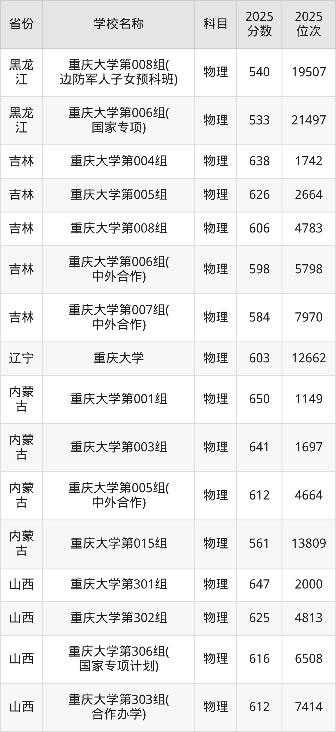 二、重庆大学各专业录取分数线