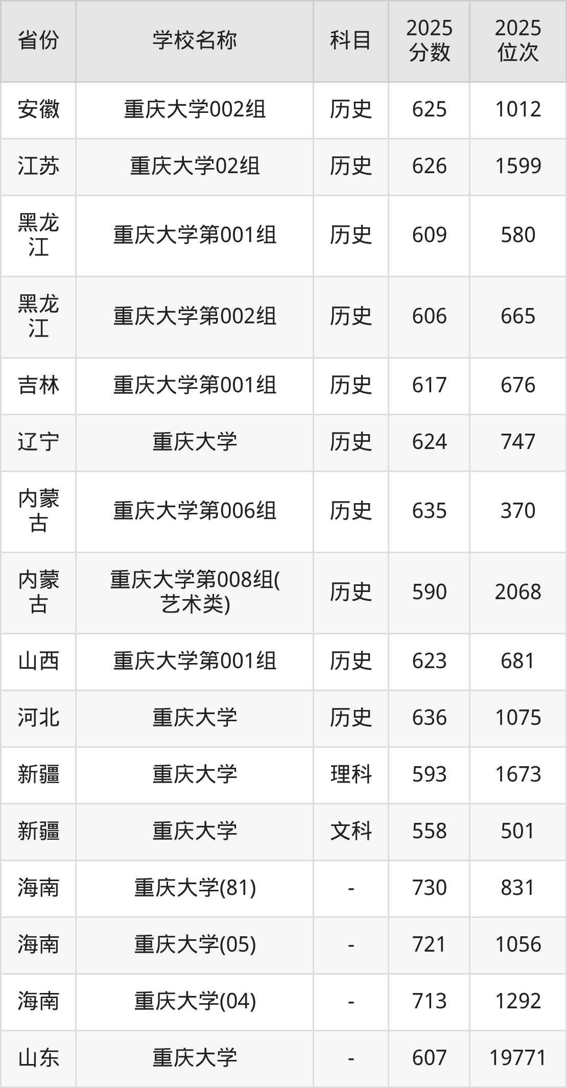 一、2025重庆大学录取分数线