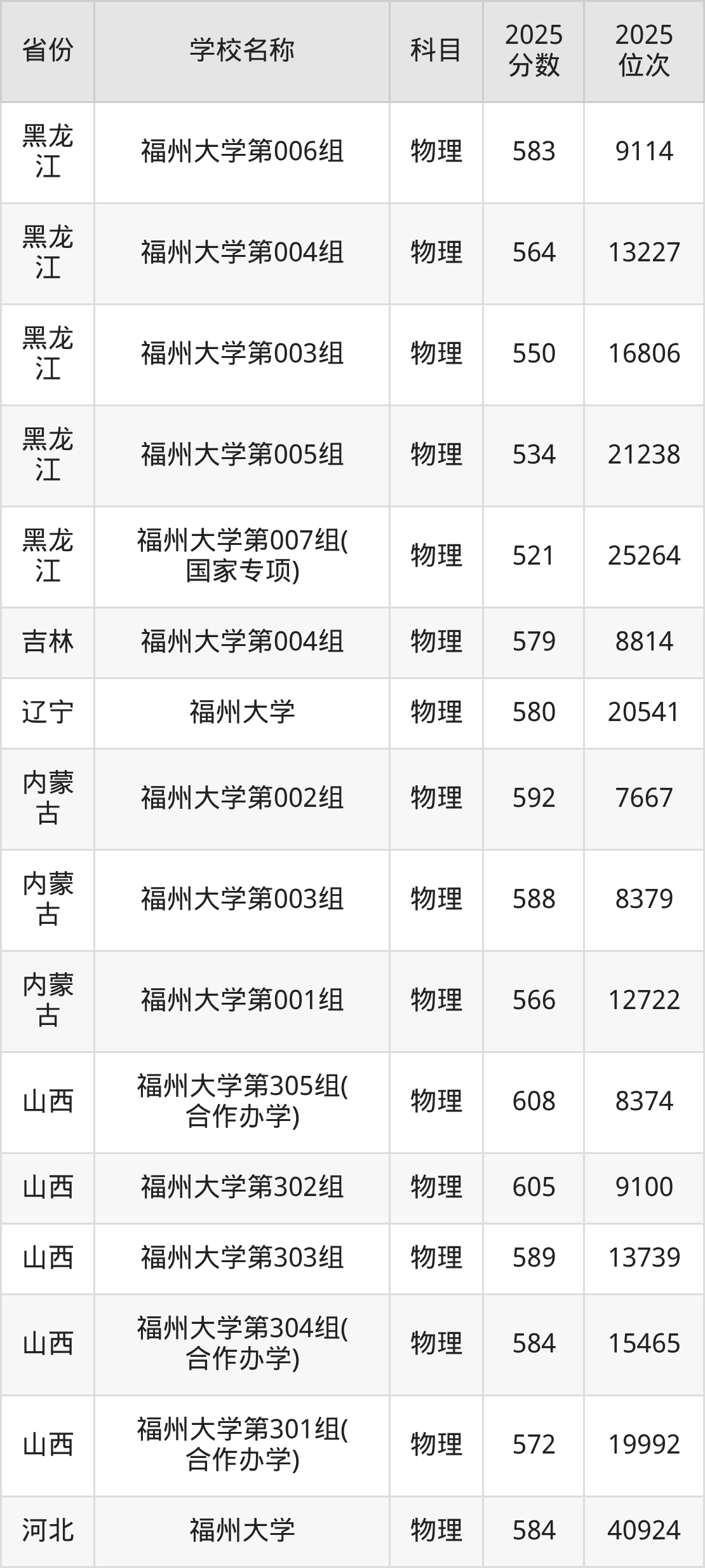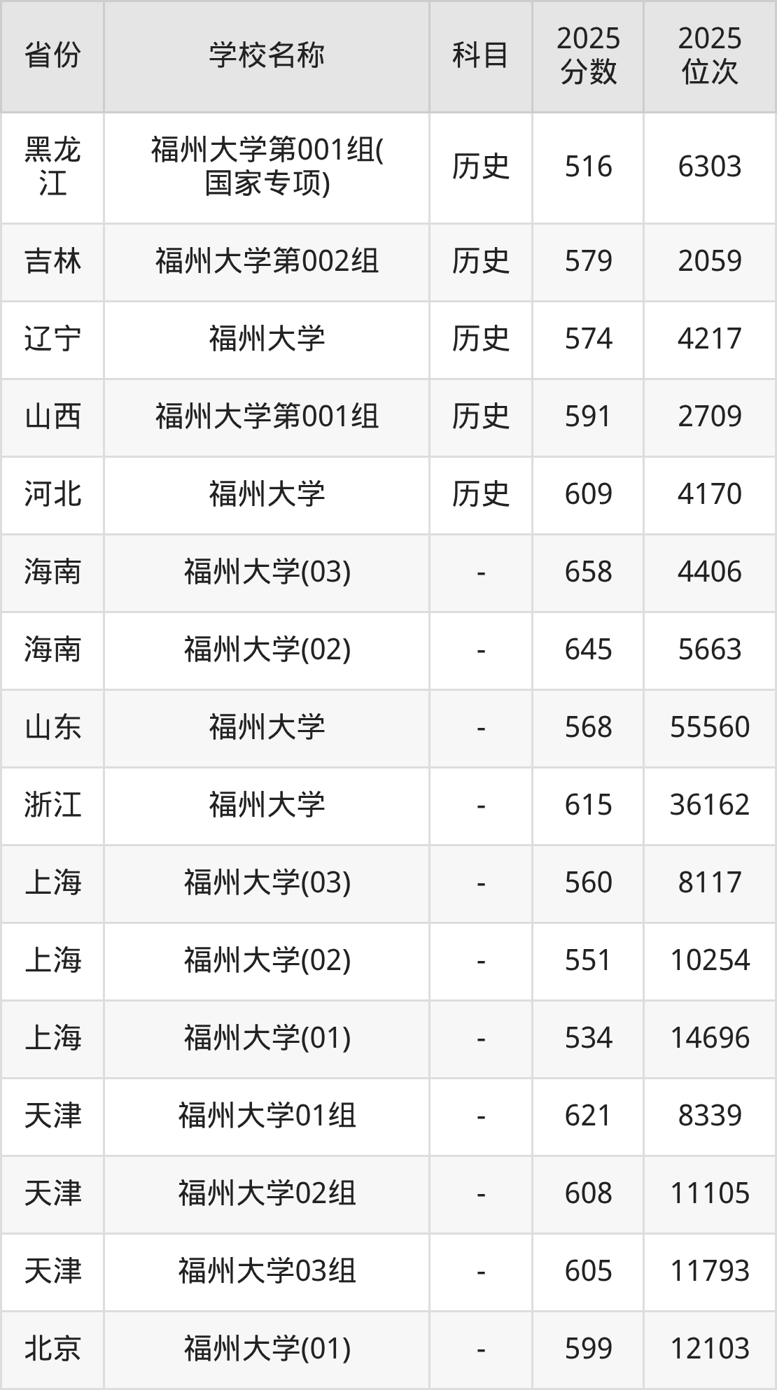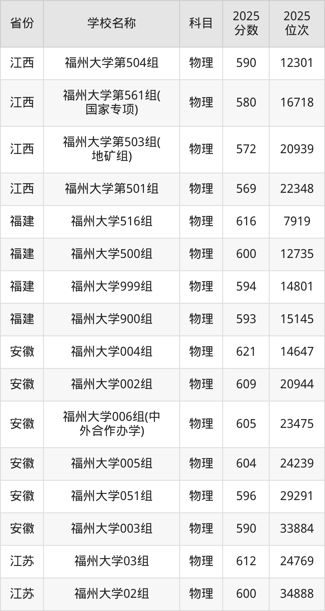 二、福州大学各专业录取分数线