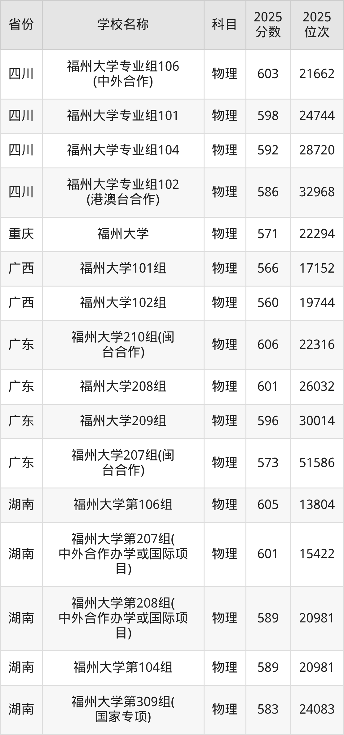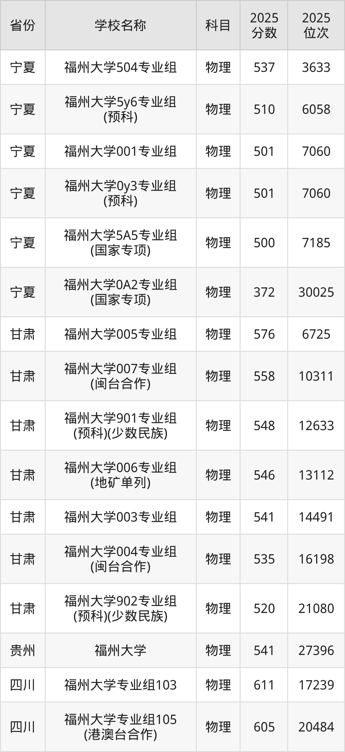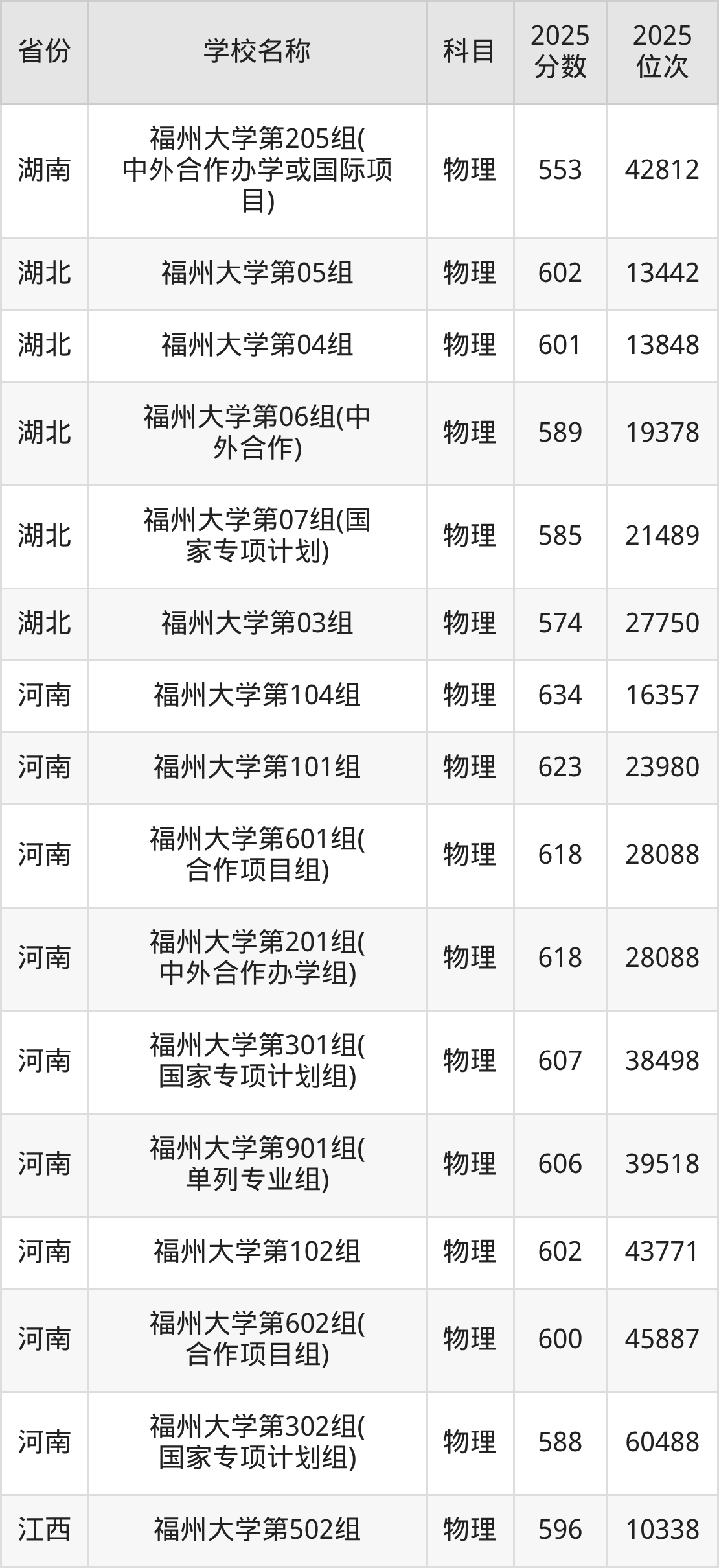 二、福州大学各专业录取分数线