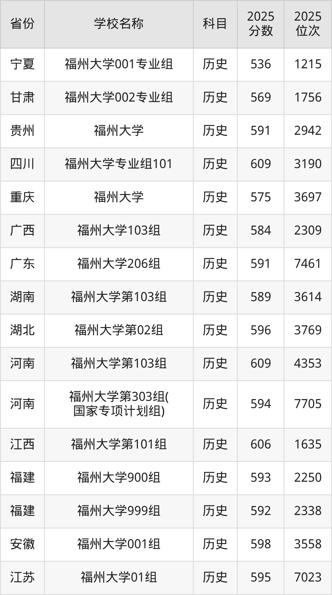 福州大学2025年有2个专业组面向福建省内首选了历史科目的考生招生:
