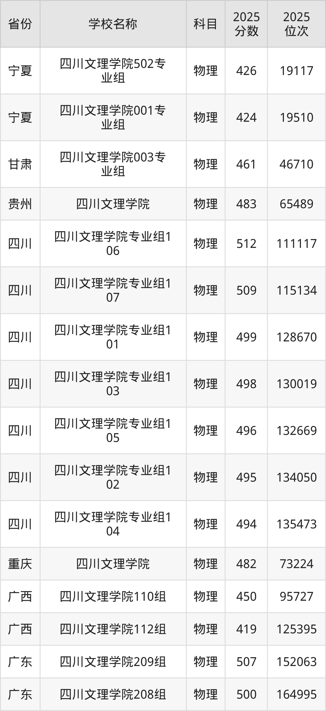 四川文理学院2025年有7个专业组面向四川省内首选了物理科目的考生招生: