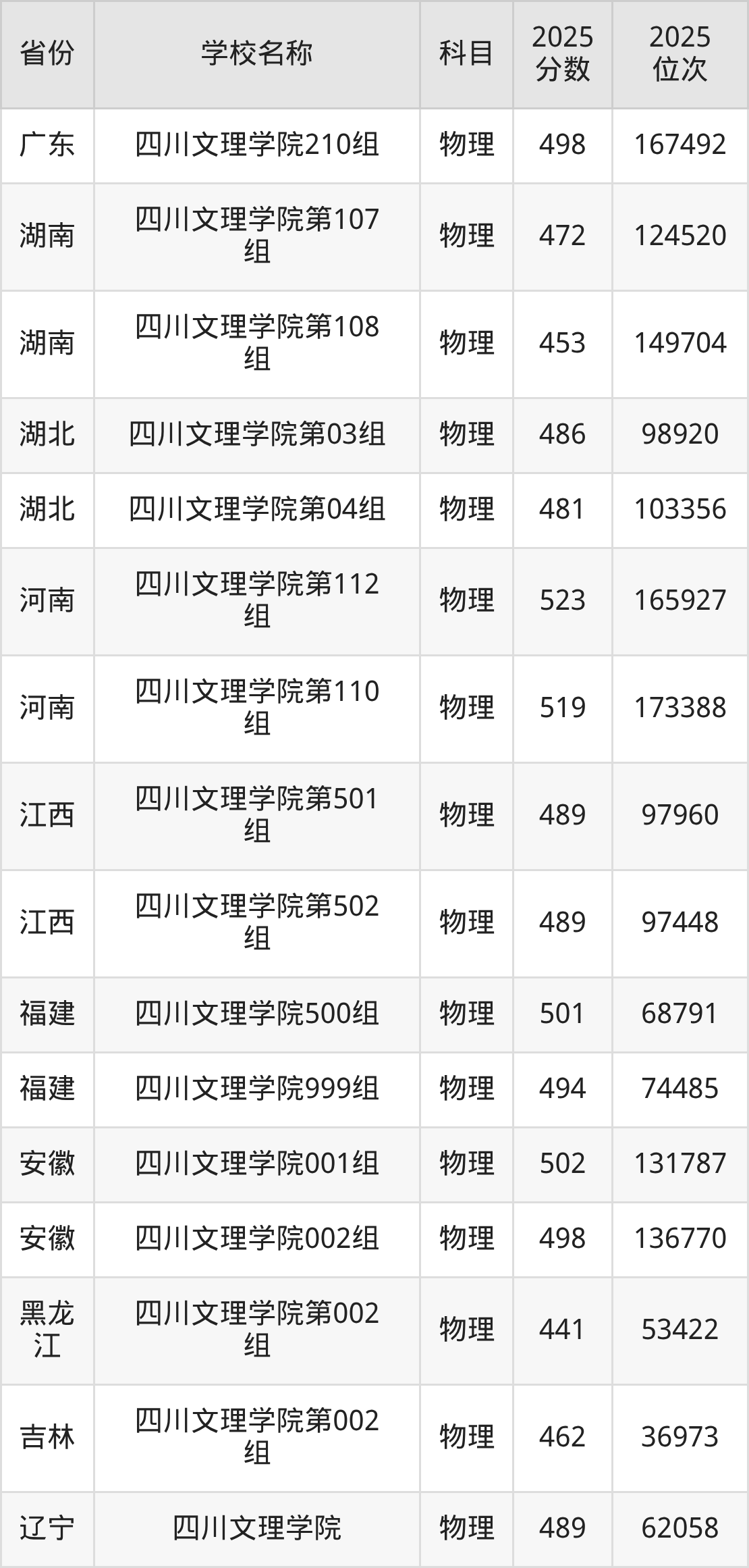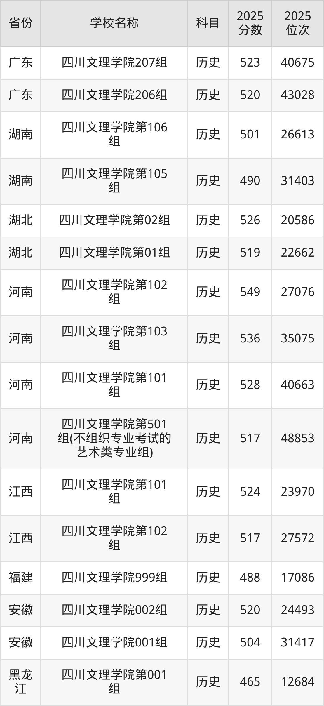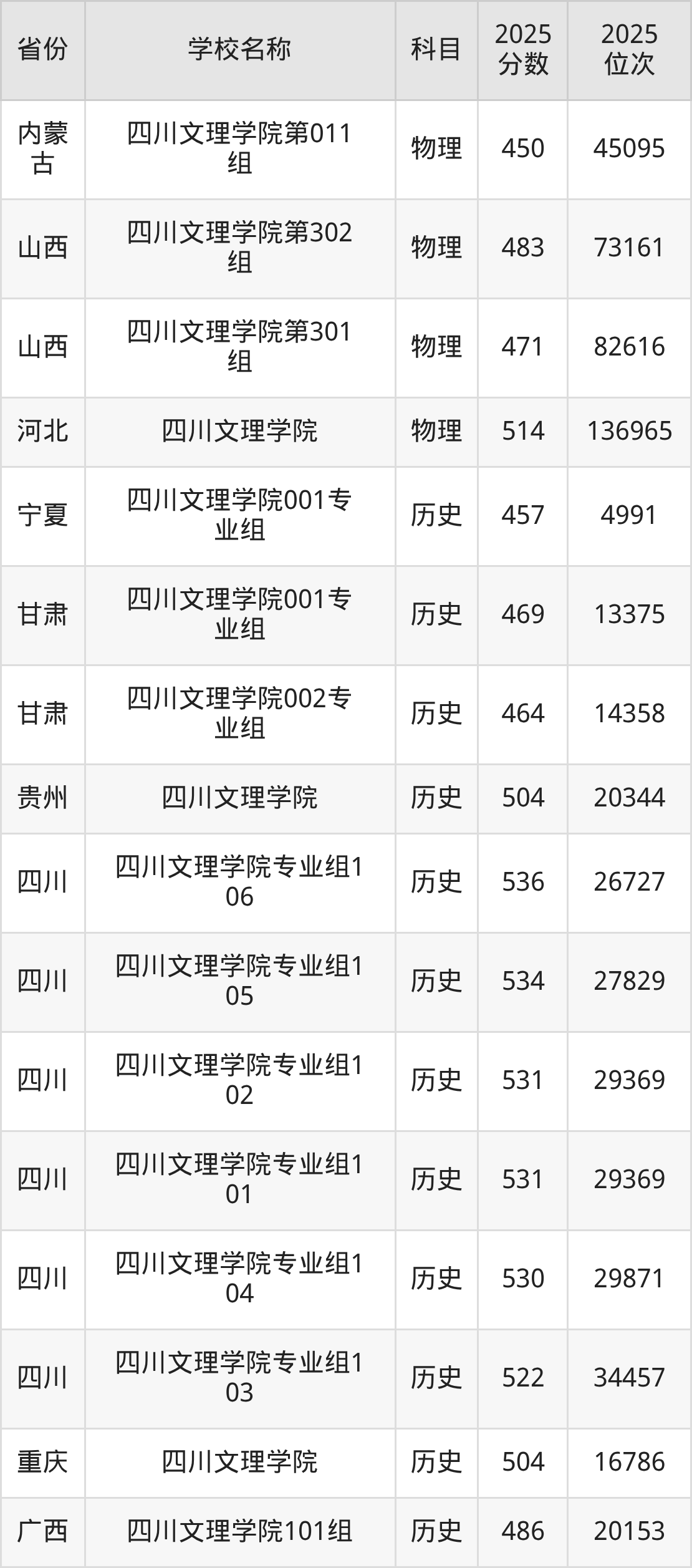 二、四川文理学院各专业录取分数线