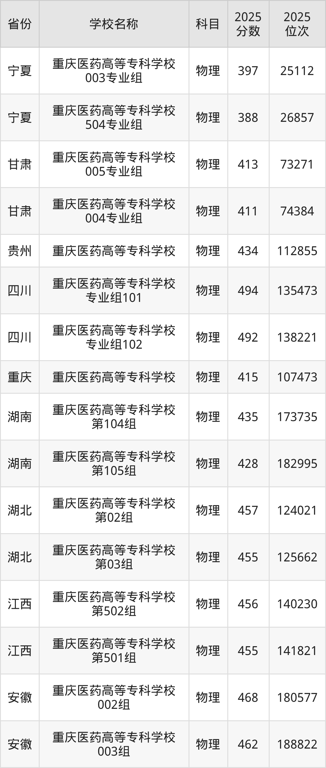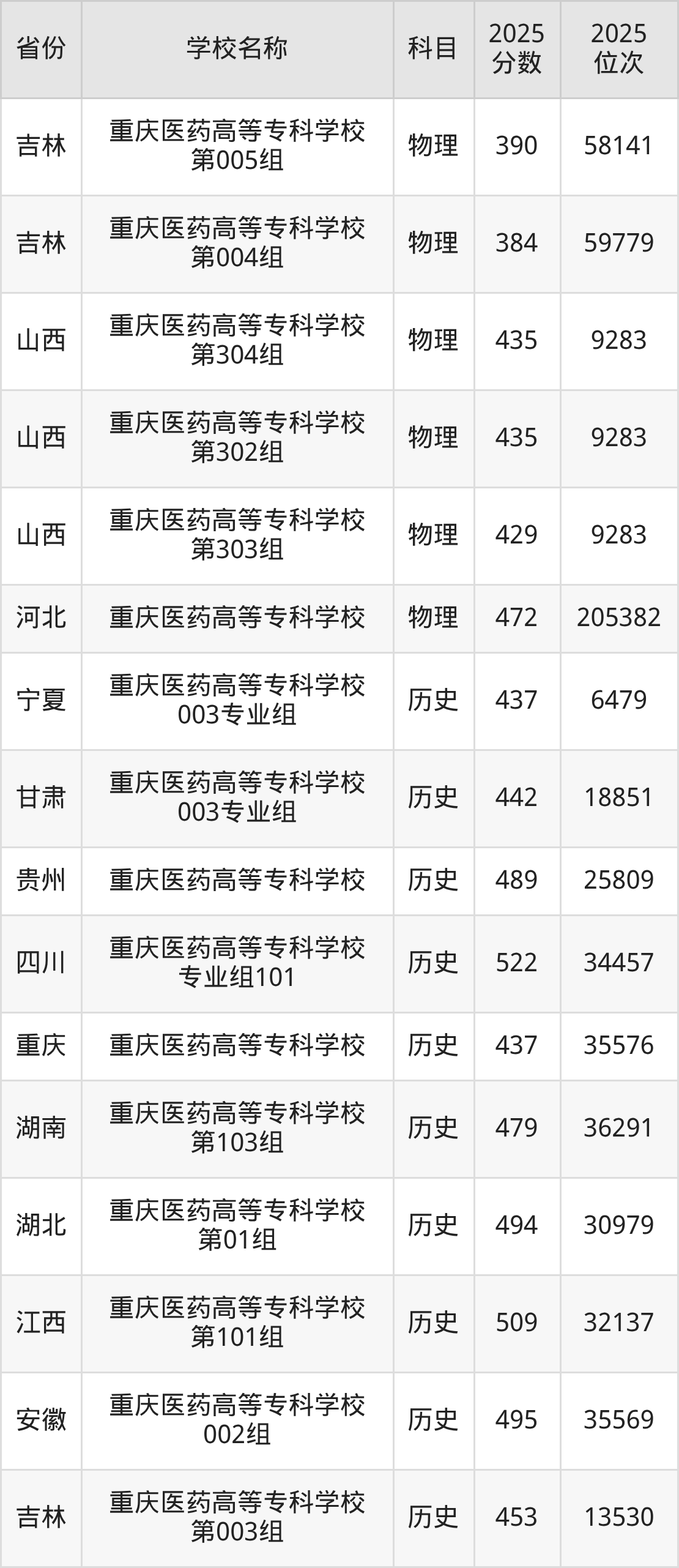 2025年重庆医药高等专科学校在全国各省专科的最低录取分数线在384~522分之间。四川物理类高考生最低494分能上重庆医药高等专科学校、河北物理类高考生最低472分能上重庆医药高等专科学校……下文将展示重庆医药高等专科学校在全国13个高考省份中的专科最低投档录取分汇总!