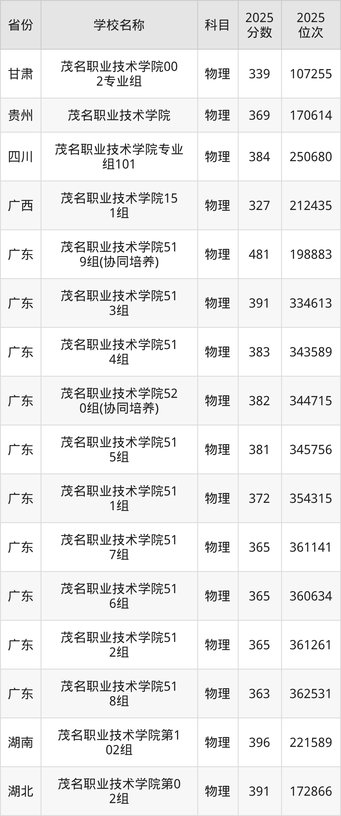 茂名职业技术学院2025年有10个专业组面向广东省内首选了物理科目的考生招生: