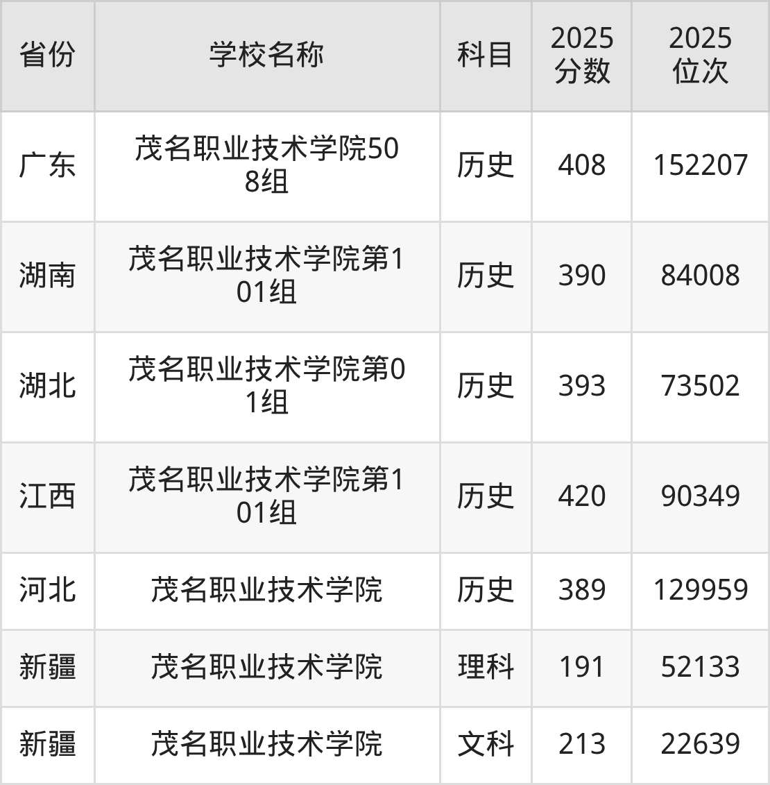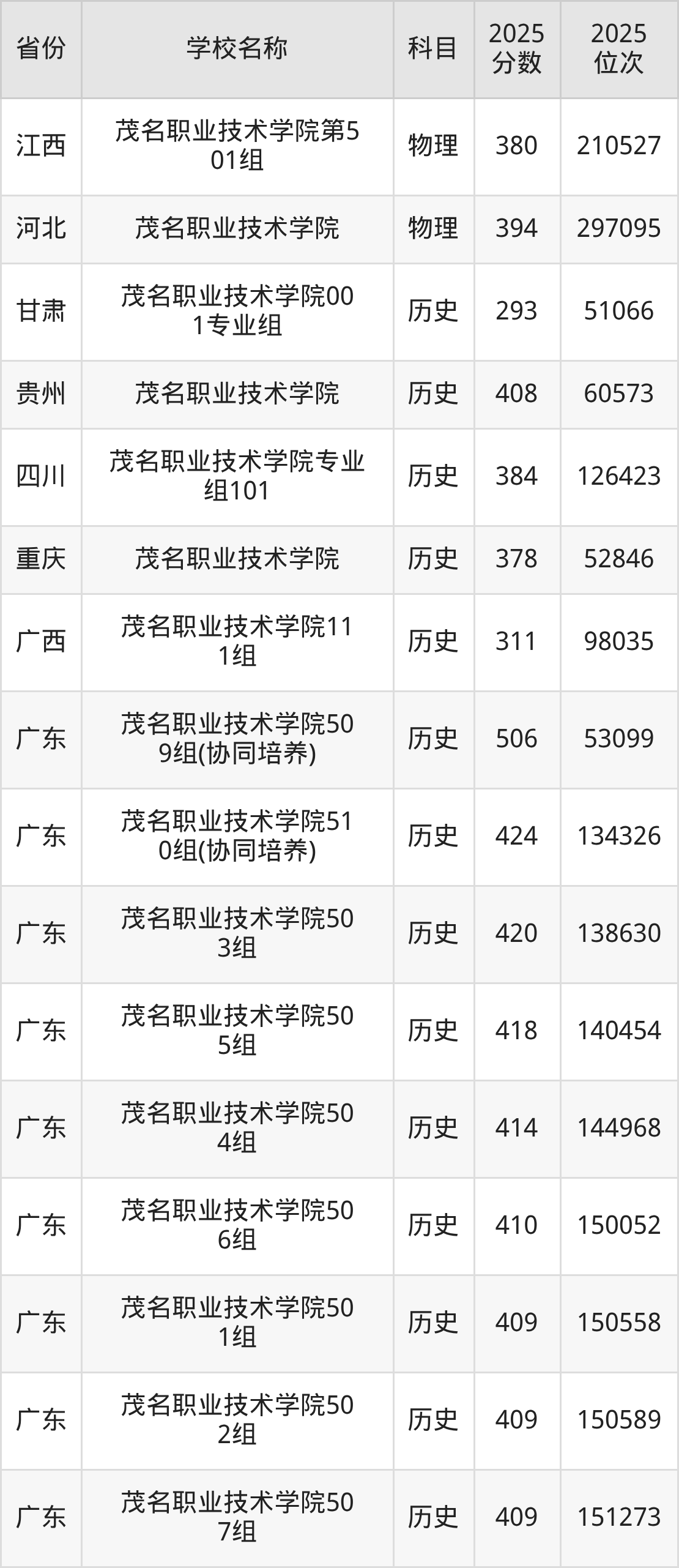 再看广东高考2025年专科批次线,历史类是215分、物理类是200分。通过对比发现:茂名职业技术学院2025年历史类最低分比专科线高193分,物理类最低分比专科线高163分。2026届广东高考生,可通过每一次模考划线,来判断自己的成绩是否有机会被茂名职业技术学院录取。