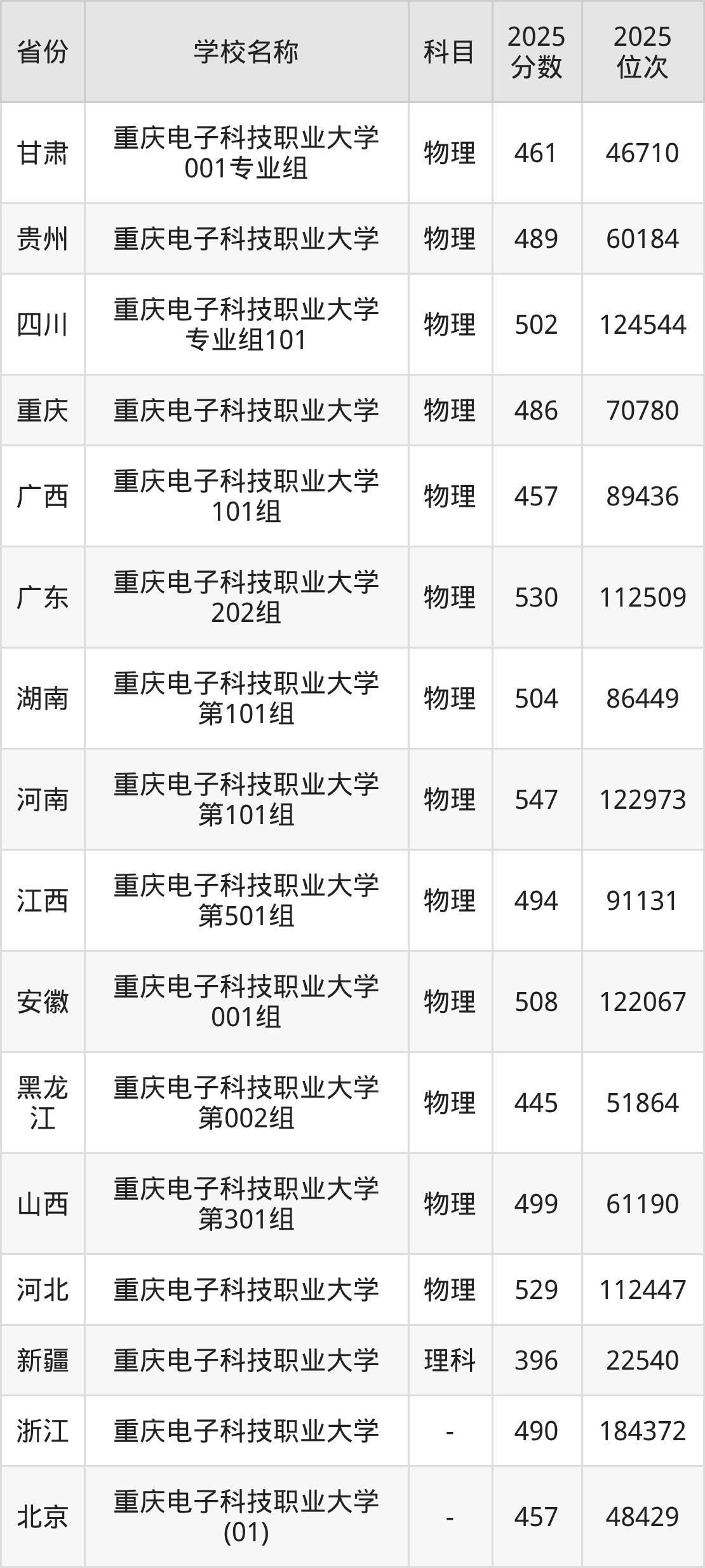 2025年重庆电子科技职业大学在全国各省本科的最低录取分数线在396~547分之间。河南物理类高考生最低547分能上重庆电子科技职业大学、广东物理类高考生最低530分能上重庆电子科技职业大学……下文将展示重庆电子科技职业大学在全国16个高考省份中的本科最低投档录取分汇总!