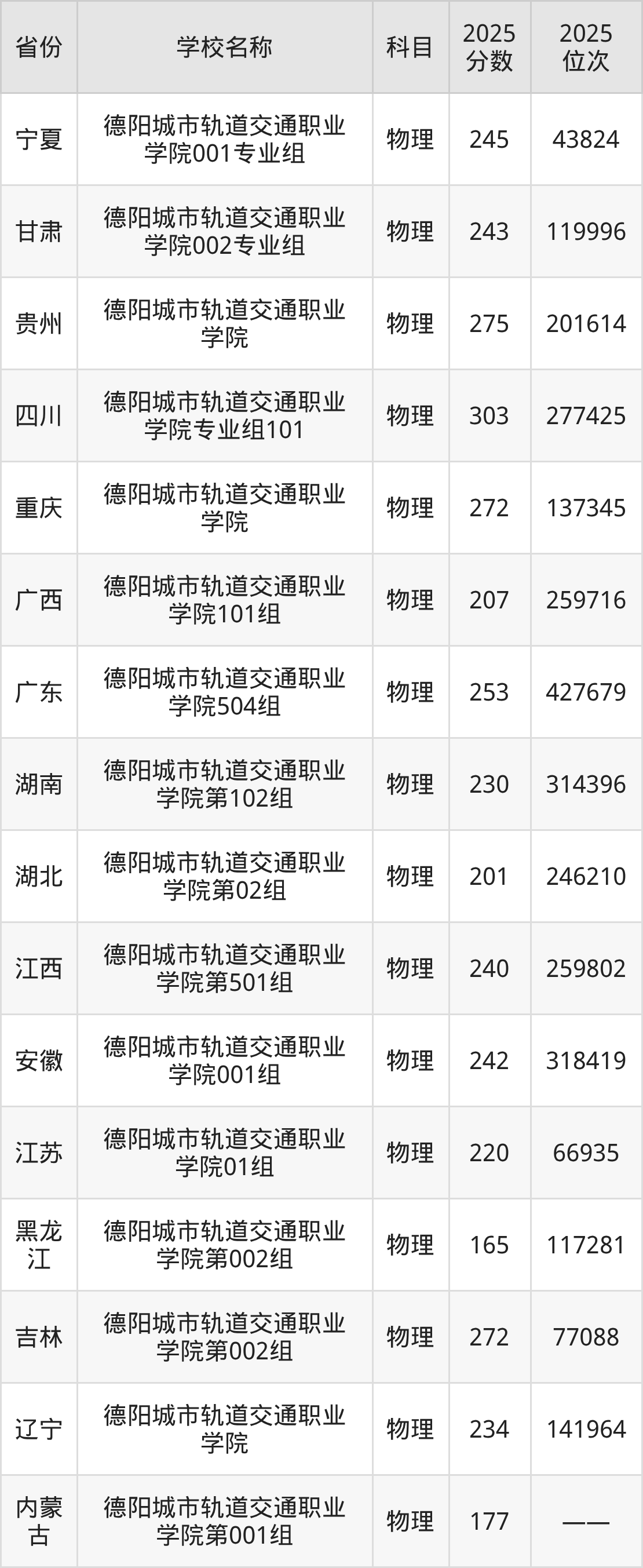 德阳城市轨道交通职业学院2025年有1个专业组面向四川省内首选了物理科目的考生招生: