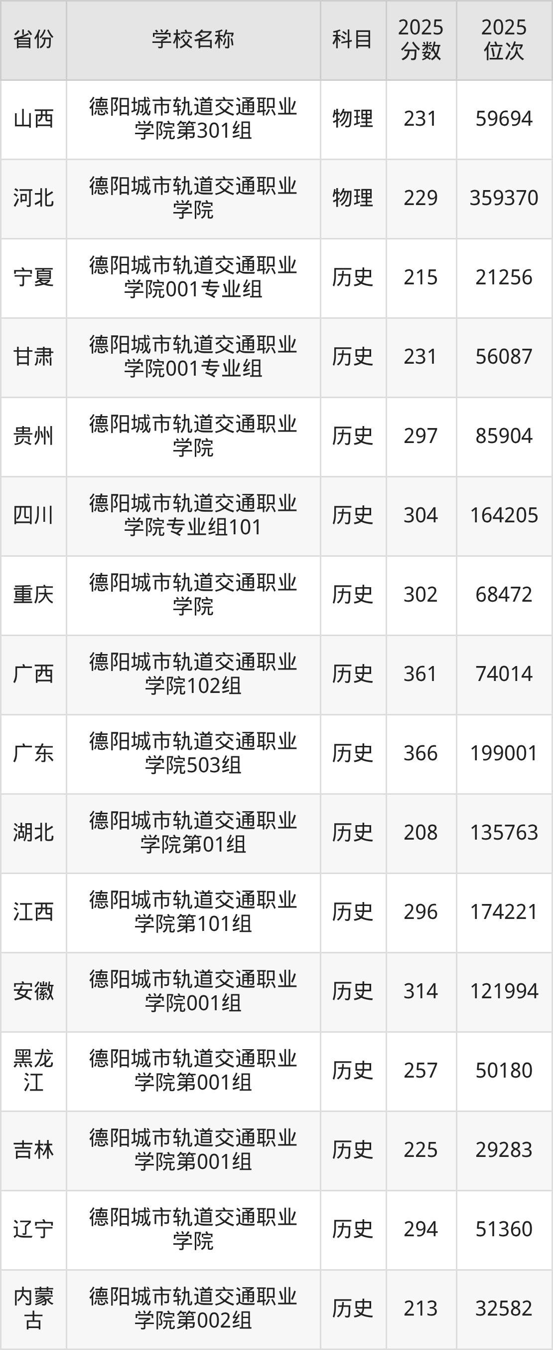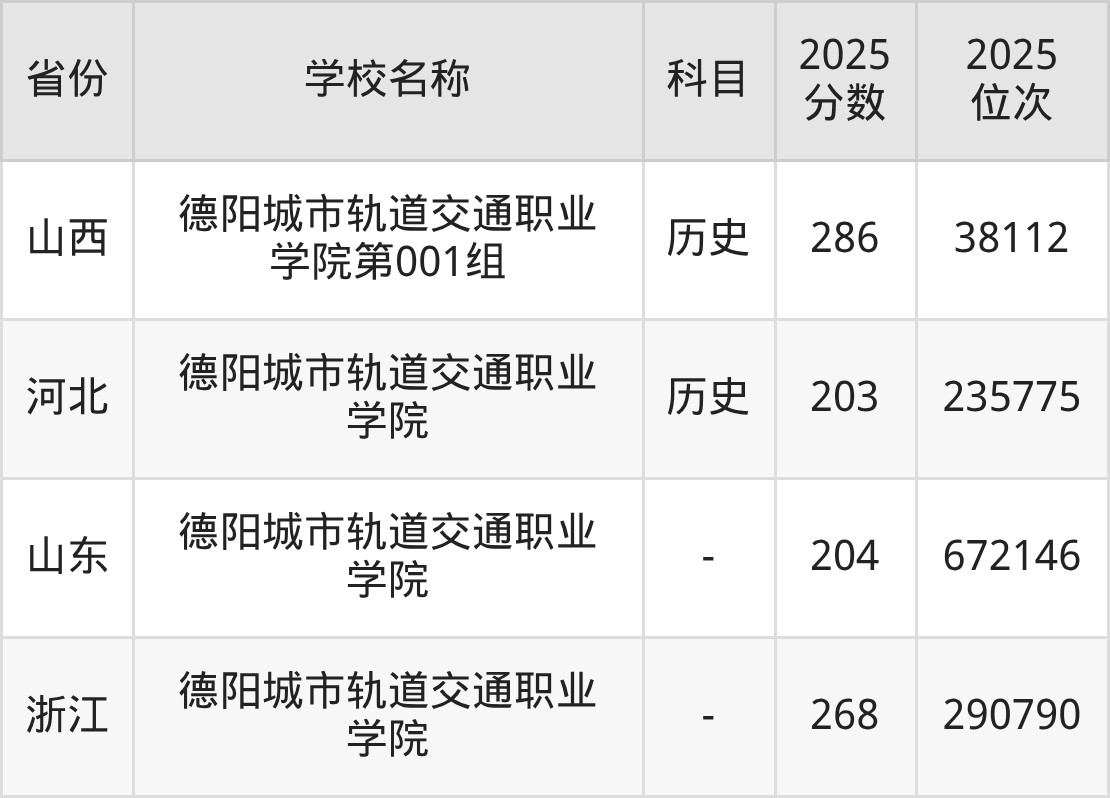 再看四川高考2025年专科批次线,历史类是150分、物理类是150分。通过对比发现:德阳城市轨道交通职业学院2025年历史类最低分比专科线高154分,物理类最低分比专科线高153分。2026届四川高考生,可通过每一次模考划线,来判断自己的成绩是否有机会被德阳城市轨道交通职业学院录取。