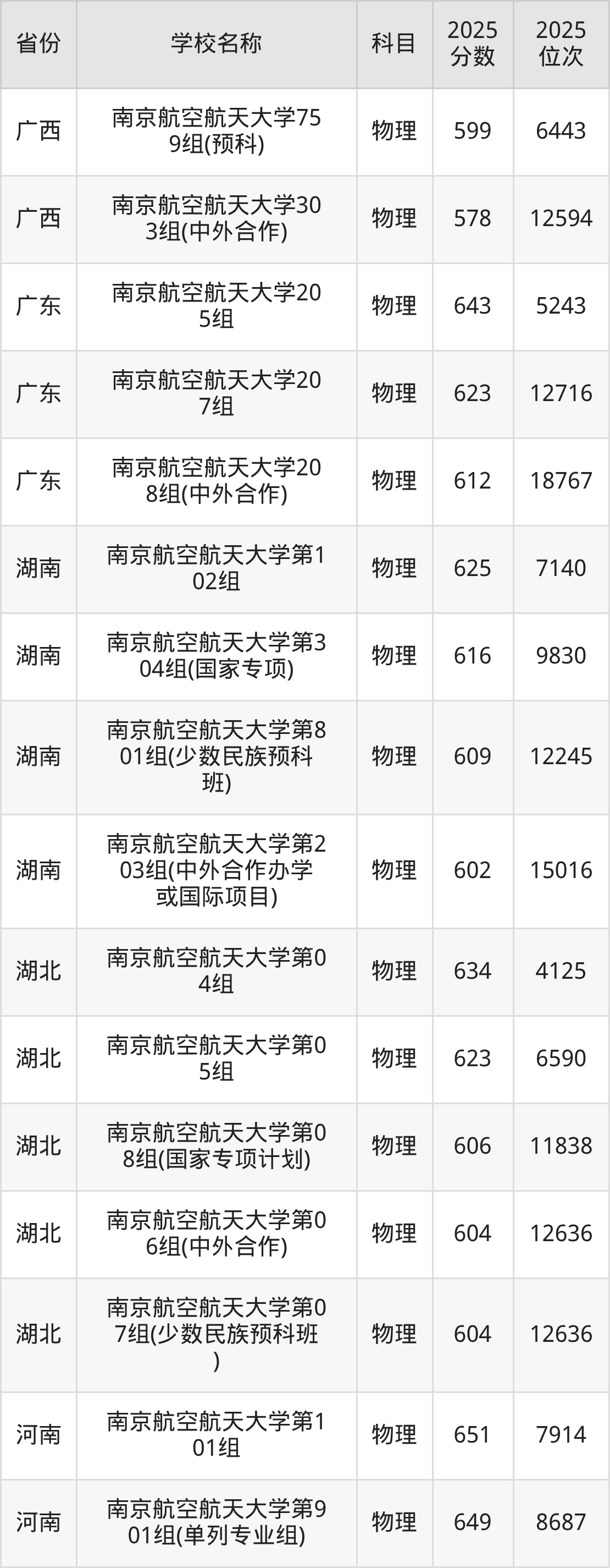 10、航空航天类专业:2025年最低645分、最低位次是5634